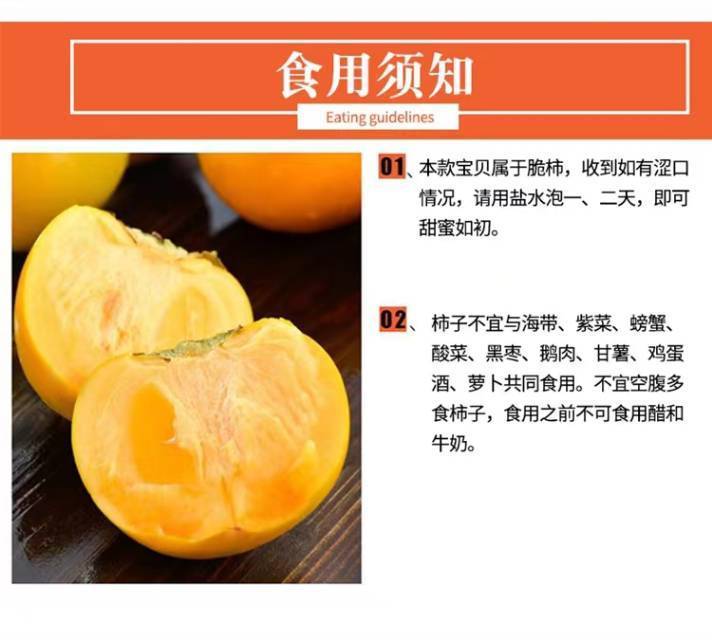 【品名】广西恭城脆柿 【规格】5斤 (净重4.5斤,单果100-130克) 【产地/发货地】广西 【包装】纸箱 【发货快递】 普快随机 【温馨提示】吃完脆柿不能喝牛奶、螃蟹一起食用,脆柿子虽然富含营养,但是再喜欢再好吃都必须要适度! 【售后标准】 1、生鲜一旦发货不接受退货!杜绝拦截、拒收。 2、签收后第一时间验货。坏果售后需要提供晰的坏果面和快递面单一起的照片。若对斤两质疑请在未开箱前称重。 3、坏果,烂果按照比例赔付。 4、生鲜类不支持7天无理由退换货服务,因保质期短,如有损坏请在签收后的24小时内拍照联系客服处理,超过24小时不予处理。 5、因买家收货地址不详,有误,电话联系不上等,造成送货导致商品腐烂变质额,不予赔偿. 6、个头大,个数少,个头小,个数多,甜度,软硬因不同阶段和个人味蕾差异,不做理赔依据。 7、因个人原因保存不当,放置时间过长造成的损坏,不在赔付范围! 8、生鲜水果在运输过程中存在水分流失,所以每件净重有±200g波动属于正常情况,不予售后。 9、下单不接受备注!团购讲的是效率和统一,不做特殊要求的订单,介意慎拍。 |