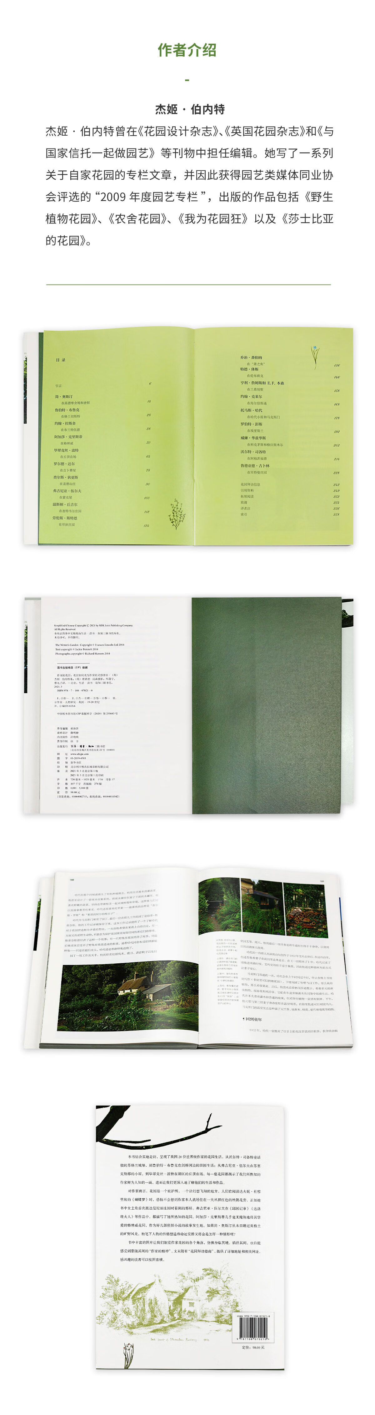杰姬·伯内特(Jackie Bennett):曾在《花园设计杂志》(The Garden Design Journal)、《英国花园杂志》(The Garden Design Journal)和《与国家信托一起做园艺》(Gardening with the National Trust)等刊物中担任编辑。制作过关于园艺和自然历史类的电视节目,后成为全职作家。她写了一系列关于自家花园的专栏文章,并因此获得园艺类媒体同业协会评选的“2009年度园艺专栏”。出版的作品包括《野生植物花园》(The Wildlife Garden Month by Month)、《农舍花园》(The Cottage Garden)、《我为花园狂》(Wild About the Garden)以及《莎士比亚的花园》(Shakespeare’s Gardens)。