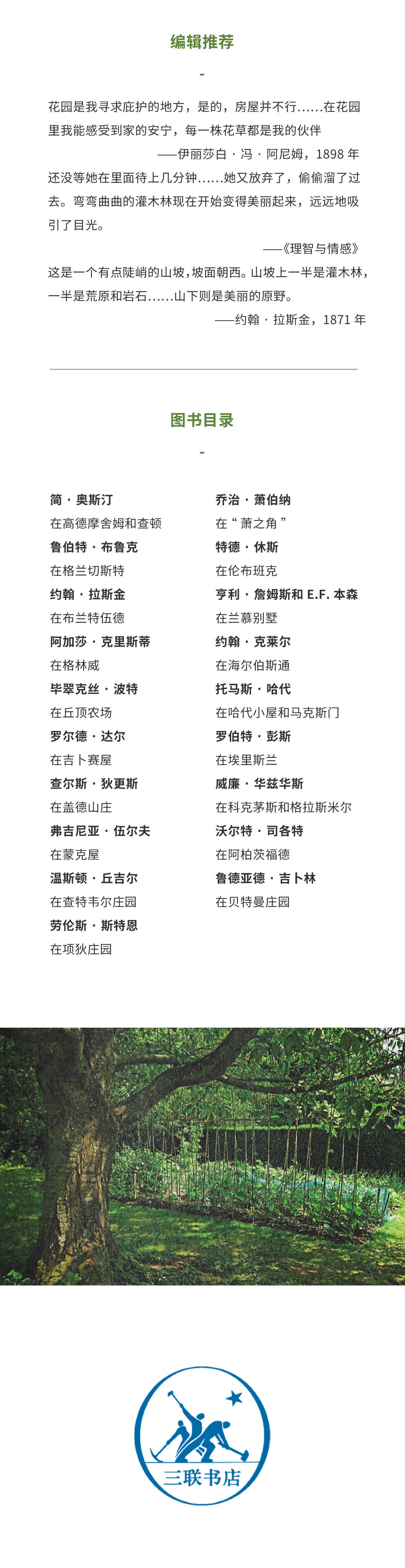 翻开这本书不仅可以沉浸于无尽的精神花园,也能感知到一座真实花园带来的乐趣;那些几个世纪前的花草果实现在都还在,那些作家的花园如今基本都能拜访到,它们是那么遥远,又是那么真实——我很荣幸能够翻译其中的一部分。