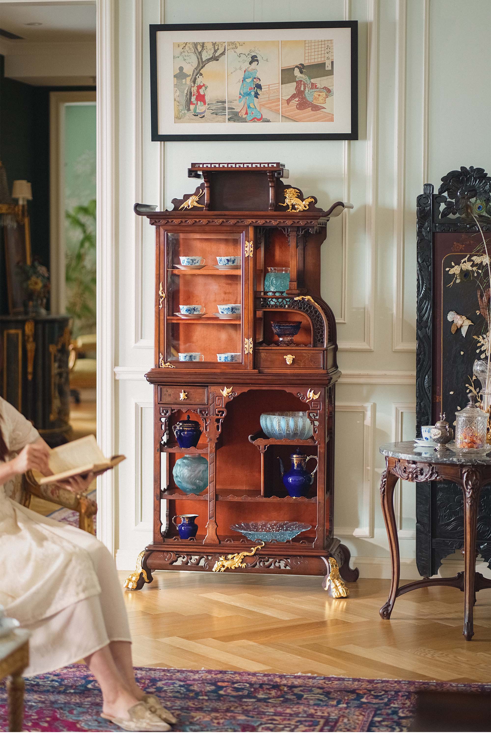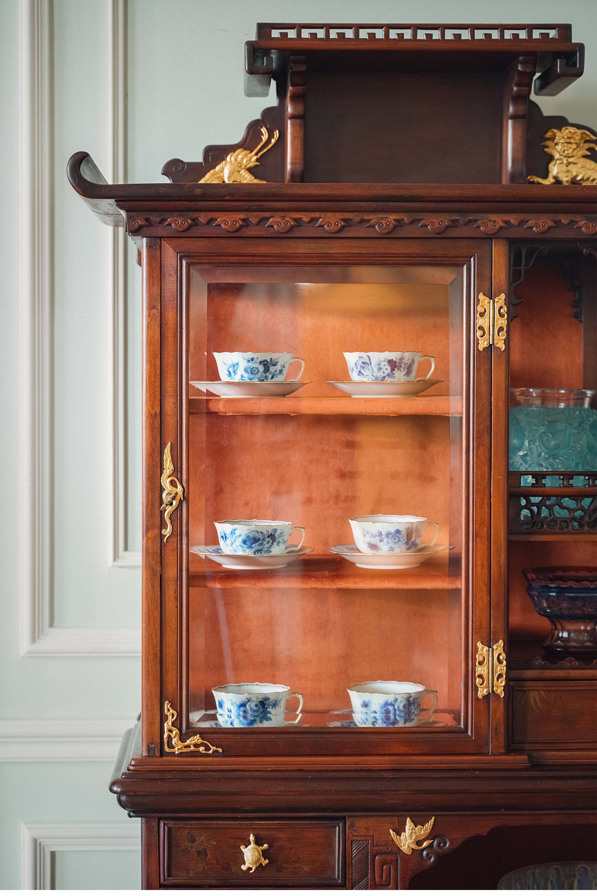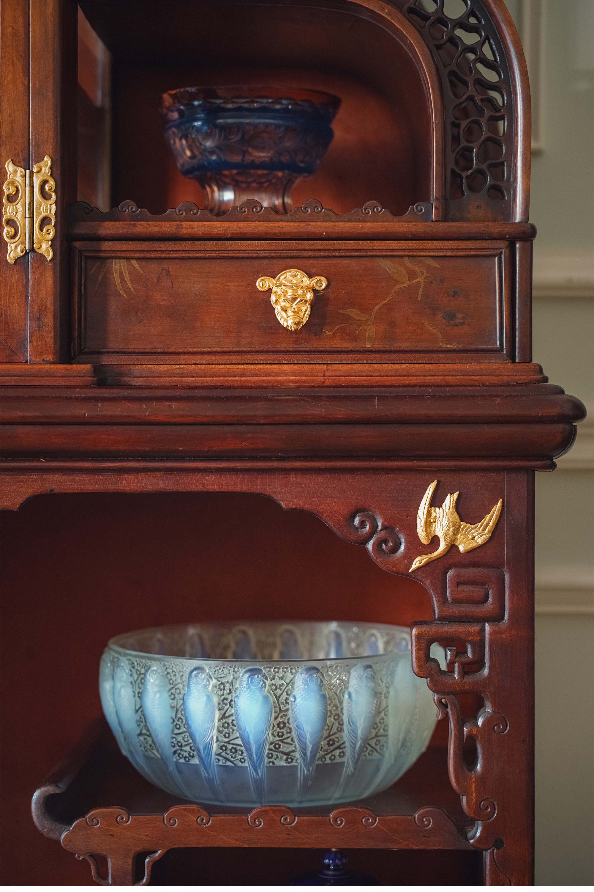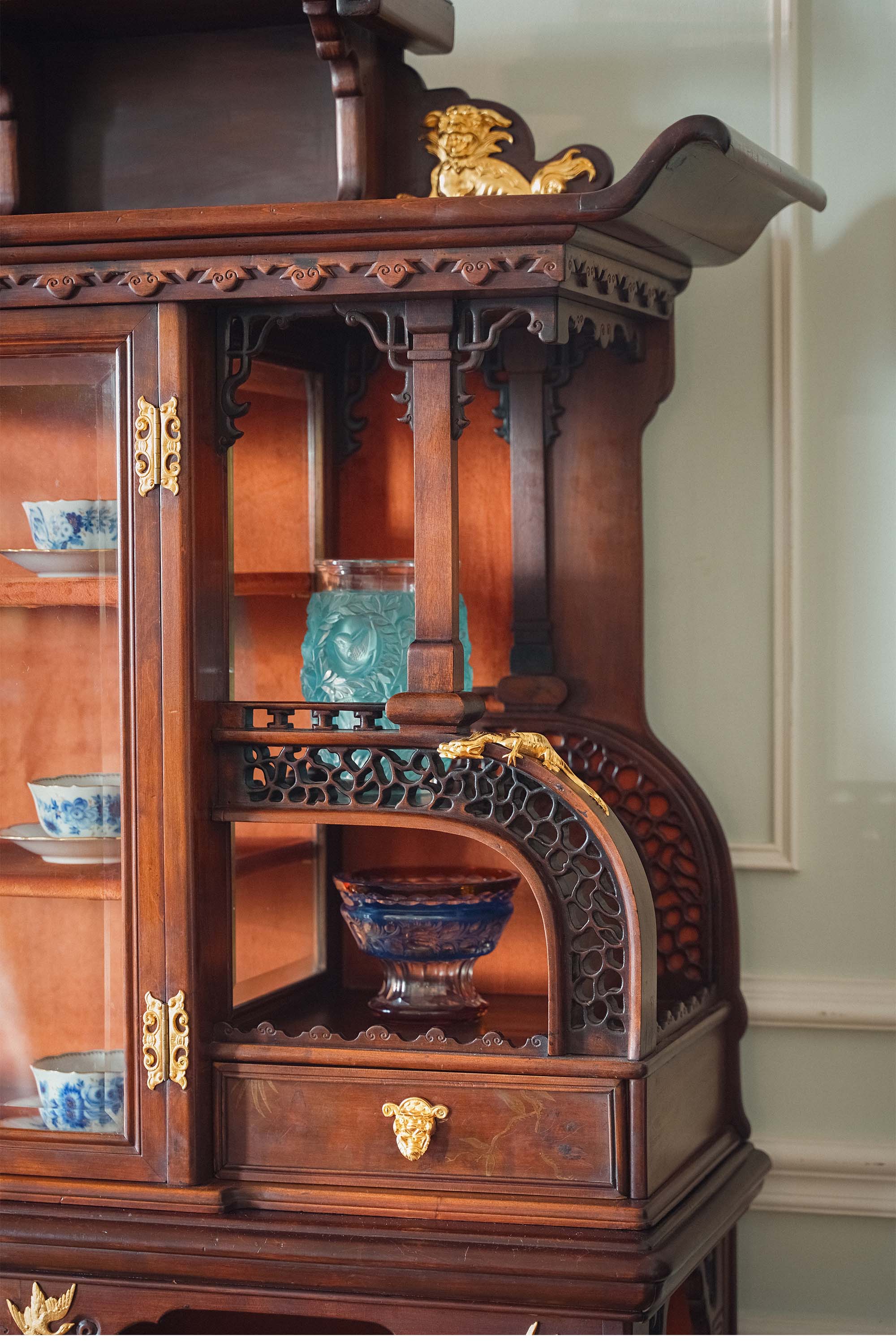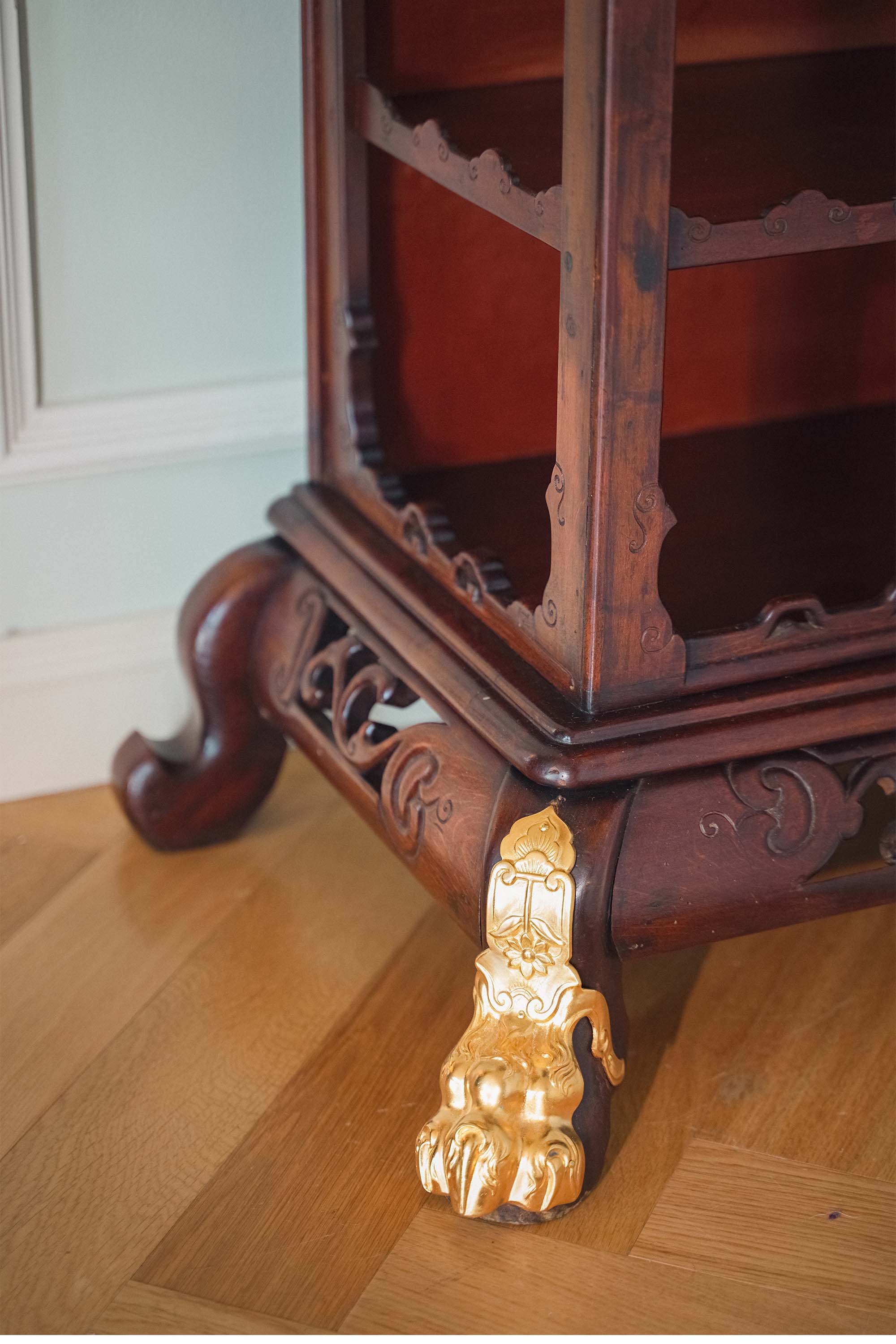 19世纪末法国出品VIARDOT东方风格瑞兽主题铜鎏金精雕装饰卷叶回纹梧桐木精雕多宝阁式展柜