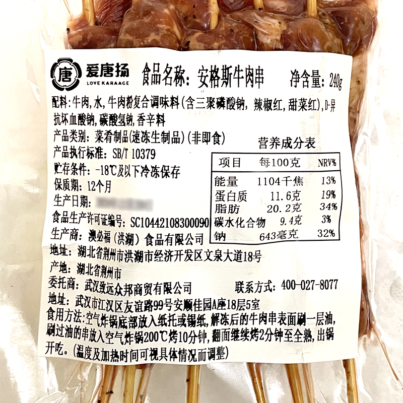 爱唐扬安格斯牛肉串240g商用批发烧烤半成品食材空气炸锅烤肉串(顺丰发货)
