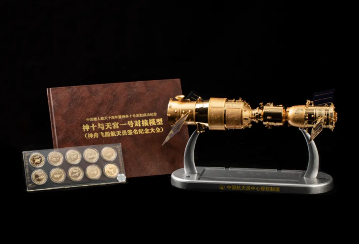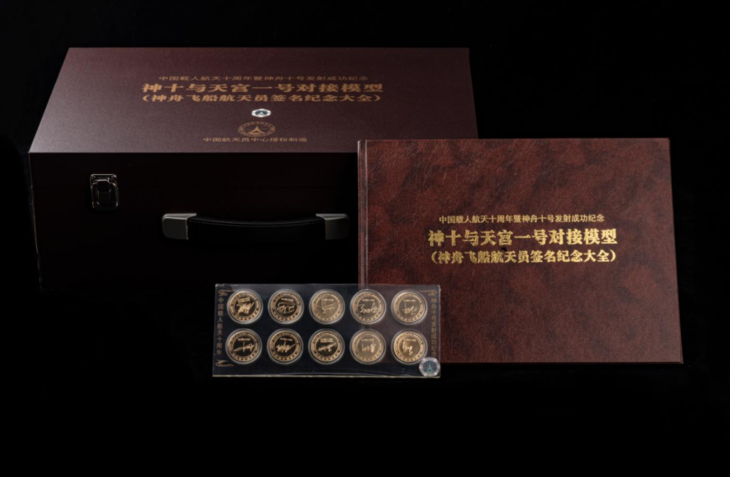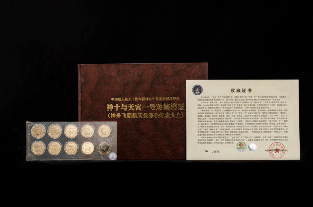 从2003年“神舟五号”载人飞船首次将航天员送上太空到2013年“神舟十号”,中国载人航天历经十年光辉历程。为纪念中国载人航天十周年暨“神舟十号”发射这一伟大历史时刻,中国航天员中心(全称:中国航天员科研训练中心)特别授权发行了“神十与天宫一号对接模型”(神舟飞船航天员签名纪念大全)。