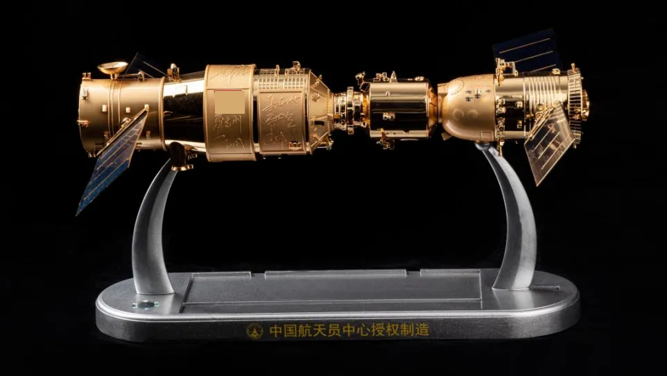 模型主体镌刻杨利伟、费俊龙、聂海胜、翟志刚、刘伯明、景海鹏、刘旺、刘洋、张晓光、王亚平等十名航天员亲笔签名。十次“神舟”飞天,十年载人航天,十名航天员圆满完成飞行任务,为中国航天事业做出了突出贡献,他们是民族的英雄。将这些重大航天事件直接参与者、见证人亲笔签名永久镌刻在“中国第一个目标飞行器和空间实验室”(即“天宫一号”)模型上,意义非凡。