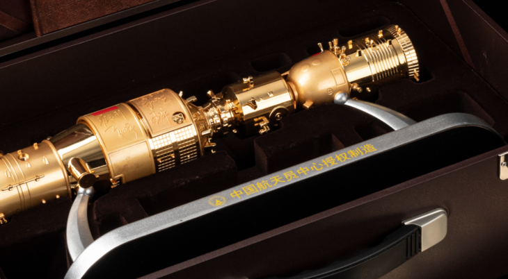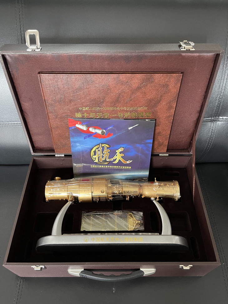 “神舟十号”与“天宫一号”对接模型比例为1:50,采用航天专用材质,镀999纯金,整体具有非凡质感,模型经百道工序精密铸造,能生动反映“神舟十号”与“天宫一号”对接与分离过程。