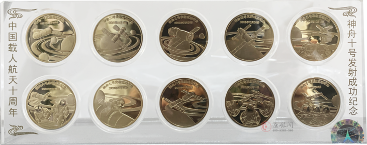 10枚镀999纯金航天纪念章镶嵌于模型底座,纪念章展架左右两侧分别撰写“中国载人航天十周年”及“神舟十号发射成功纪念”字样。纪念章记录了中国航天从无人飞行到载人成功的光荣历程:正面主体为“神舟一号”飞船到“神舟十号”飞船发射时间、标志性图案及发射成功纪念字样;背面主体为十名航天员亲笔签名、所乘飞船名称及“中国航天员中心”字样。模型底座上有藏品名称、“中国航天员中心授权制 字样及标识。