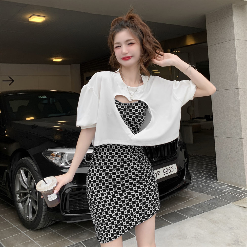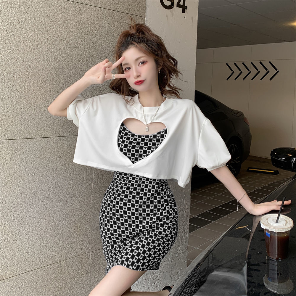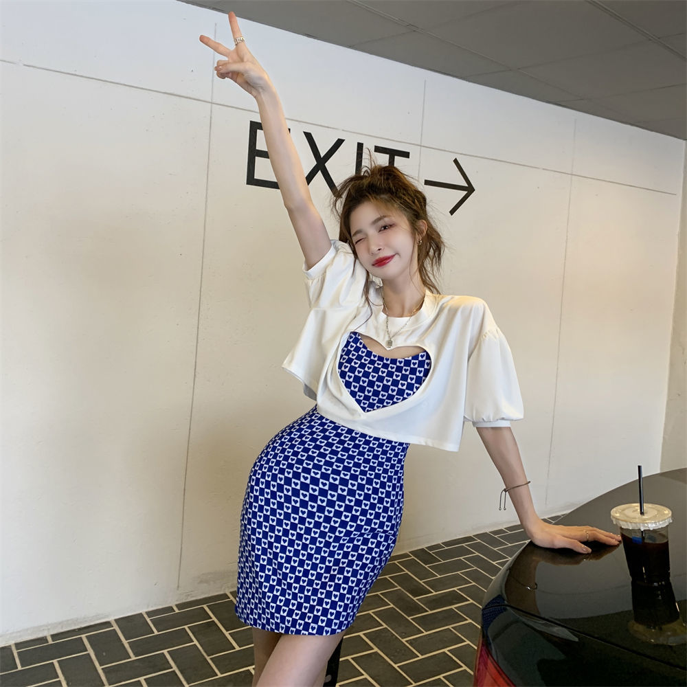 黛唯梵辣妹包臀吊带连衣裙女春夏韩版2022新款设计感爱心格子修身打底裙国庆清明出游