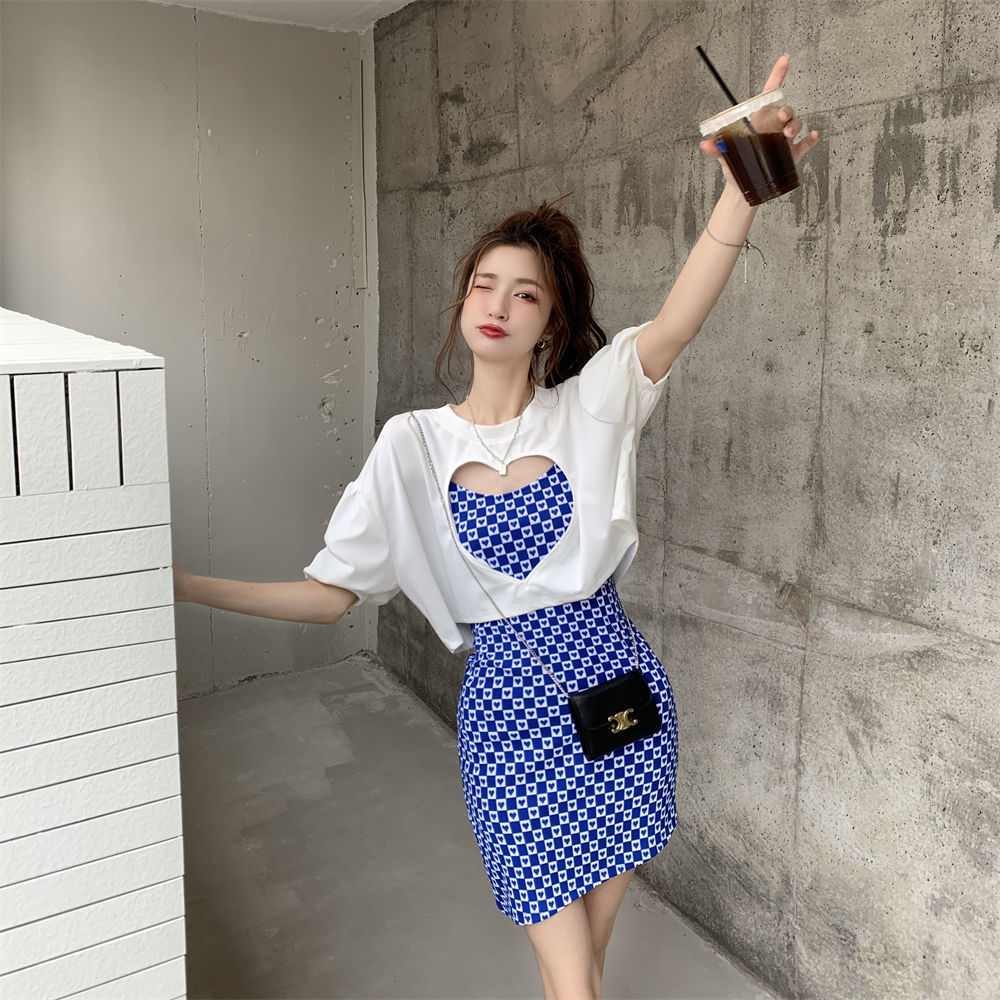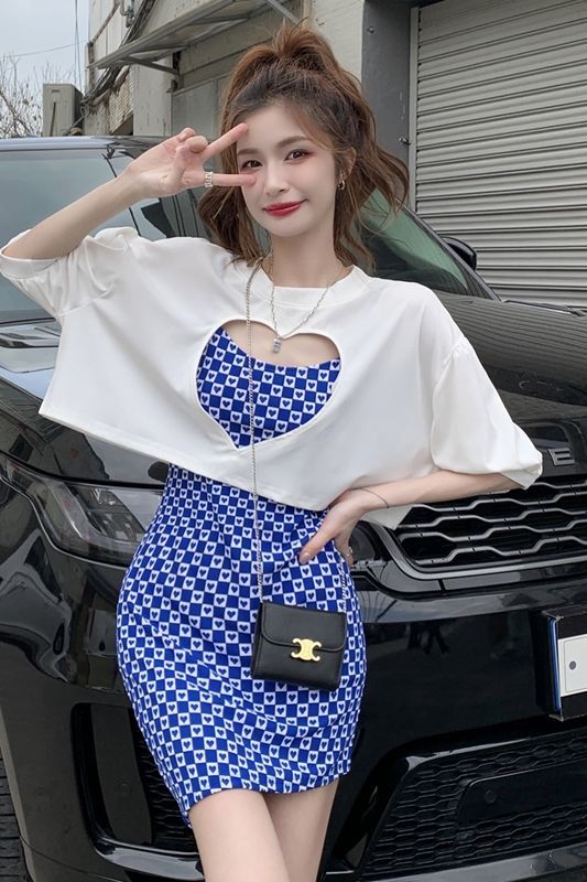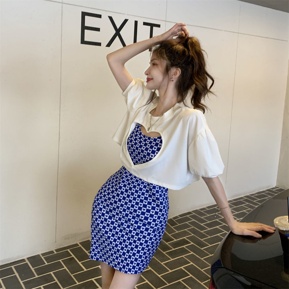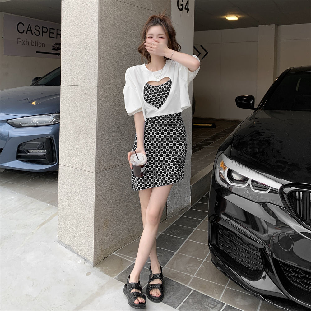 黛唯梵辣妹包臀吊带连衣裙女春夏韩版2022新款设计感爱心格子修身打底裙国庆清明出游