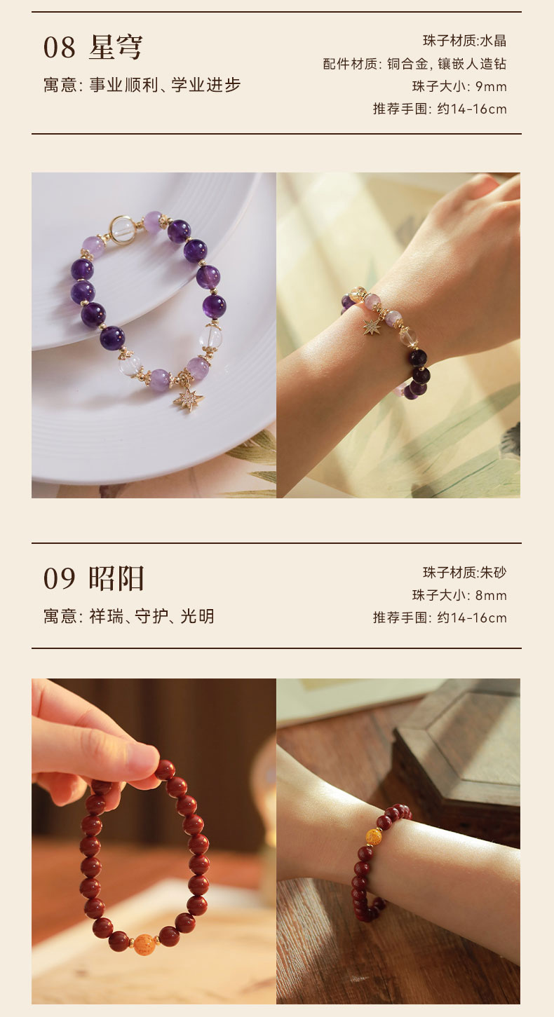 2.手串选用天然材质,可能存在一些冰裂、棉絮、矿坑、共生纹路,并非质量问题,而是自然的印记,敬请包容~