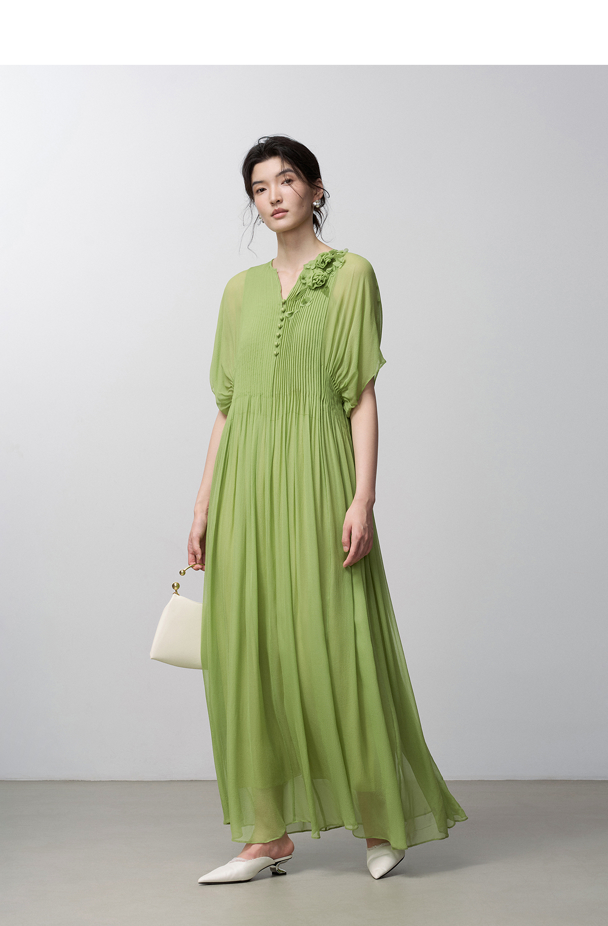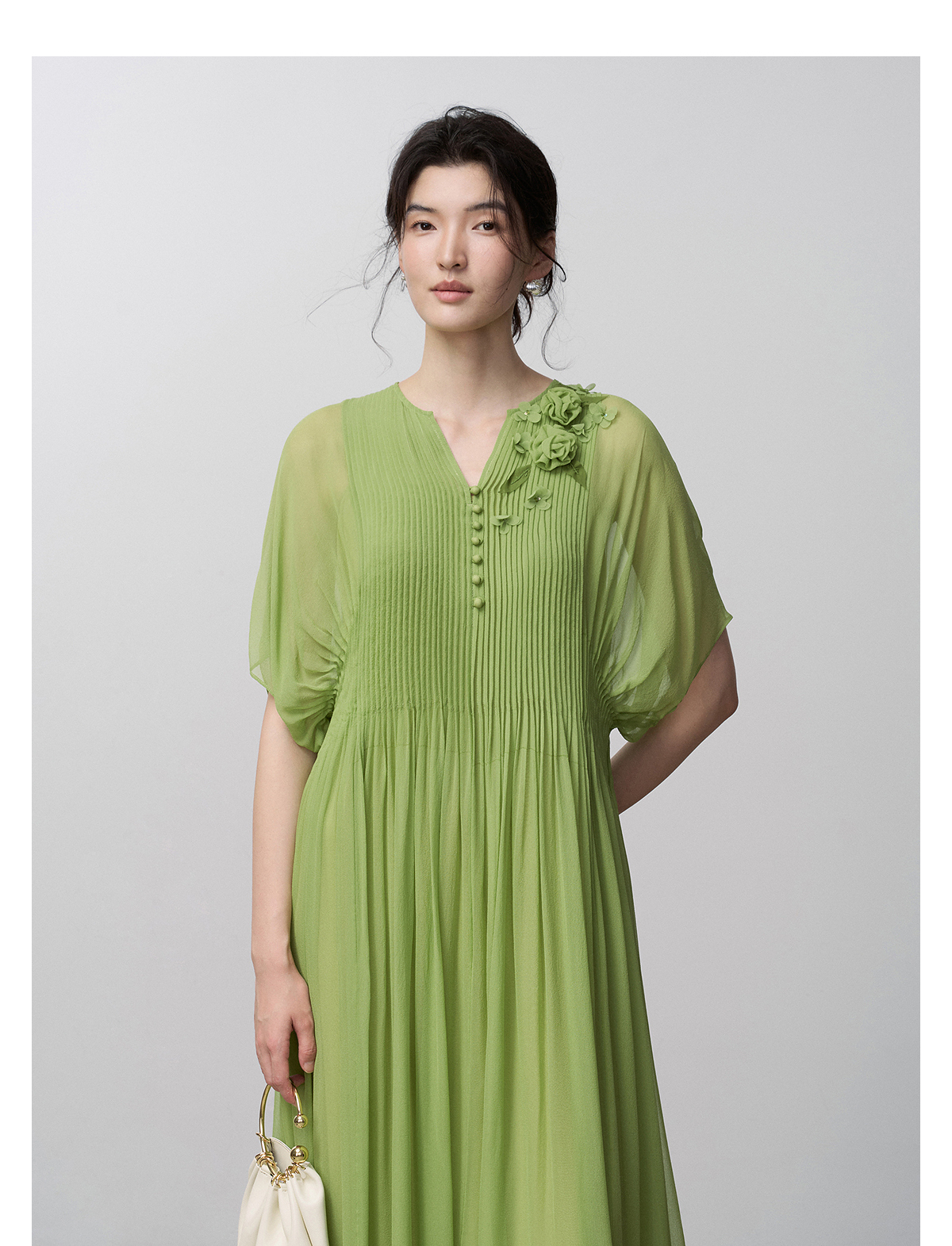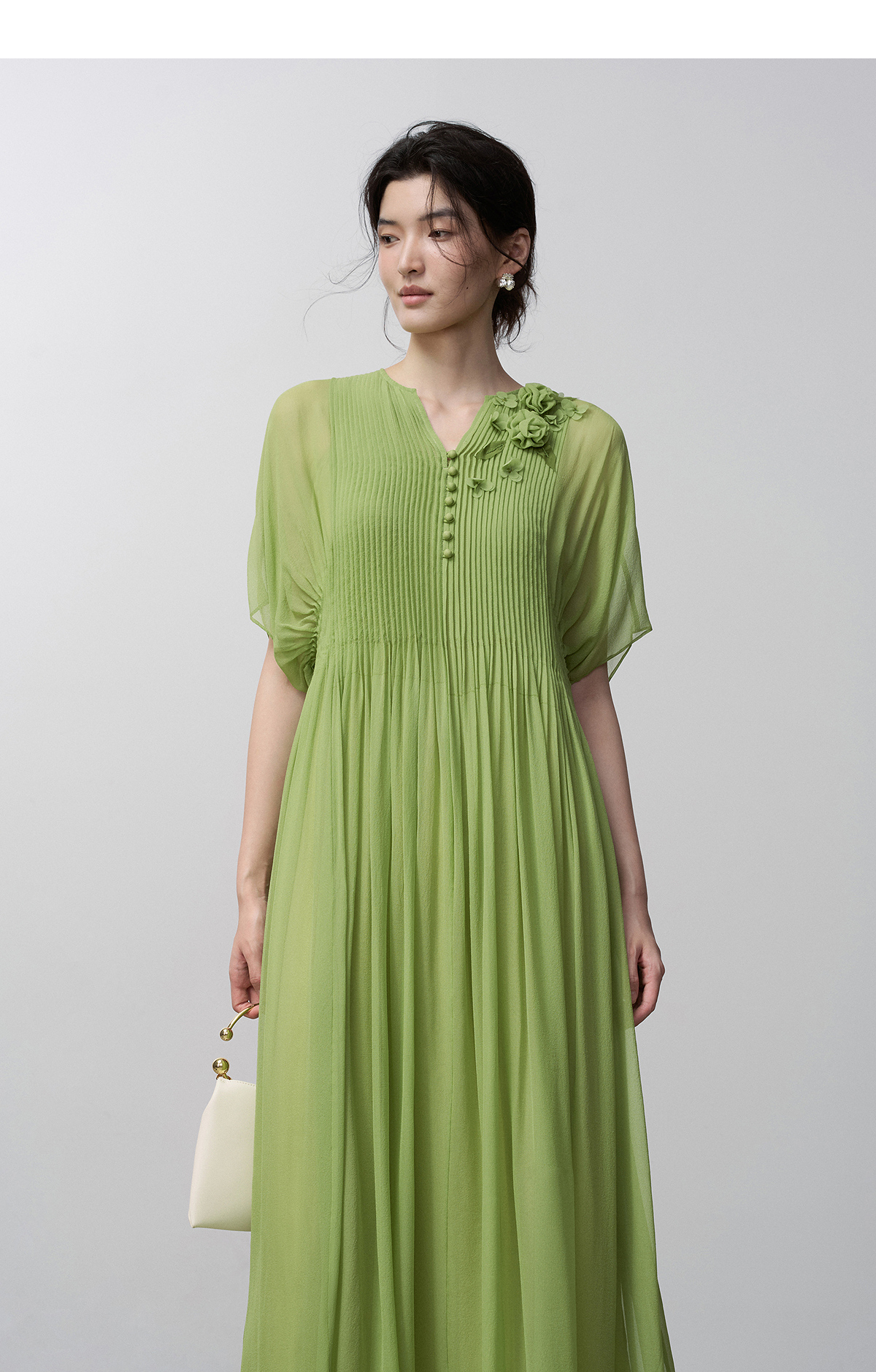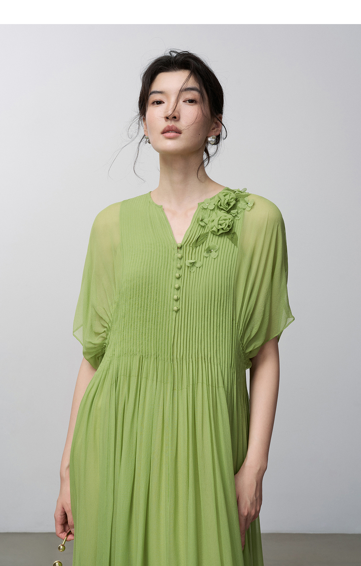 【林栖设计小店】手工钉花|手捏花桑蚕丝压褶垂感2026夏新款连衣裙两件套T1962001