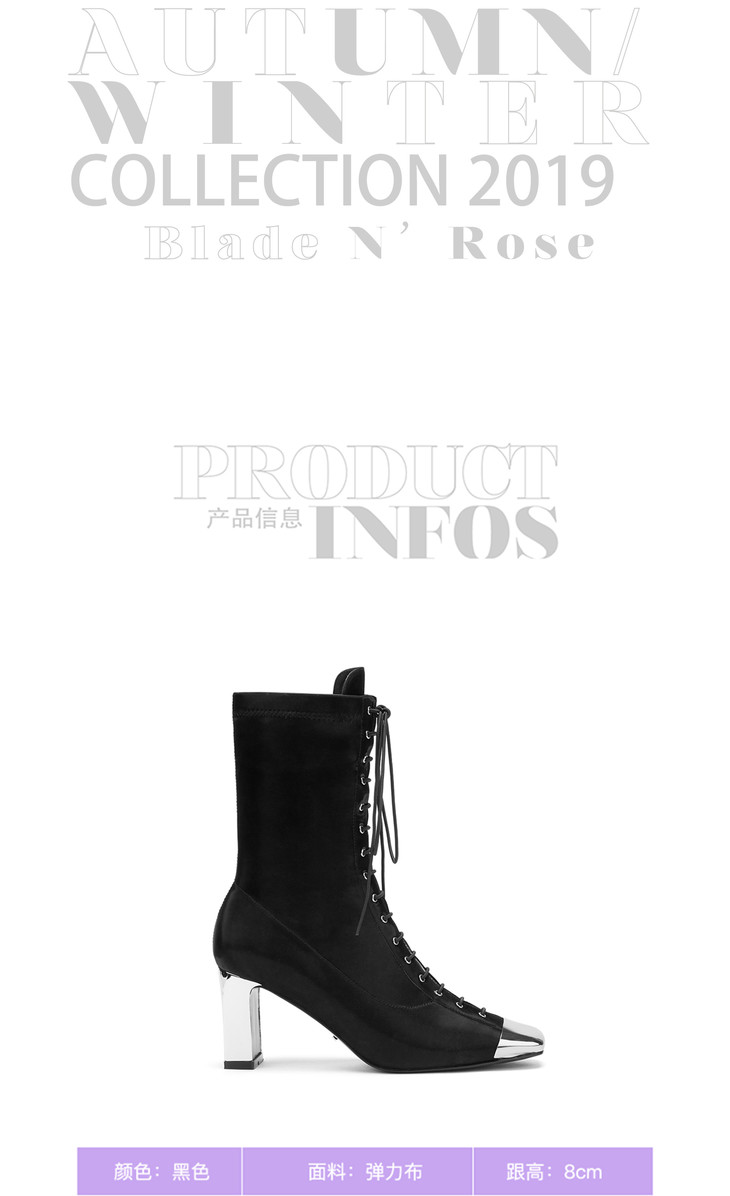 新年闪购lost in echo2020秋季黑色绑带金属方头短靴女靴 铁头方头弹力布高跟女鞋