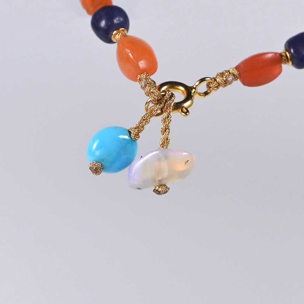 收尾处,坠有一颗绿松石,一颗欧珀。