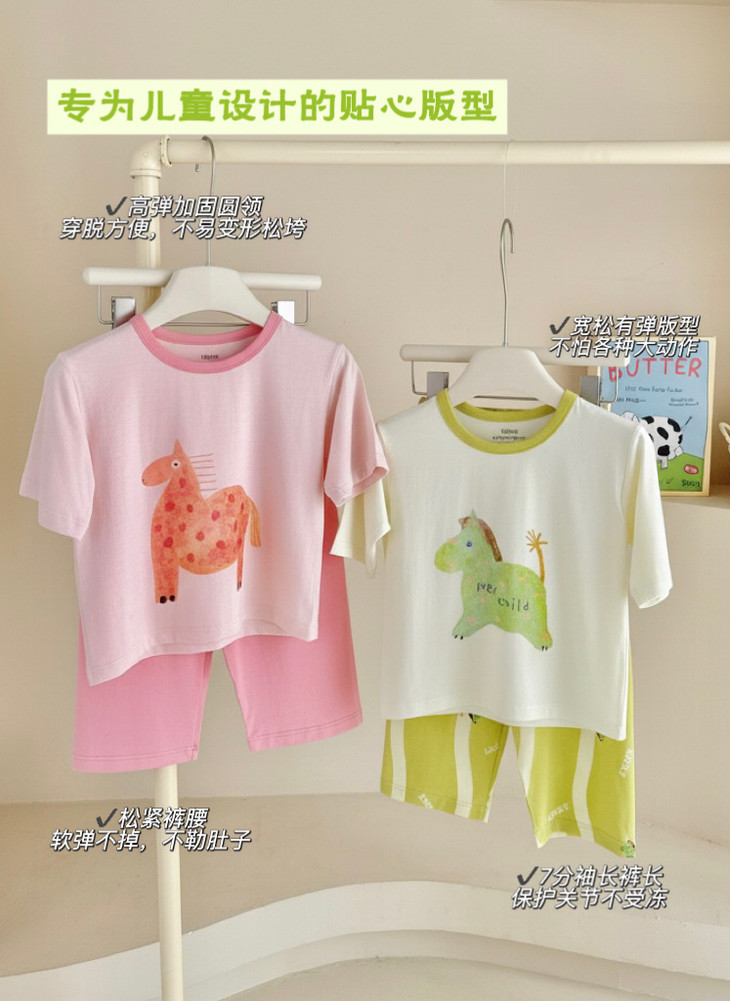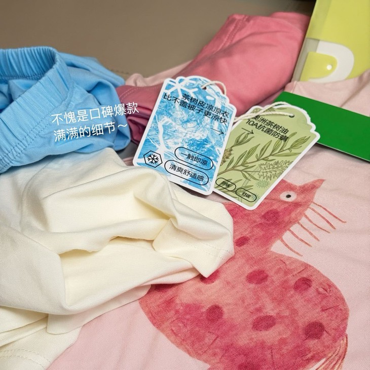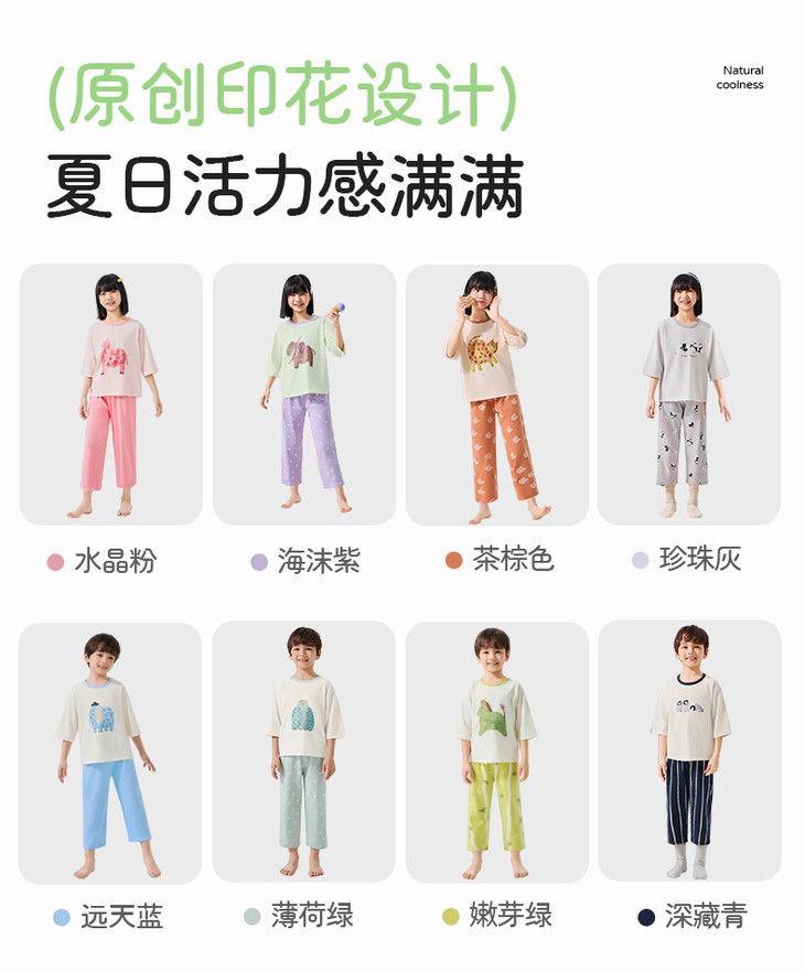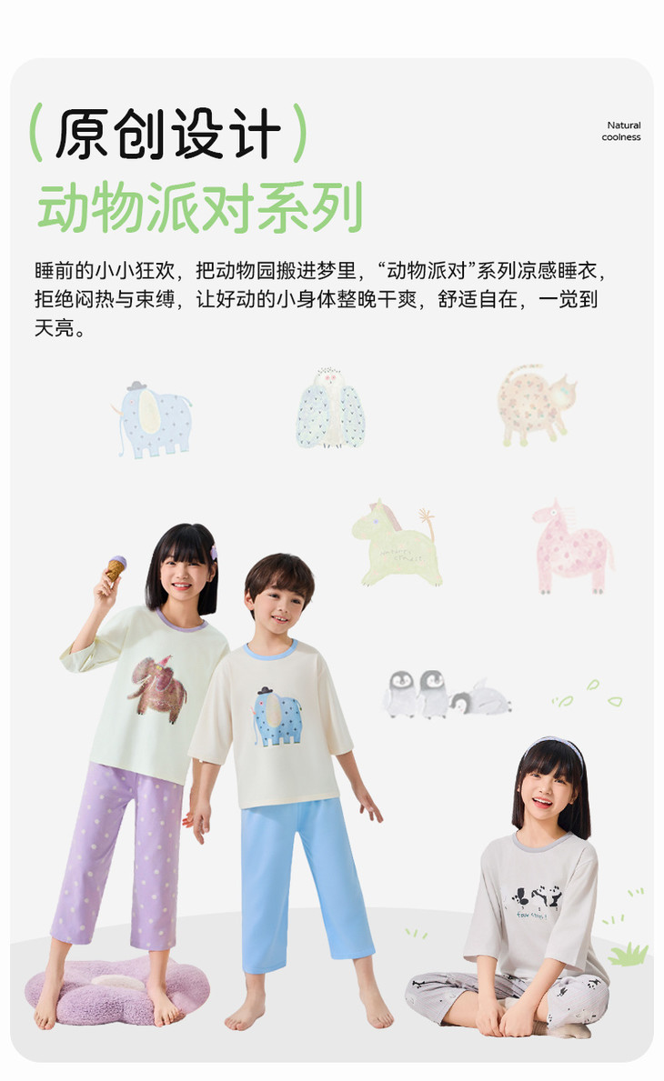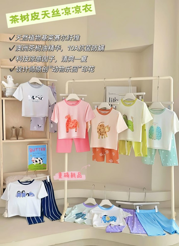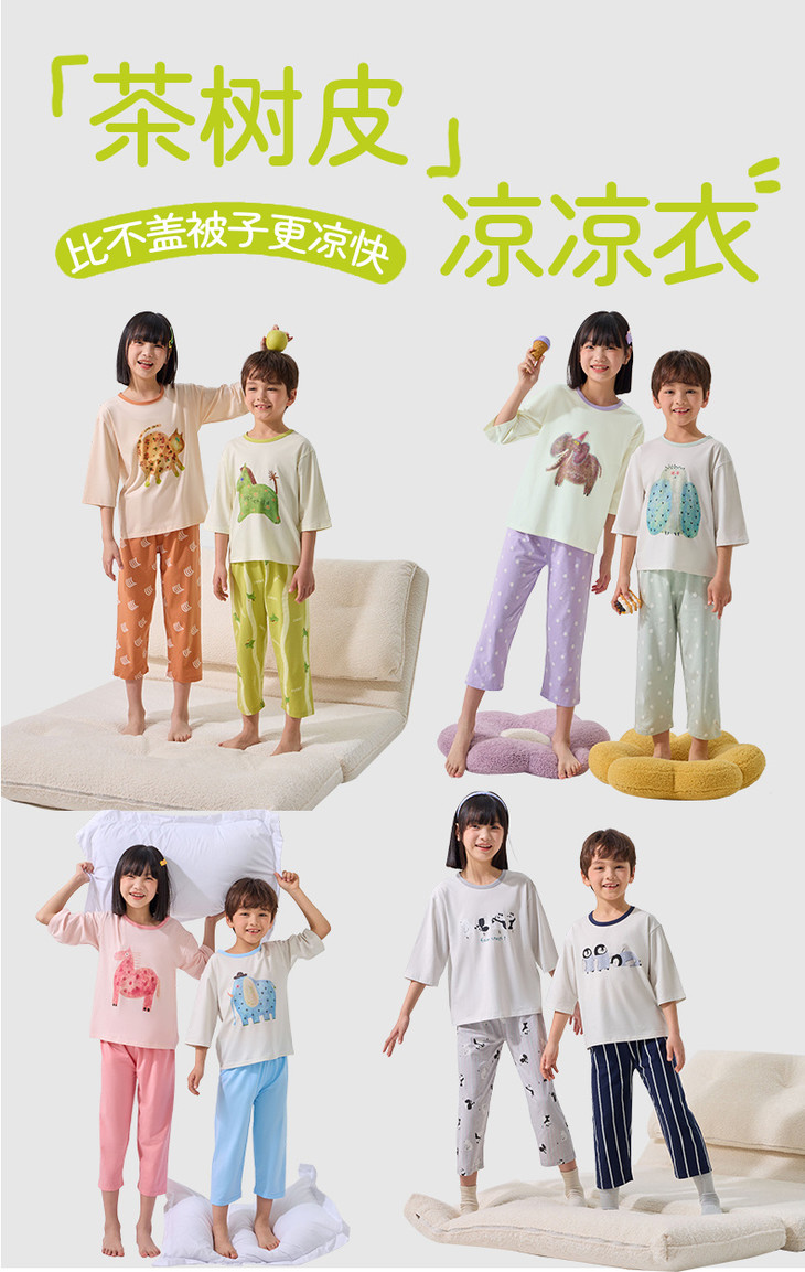 『茶树皮』凉凉衣绝对是夏季不二之选 ✅ 凉感出众:比不盖被子更凉快 ✅ 透气排汗:莱赛尔软软纱,告别汗湿粘身 ✅ 抗菌防螨:澳洲茶树油+10A抗菌,敏宝安心穿 ✅ 安全认证:A类母婴标准,植物印染不掉色 ✅ 贴心版型:宽松不束缚,7分袖长裤护关节 ✅ 颜值在线:原创动物派对,活力撞色 ✅ 多场景穿:居家、睡觉、外出,一套搞定