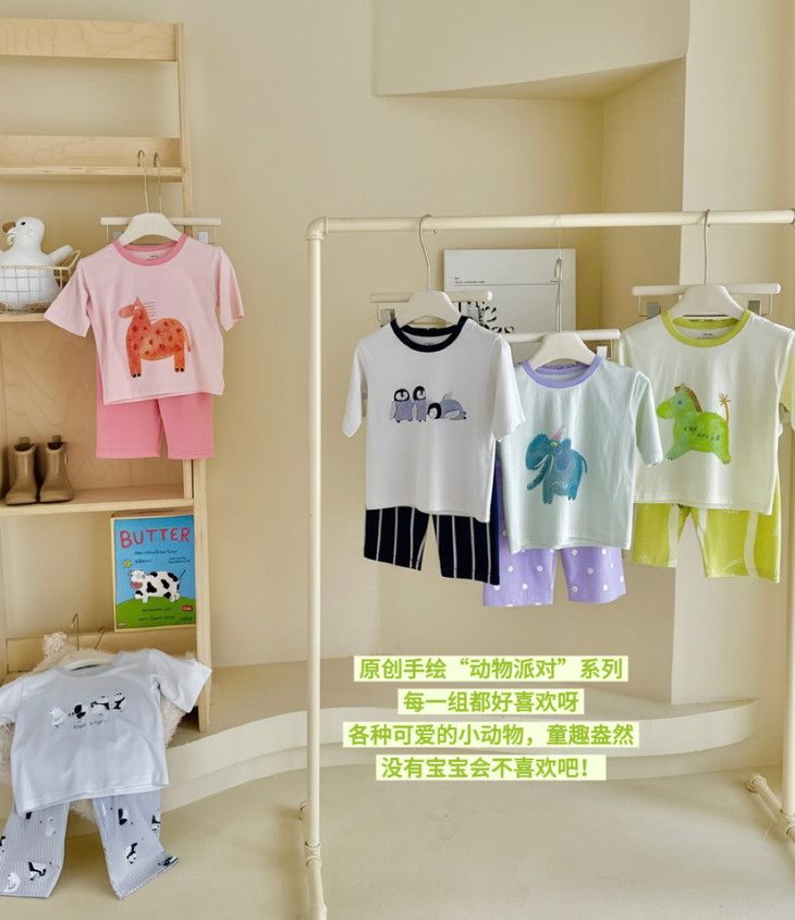 原创手绘的“动物派对”系列 可爱的小猫、调皮的小马、憨憨的小象…… 各种萌趣的小动物,色彩饱满,童趣盎然 它们不是印在衣服上,而是仿佛和宝宝一起 在衣服这个小小乐园里玩耍、探险 激发孩子的想象力与愉悦感~