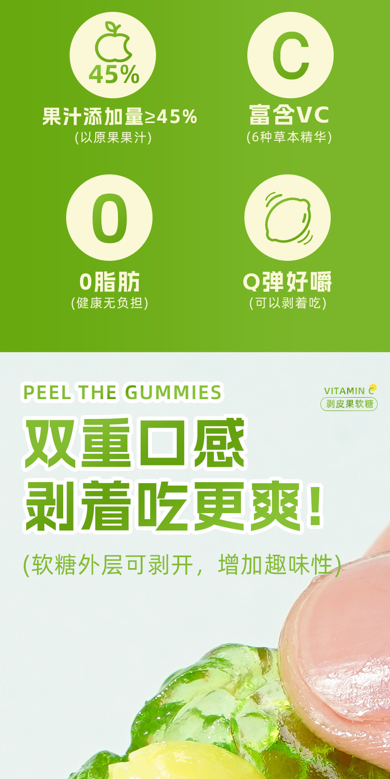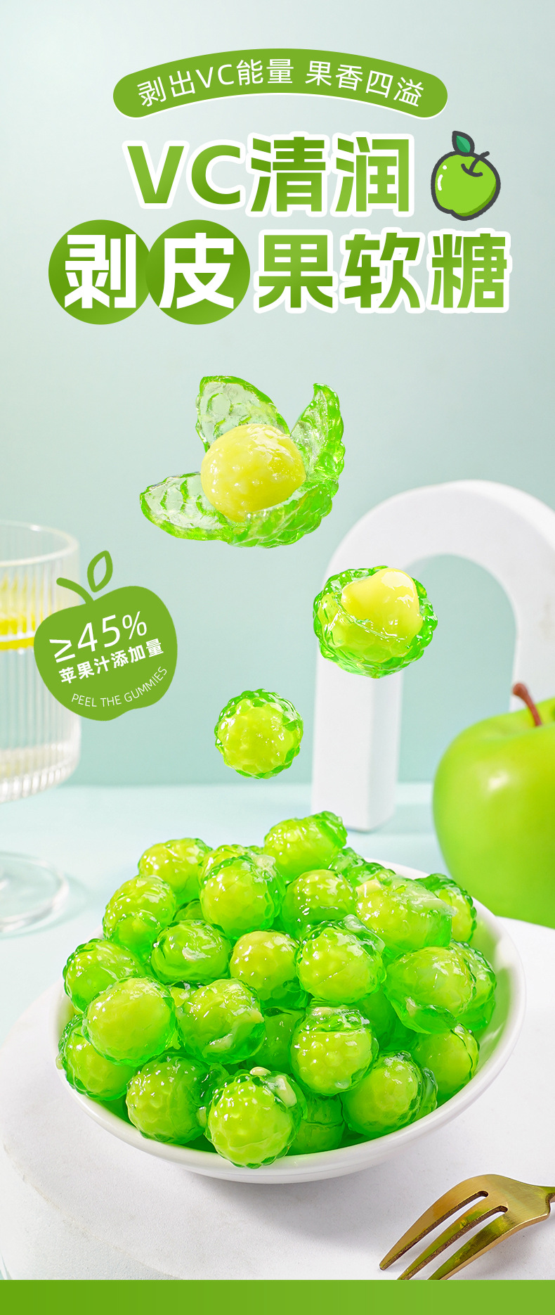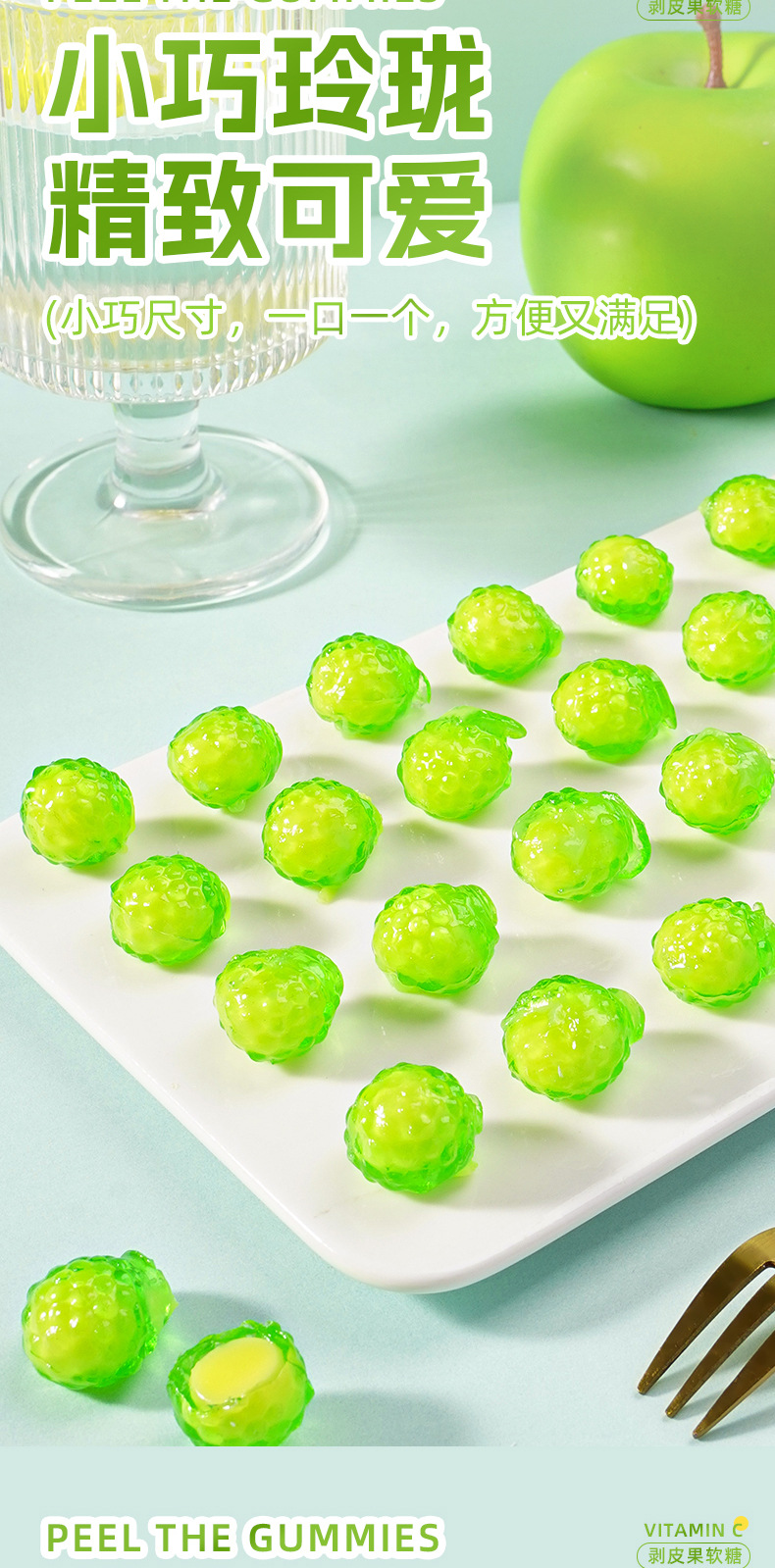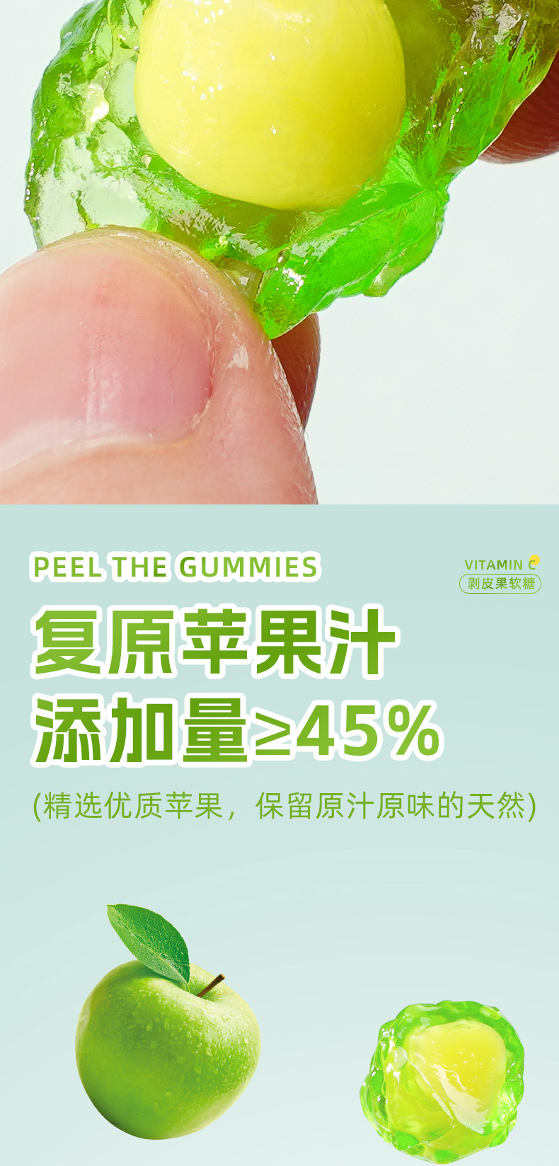 【满满VC❗清润剥皮软糖】甄选品质原料制作,优选添加新鲜苹果汁45%,保留原汁原味的天然,剥皮软糖清新口气酸砂青柠味,3D剥皮糖办公室休闲零食L