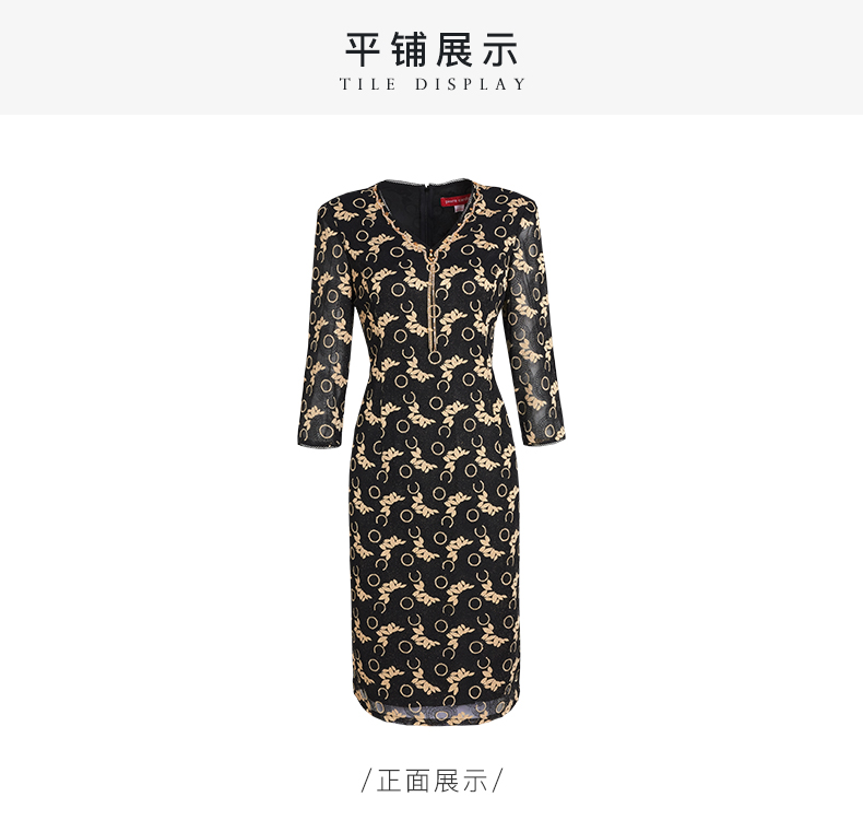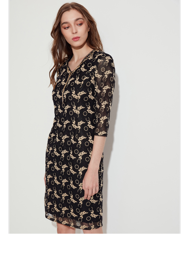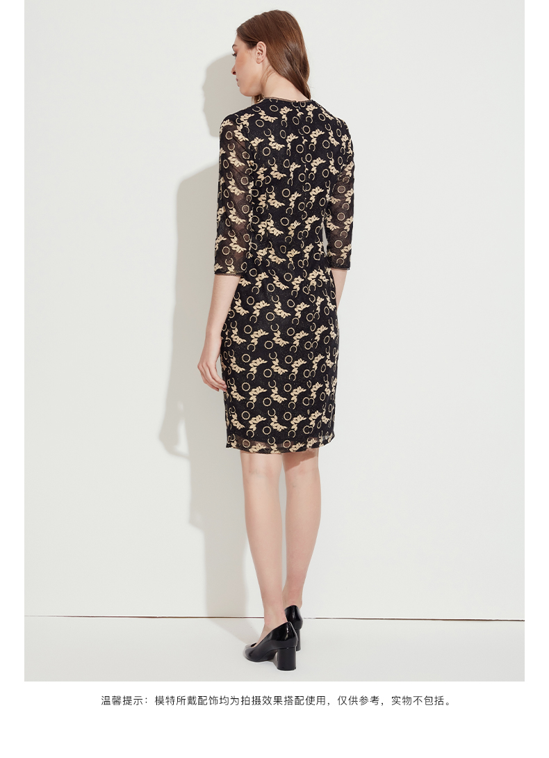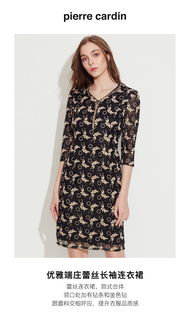 皮尔卡丹女装春季新款优雅端庄蕾丝长袖连衣裙P1110E1067J0
