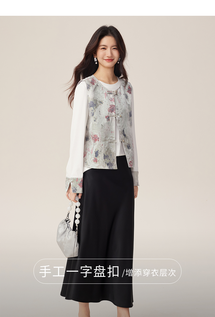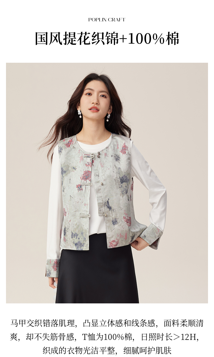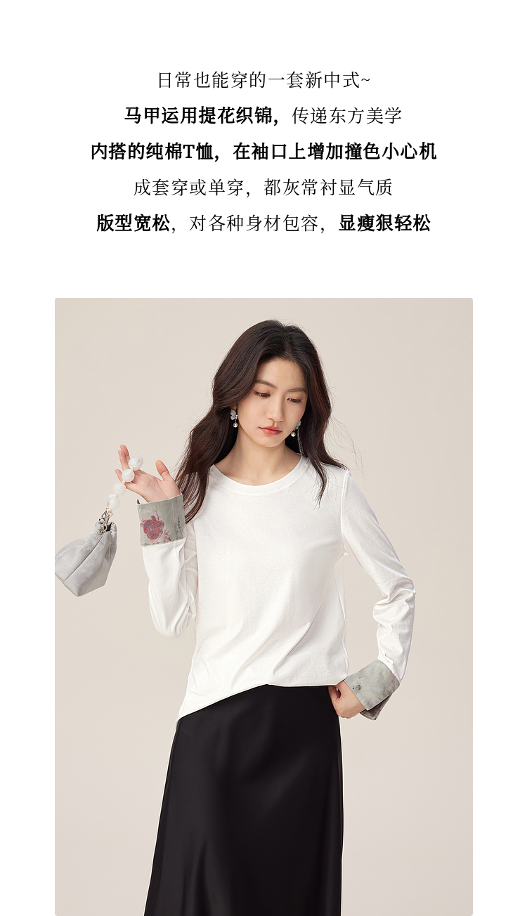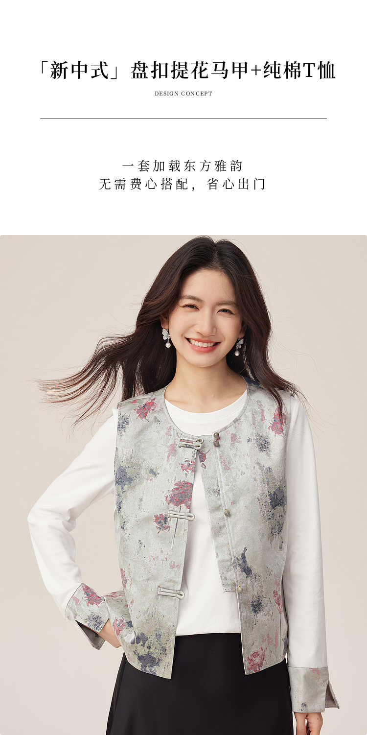 【08/27新品】熙世界国风套装女2025新款秋装新中式长袖T恤盘扣提花马甲两件套