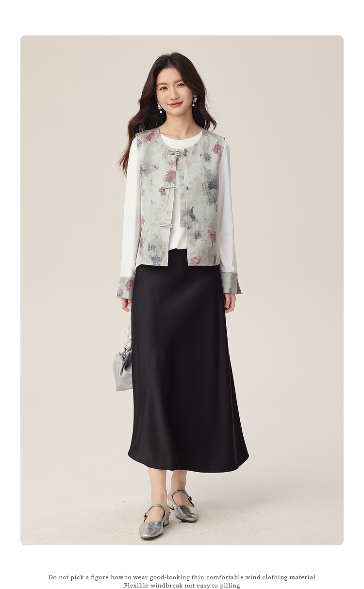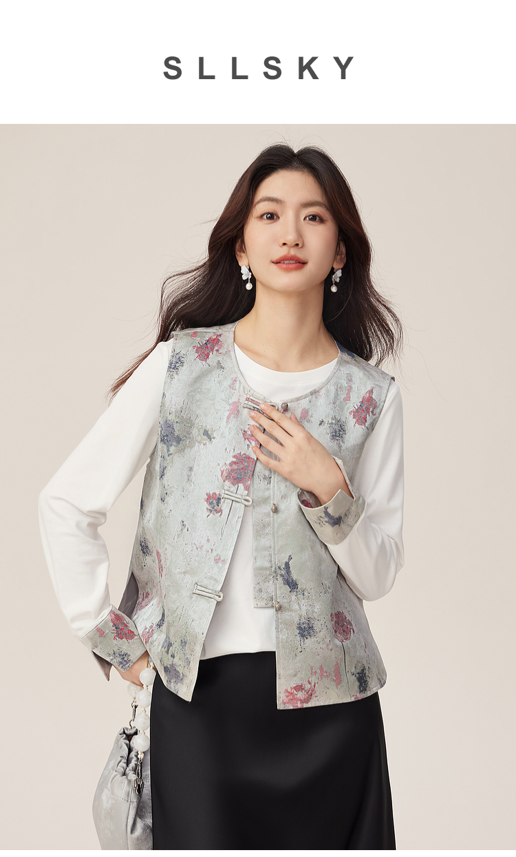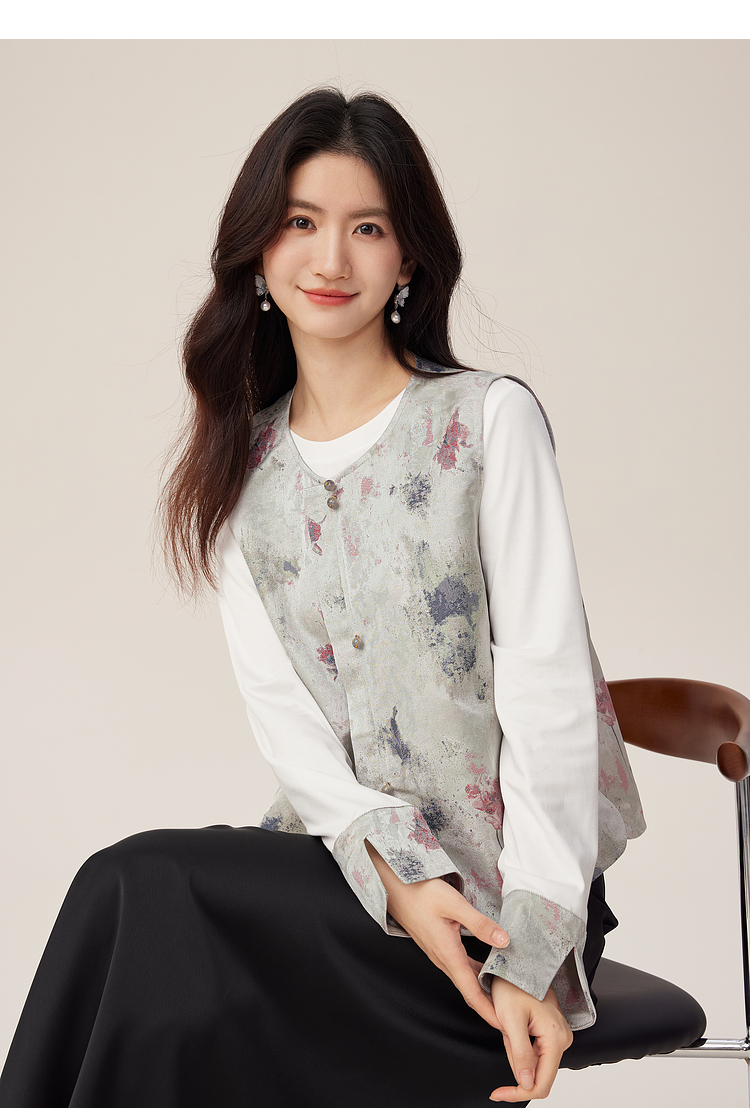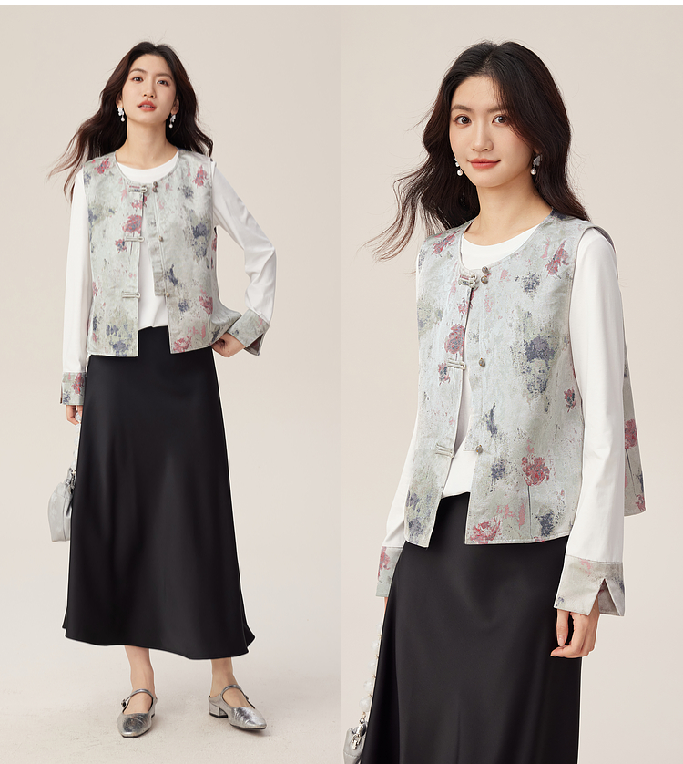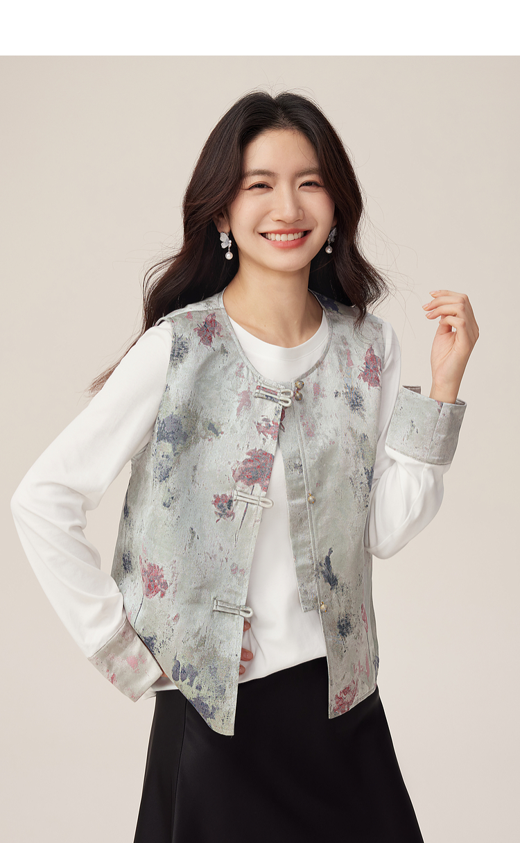 【08/27新品】熙世界国风套装女2025新款秋装新中式长袖T恤盘扣提花马甲两件套