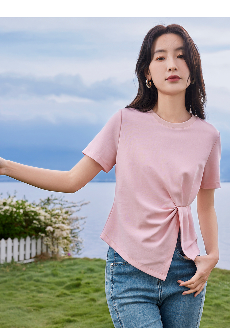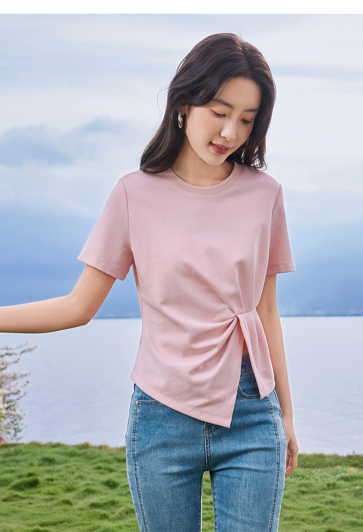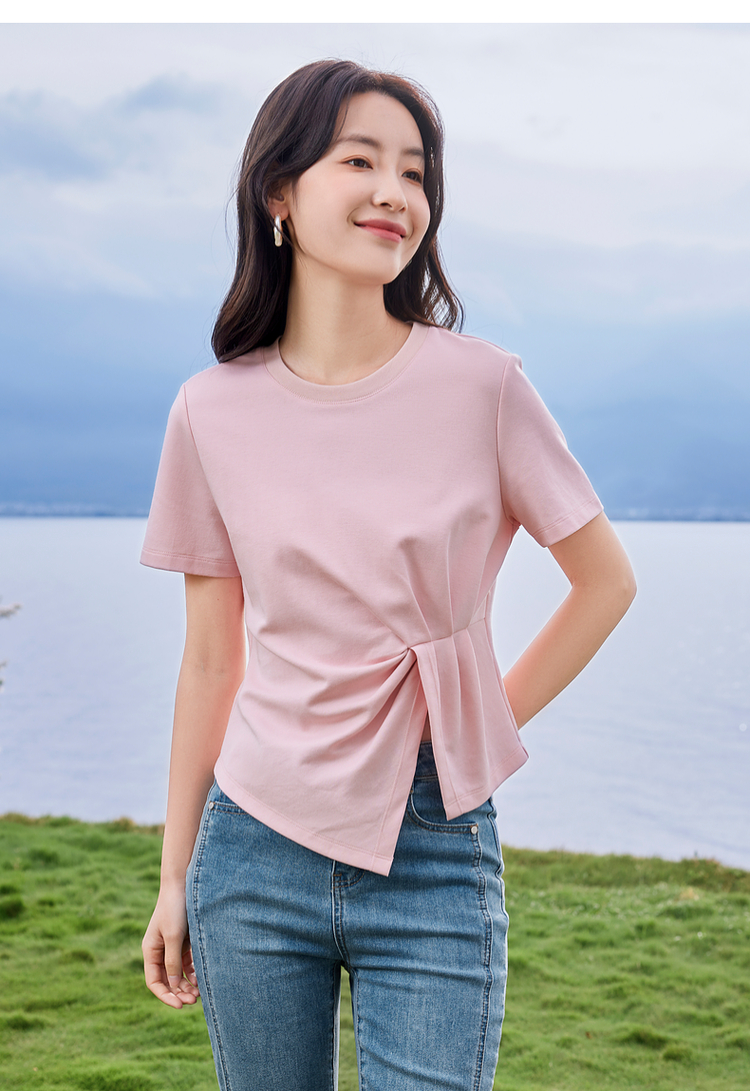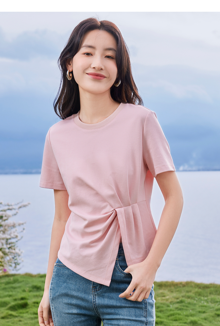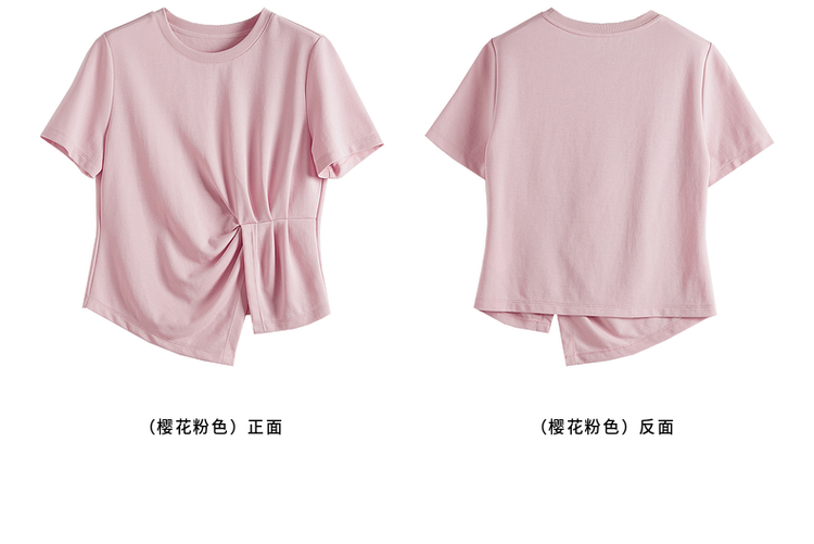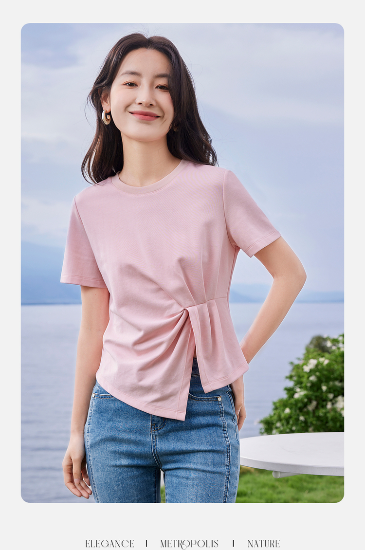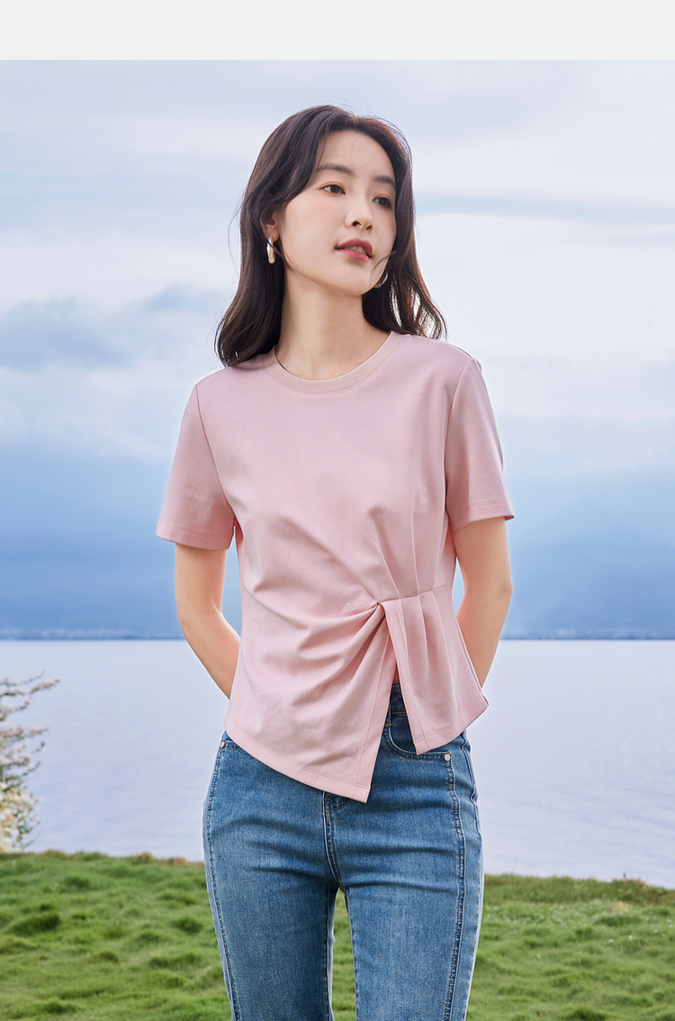 【专属特价】熙世界正肩褶皱收腰开叉短袖T恤女设计感不规则别致上衣24夏装