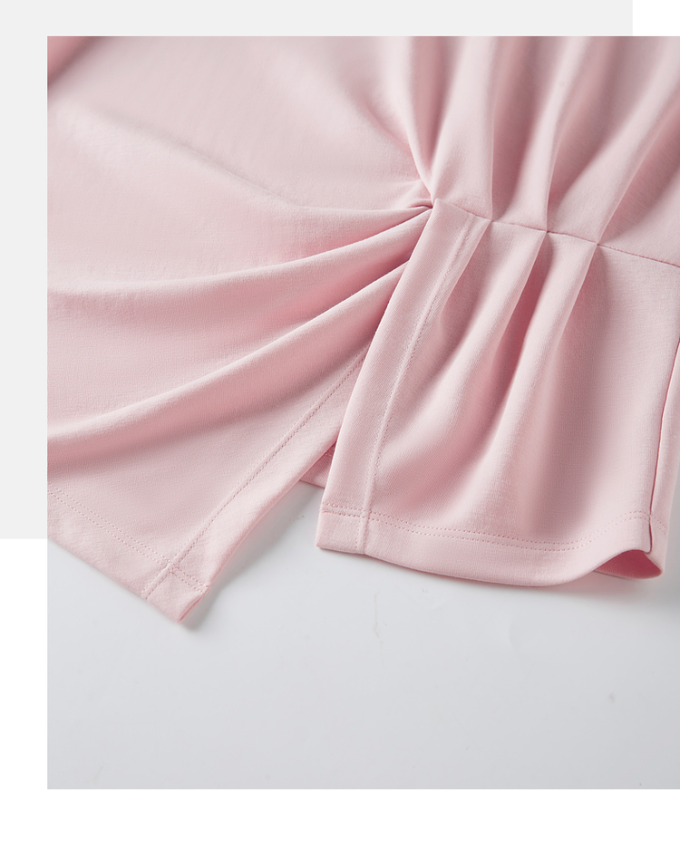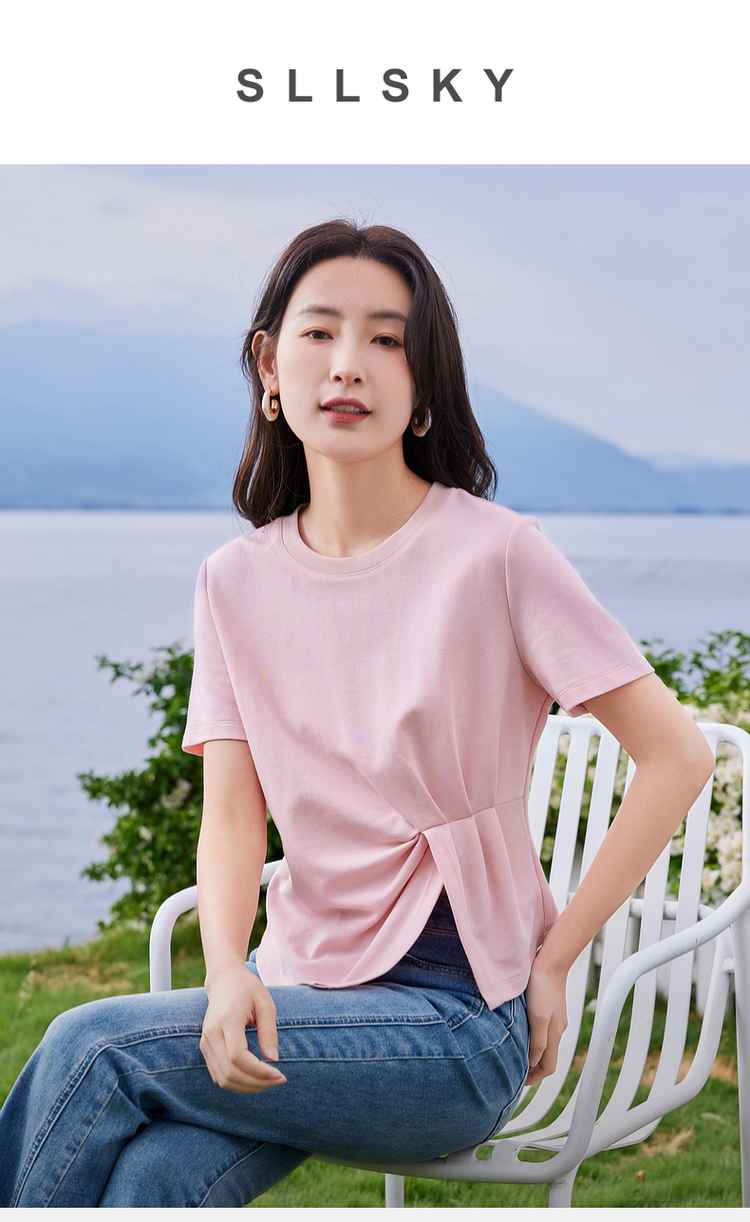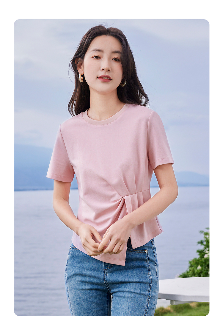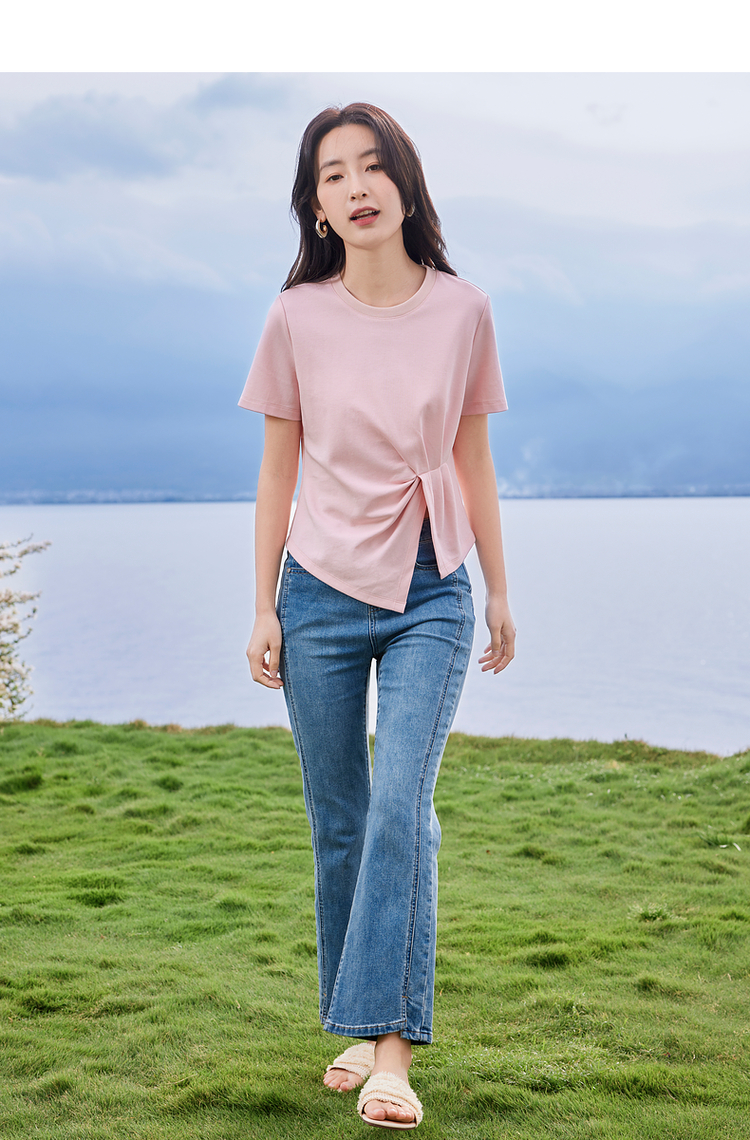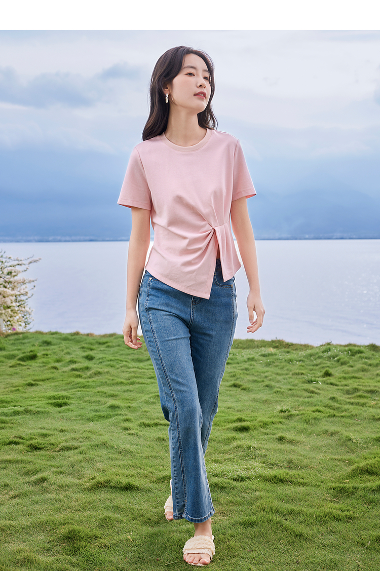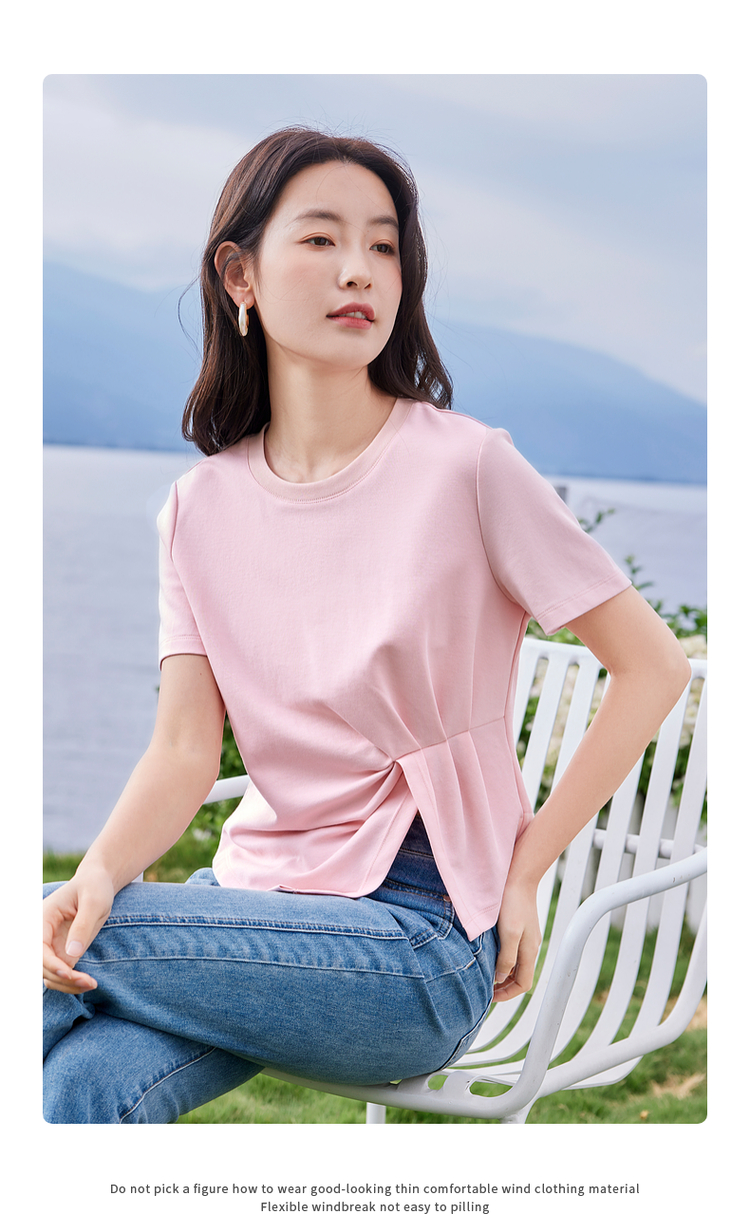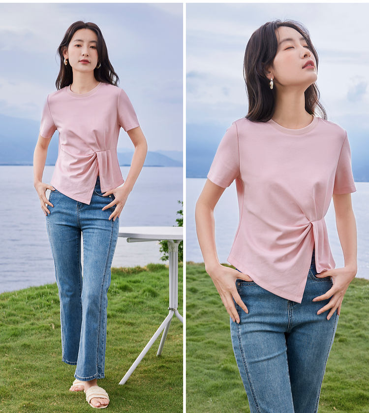 【专属特价】熙世界正肩褶皱收腰开叉短袖T恤女设计感不规则别致上衣24夏装