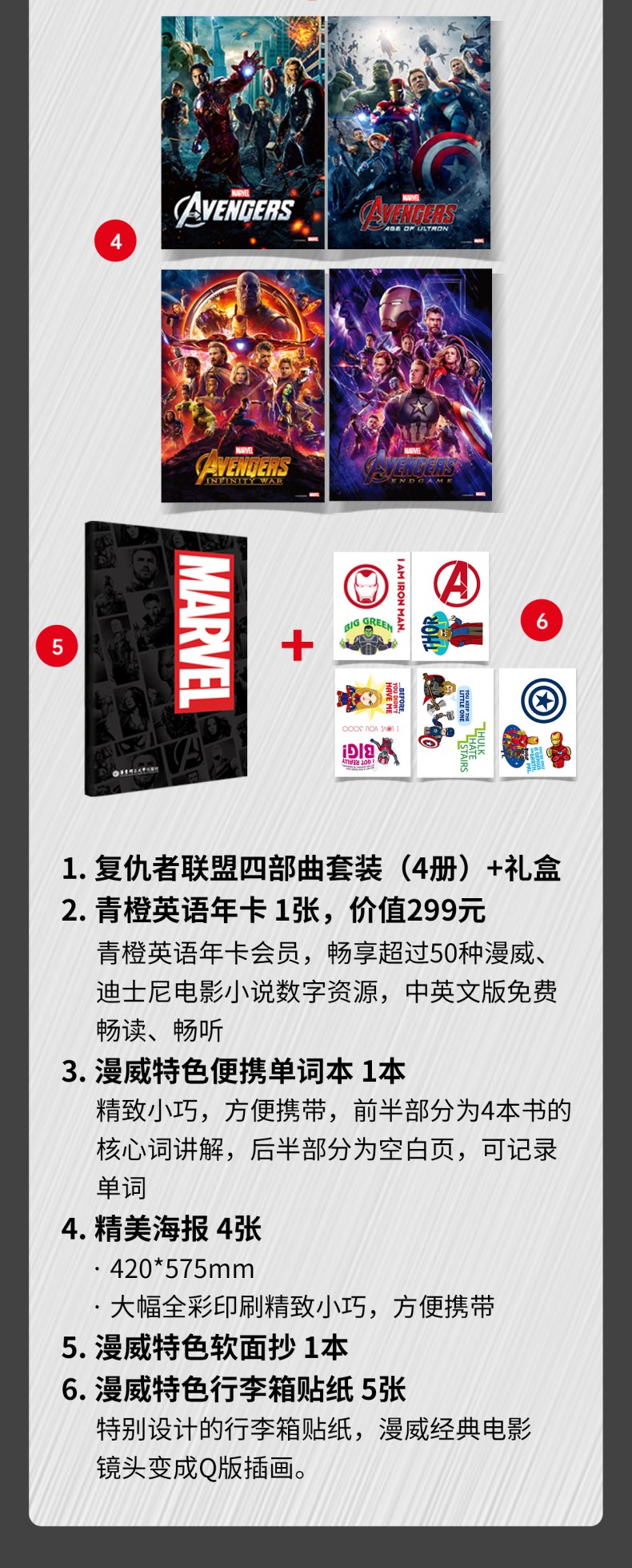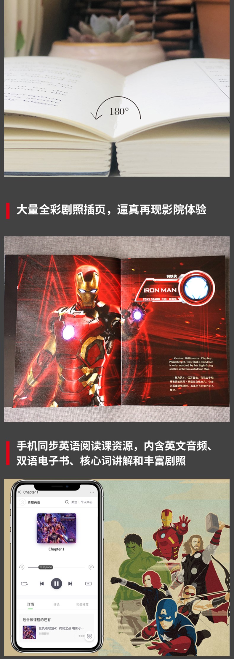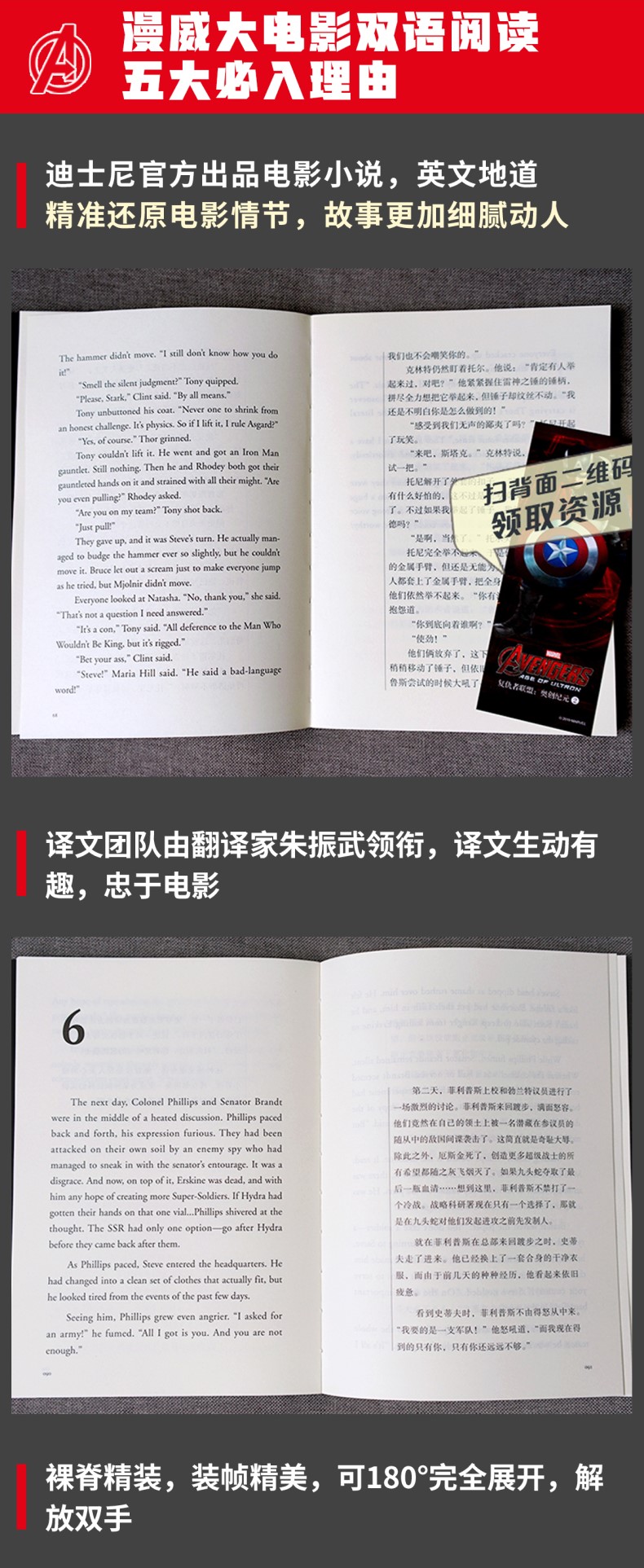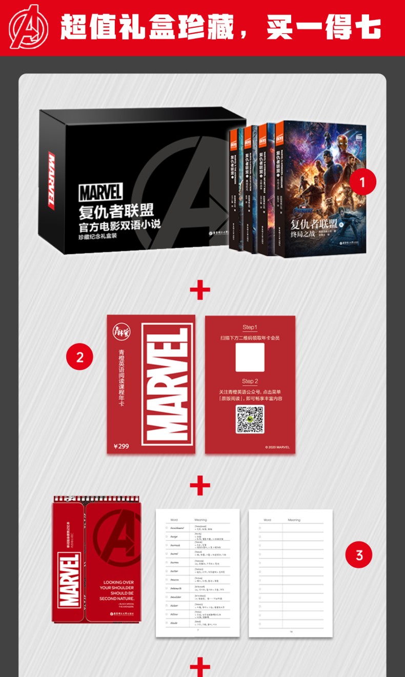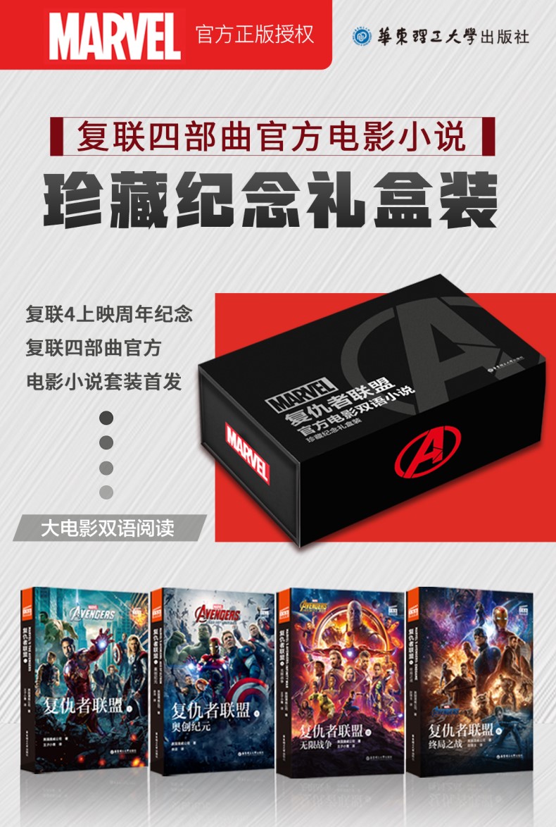 本书为《复仇者联盟1》电影官方同名双语小说,由漫威官方正版授权,讲述了神盾局指挥官尼克将钢铁侠、美国队长、雷神托尔、绿巨人、黑寡妇和鹰眼侠六位超级英雄集结在一起,组成了复仇者联盟应对邪神洛基的故事。本书英文版由美国知名出版社出版,英文地道,无删减、非改编;译文由国内漫威粉丝核心圈译者执笔,译文生动有趣,忠于电影。针对重难点词汇,配有电子版单词随身本,随查随用,帮助读者扫清阅读障碍。此外,随书还赠送精美书签,随书签赠价值19.9元阅读课程礼包,内含电子版全文与全书英文朗读音频。同一种题材,不同的媒介,给您带着不同的体验!本书为《复仇者联盟2:奥创纪元》电影官方同名双语小说,由漫威官方正版授权,讲述了在地球面临生死存亡的紧急关头时,强大的超级英雄们挺身而出承担起拯救世界的重任,阻止可怕的人工智能机器人“奥创”恐怖计划的故事。本书英文版由美国知名出版社出版,英文地道,无删减、非改编;译文由国内漫......