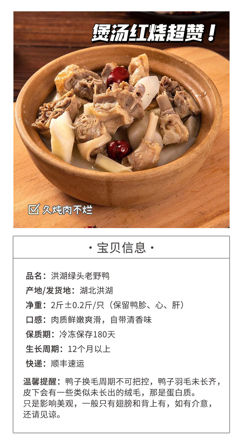 洪湖绿头野鸭散养12个月以上,带溯源码,清水炖出好味道,红烧更惊艳,无膻味!久炖肉不散,紧实有嚼劲,肥而不腻!
