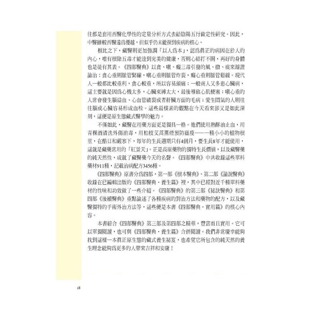 結合漢、印、藏三地的醫學精華,歷經時間的淬練,醫學理論完備、獨特且自成體系,內容媲美《黃帝內經》,飽含豐富的養生方法與實用價質,不啻為藏族最偉大的醫學巨著。