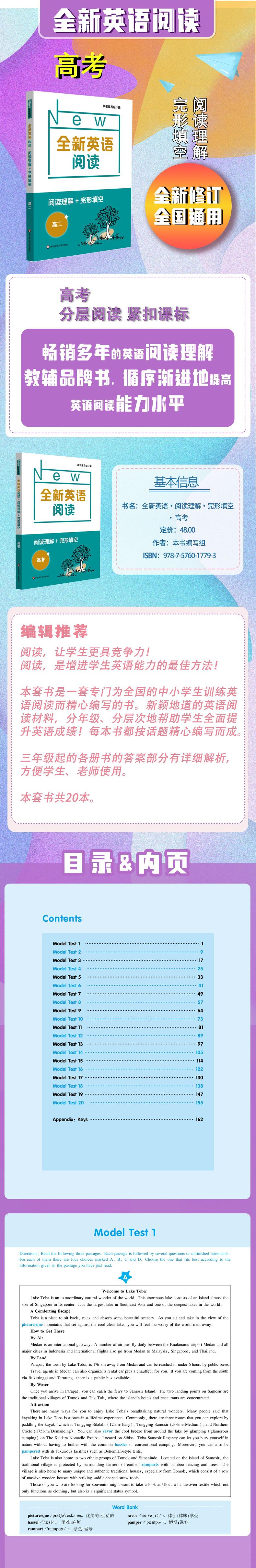 本书为全新英语阅读系列书中的一本,专门给高三年级学生训练英语阅读理解使用的书,难度适中,可以服务全国的高三年级的学生,为他们提供了很好的训练英语阅读的材料,题型多样,材料新颖。每本书有20个单元,每个单元四篇文章,按照高考考题的命题要求命制各篇阅读理解和完形填空的题目。每篇文章下都有一个word bank,让学生积累词汇,另外答案部分全部详细解析,方便老师和学生使用。本书分层次地、循序渐进地提高英语阅读方面的能力,帮助学生全面提高英语阅读理解的成绩。