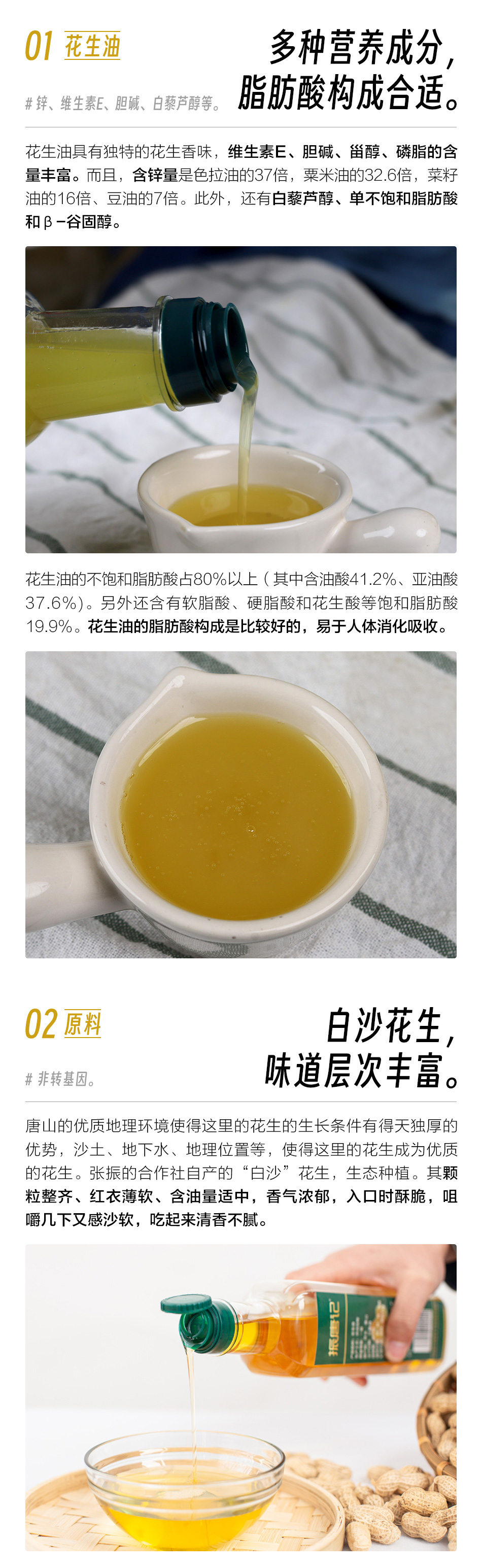 【配料】:花生 【净含量】:700ML/2.5L 【生产工艺】:物理压榨 【质量等级】:一级 【执行标准】:GB/T1534 【食品登记证号】:1130208020028 【生产日期】:见瓶身 【保质期】:24个月 【生产地址】:河北省唐山市丰润区丰登坞镇宋李庄村 【贮存方法】:密封、阴凉干燥、避光处贮存 【食用方法】:煎、炒、炸、凉拌 【温馨提示】:低温环境下花生油会凝固,逐渐变浑浊。气温回升,花生油会逐渐融化,直到完全变清澈。均为正常现象,并非质量问题。