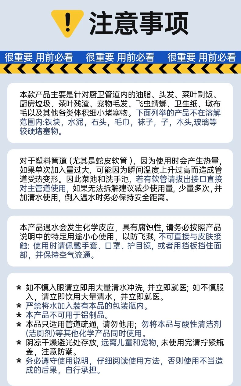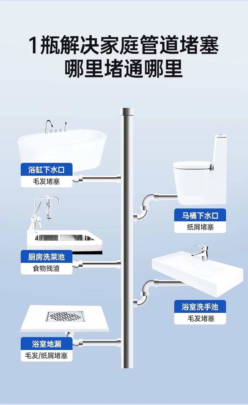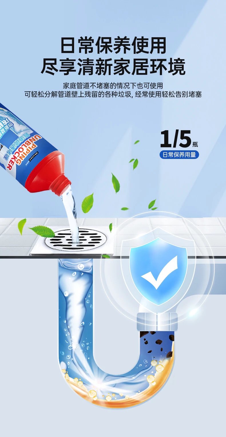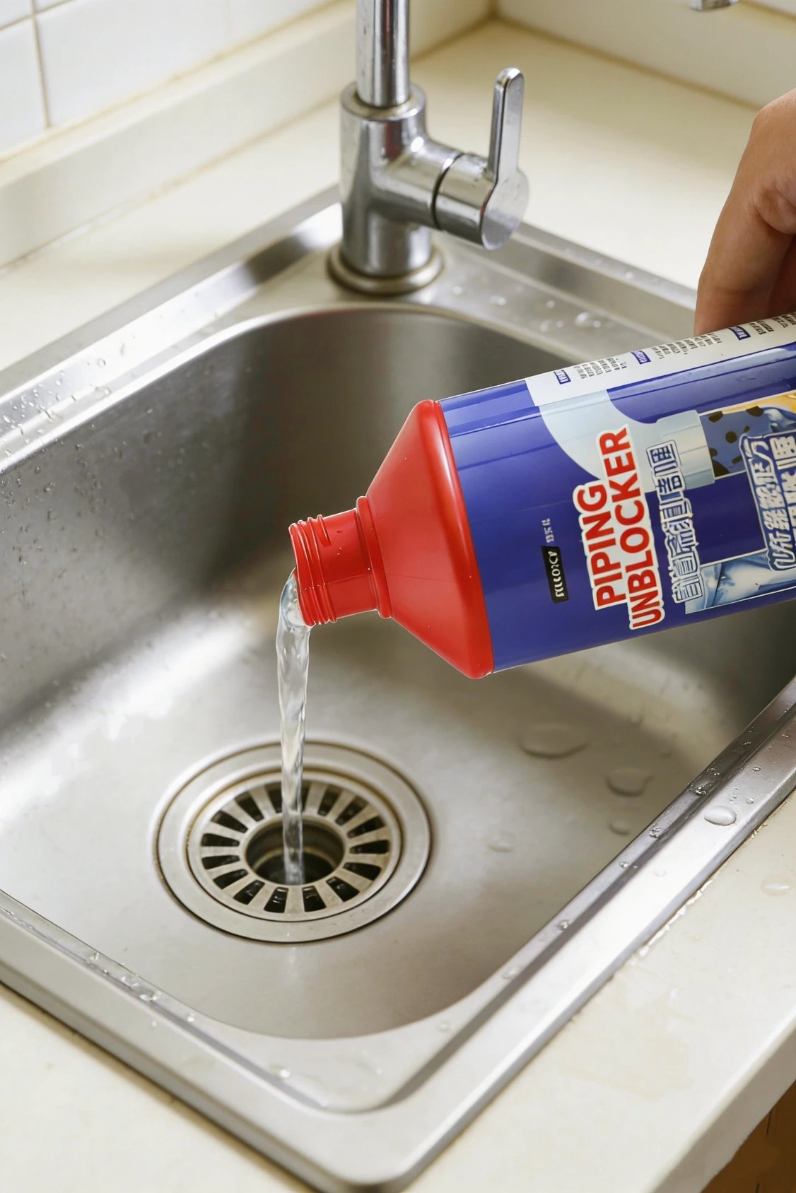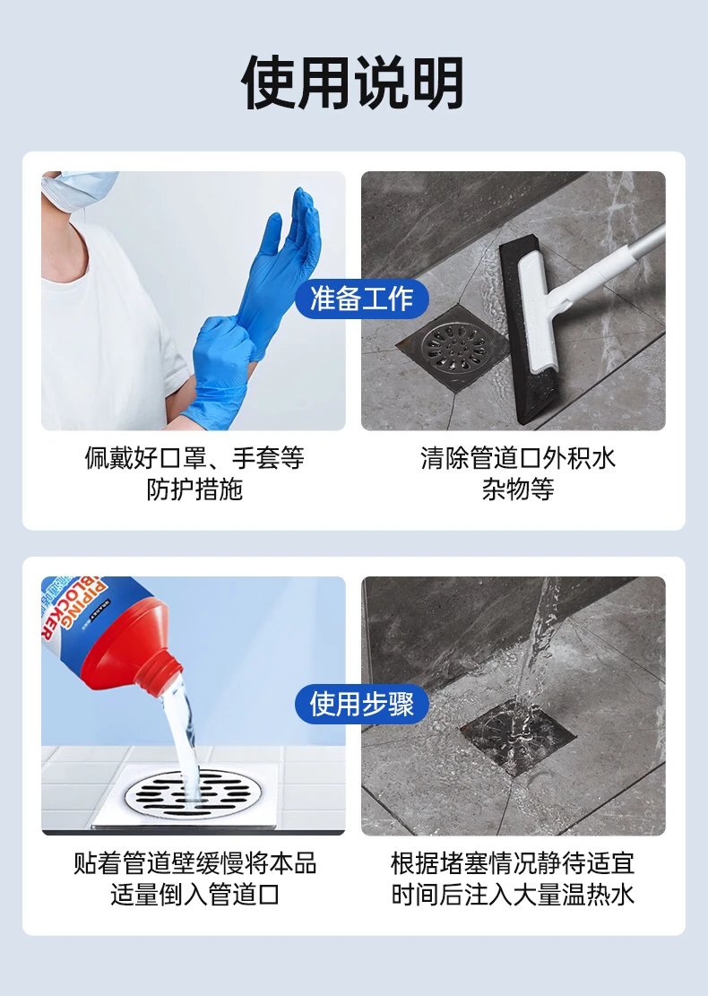 1️⃣打开瓶盖,向管道中倒入本品1/2瓶,至少等待八小时以上(根据管道堵塞实际情况时间可适当延长)倒入大量热水;如未疏通,请重复使用。