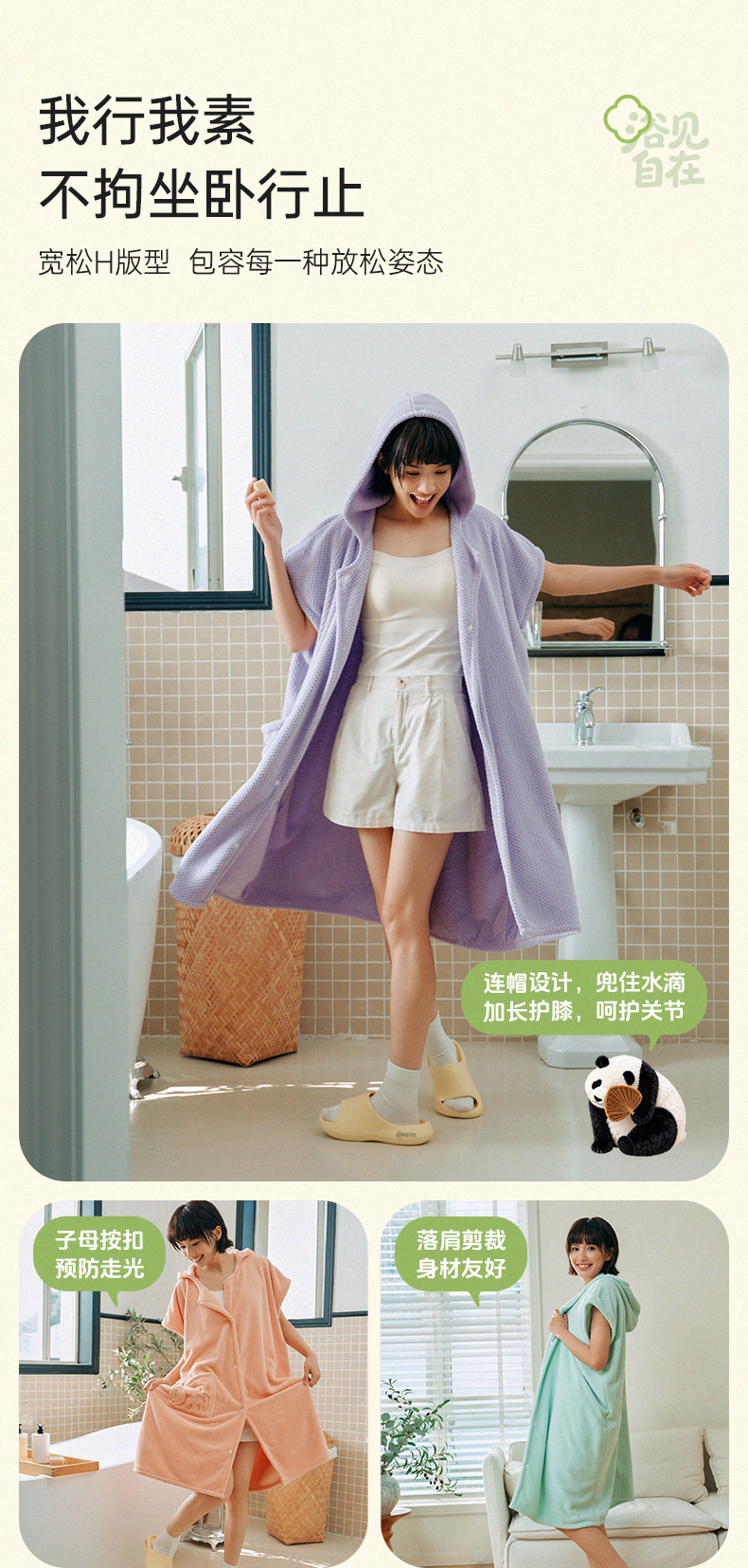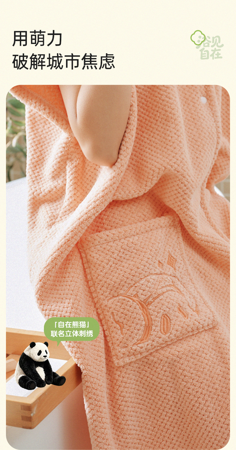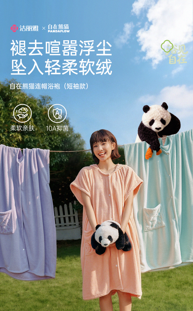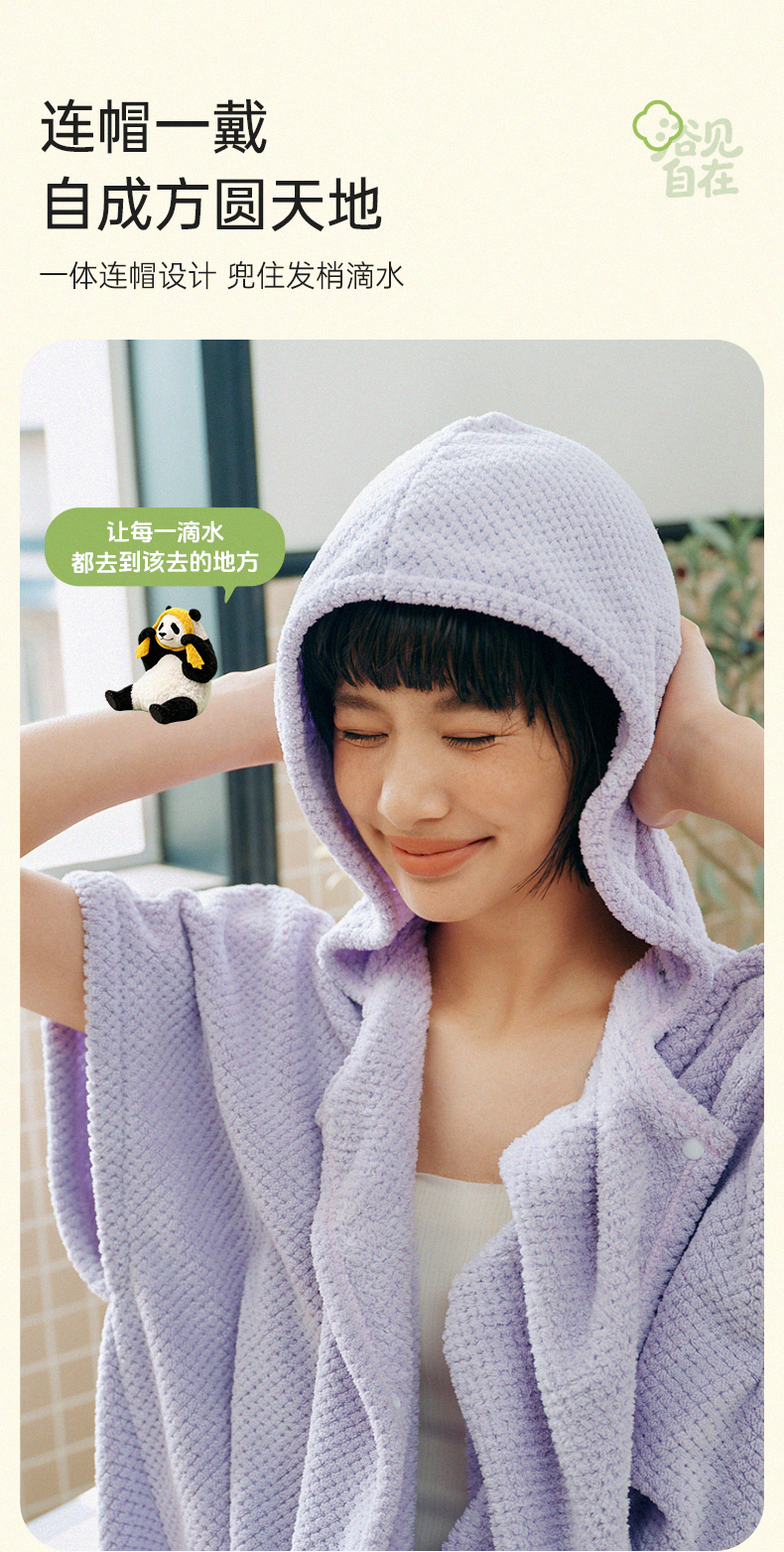 洁丽雅自在熊猫连帽短袖浴袍成人可穿式加长家用洗澡吸水浴裙宿舍