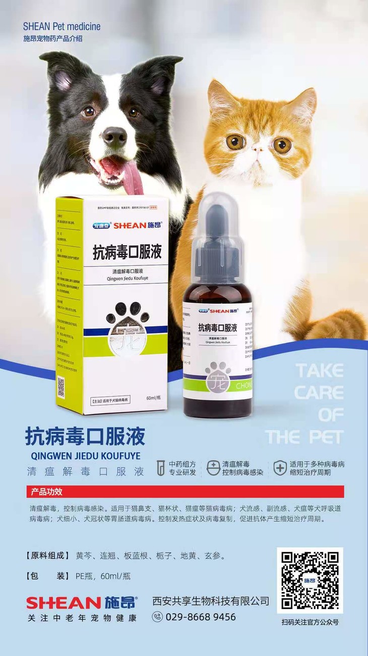 功能主治:清热解毒。主治外感发热,控制病毒感染。适用于猫鼻支、猫杯状、猫瘟等猫病毒病;犬流感、副流感、犬瘟等犬呼吸道病毒病;犬细小、犬冠状等胃肠道病毒病。控制发热症状及病毒复制,促进抗体产生缩短治疗周期。