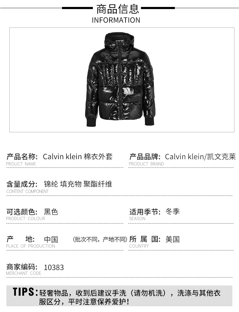 【超惠秒】Clavin Klein 卡文·克莱 男士防风雨抗寒保暖连帽外套10383