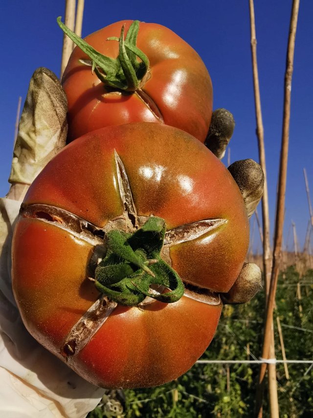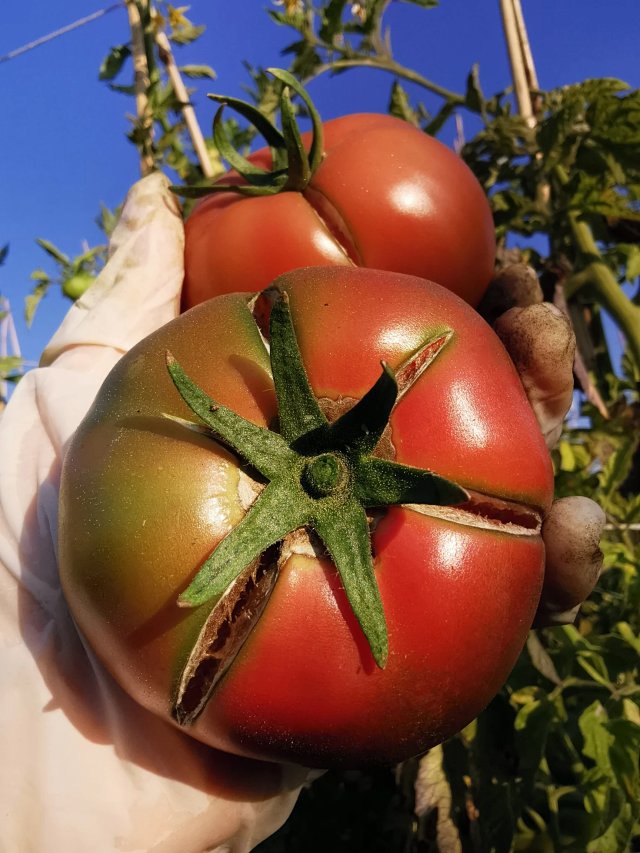 好不容易盼到卖果了,怎么眼瞅着一个个果子都开口了???缺钙??补了!!!照样裂???又琢磨琢磨,发现起垄朝向错了,本该南北朝向,均匀日照。结果我们东西朝向了。造成一半的苗子终日晒不到太阳,而另一半则终日顶着大太阳晒。。白天24,5度,夜间4,5度。。热胀冷缩都知道吧???终于,顶着大太阳的那一半果子撑不住,大部分都晒裂了。。别问我为啥晒多了会裂,换你天天在这攀枝花大太阳下晒,晒三个月,你也得裂!仅存的五成产量,又裂了两成。。
