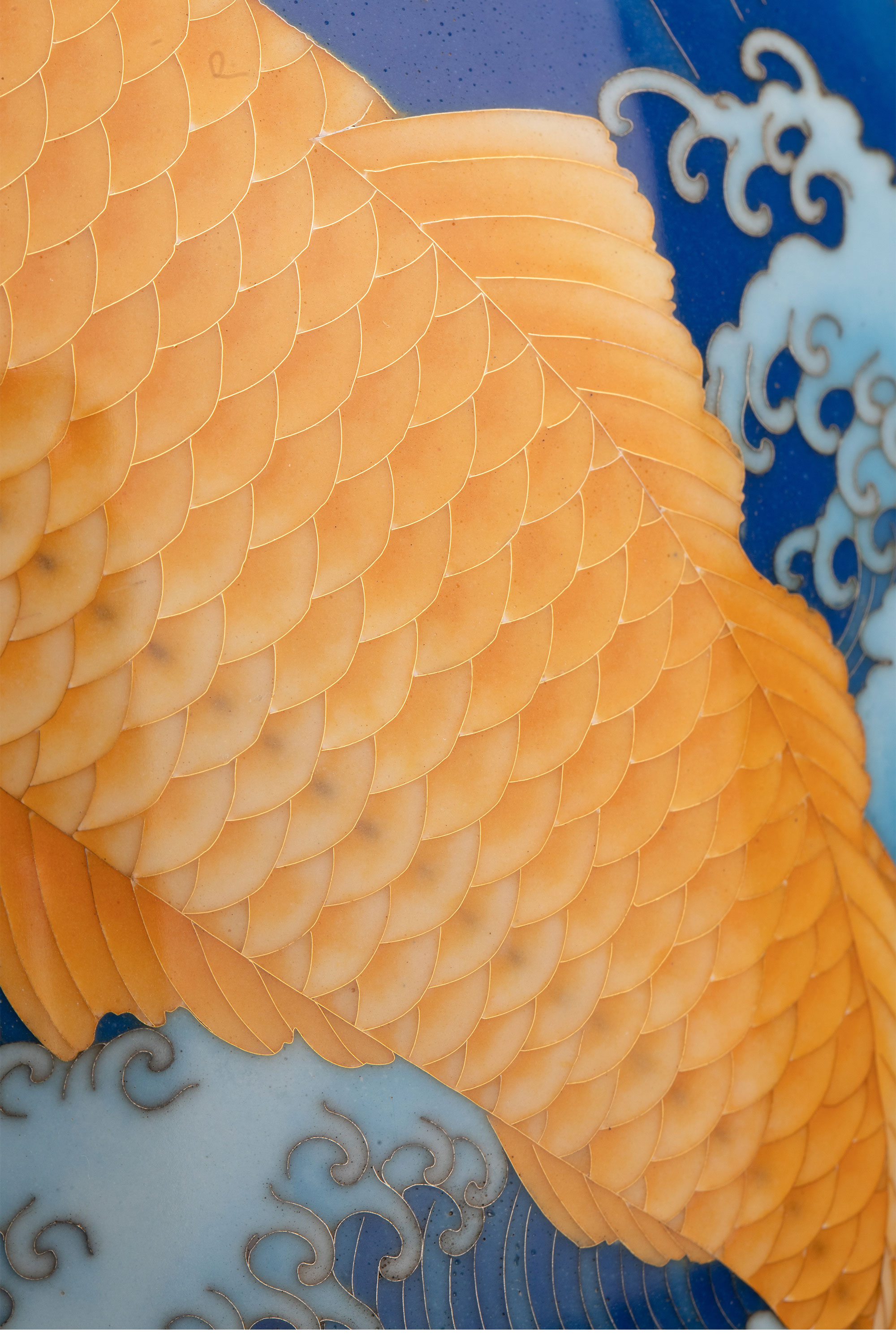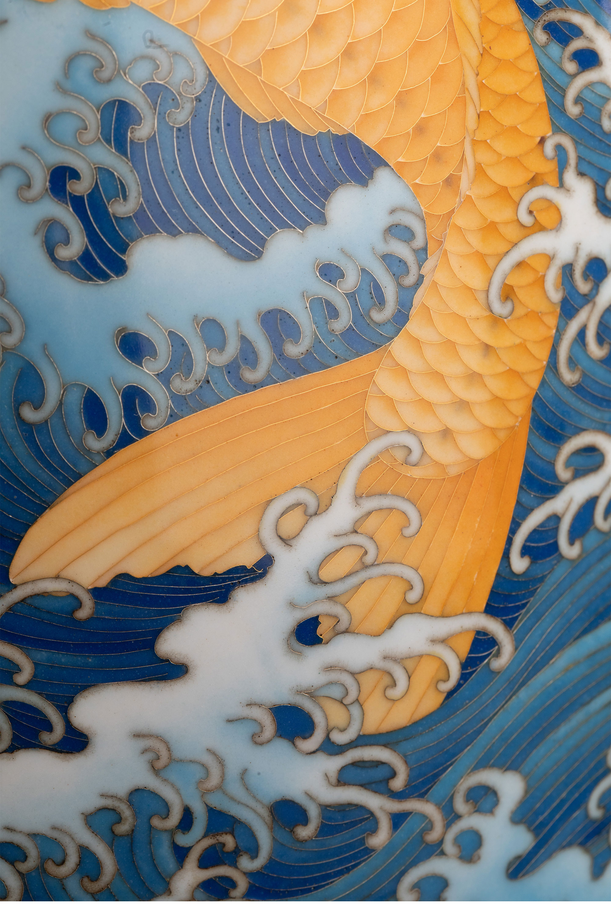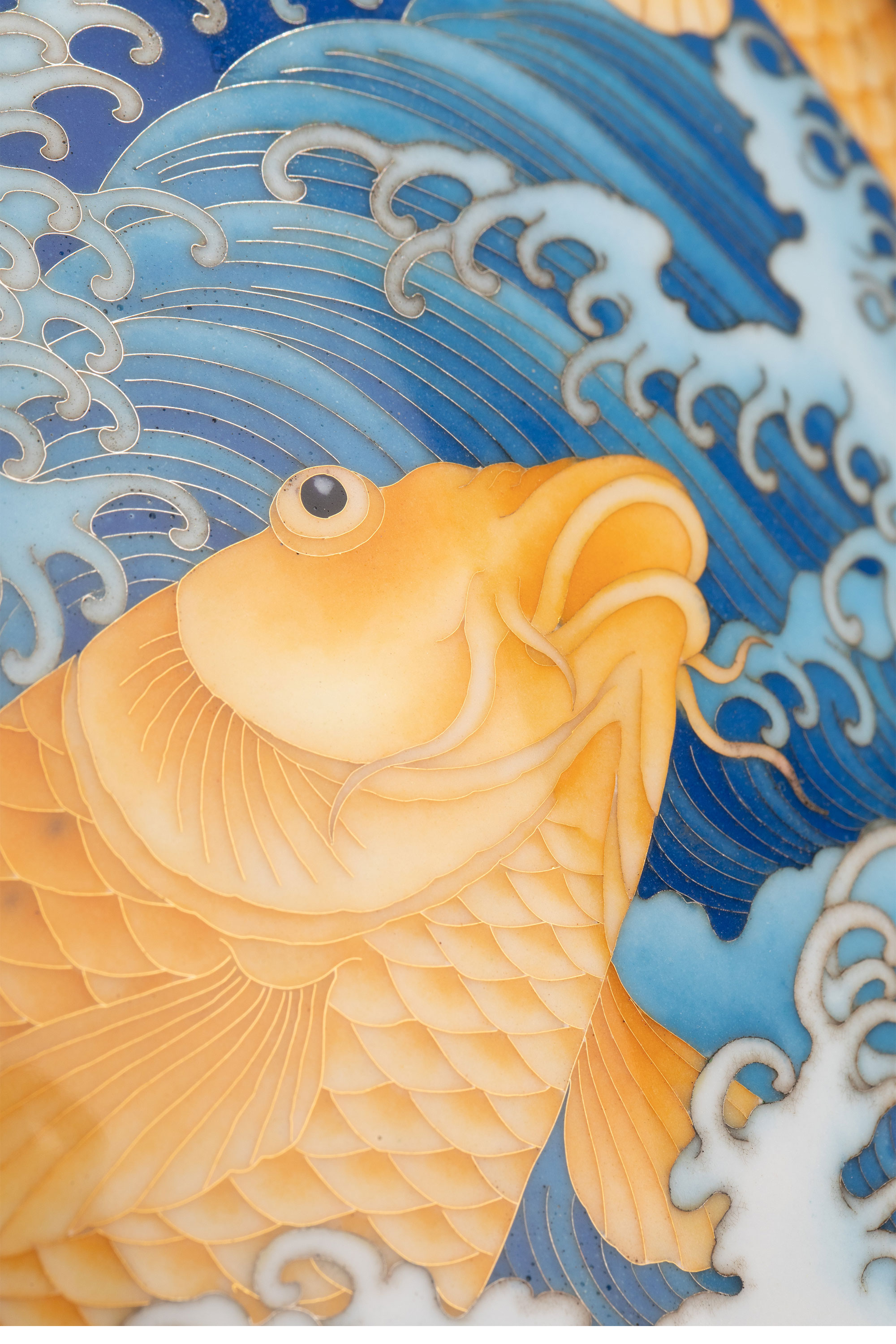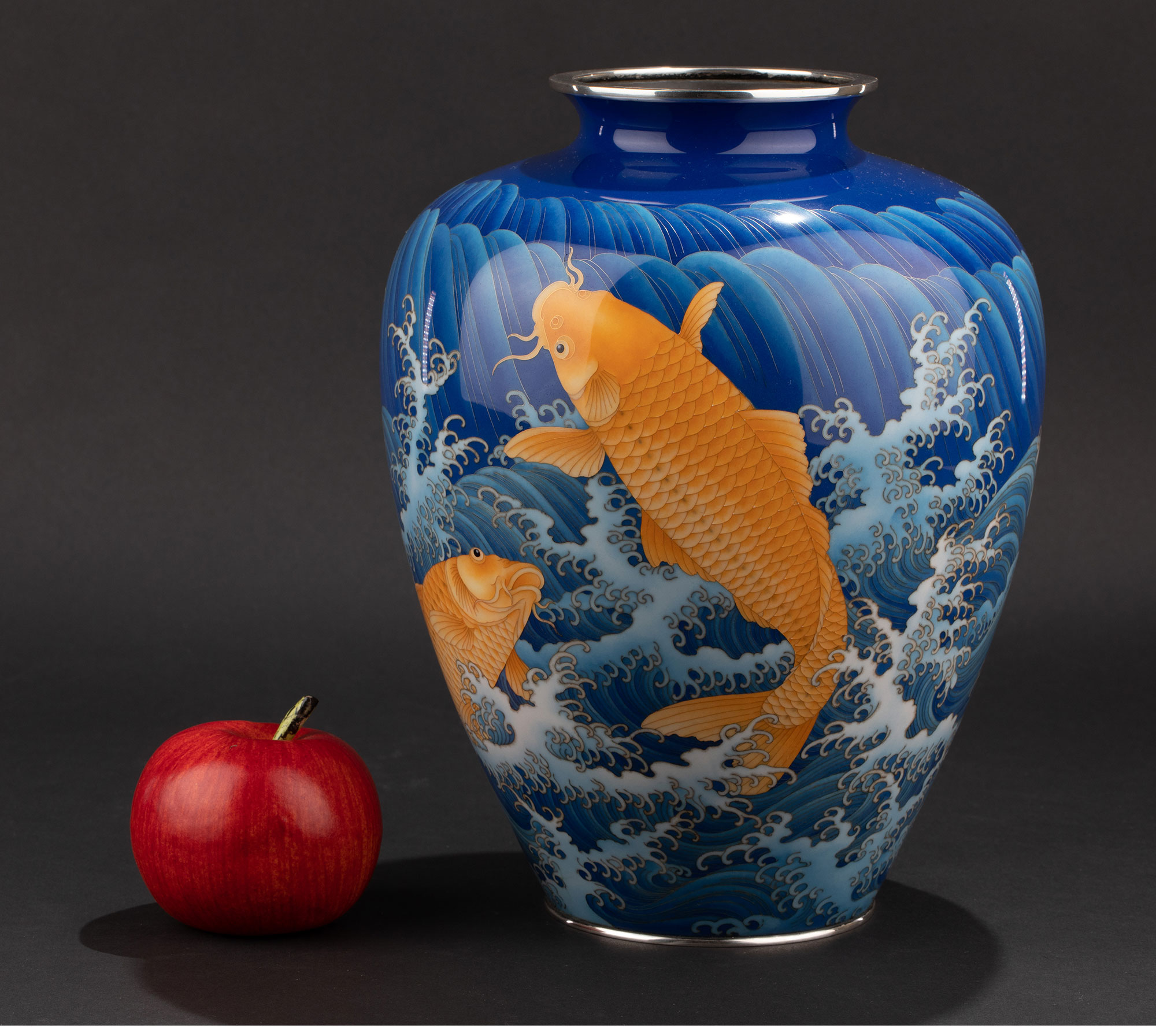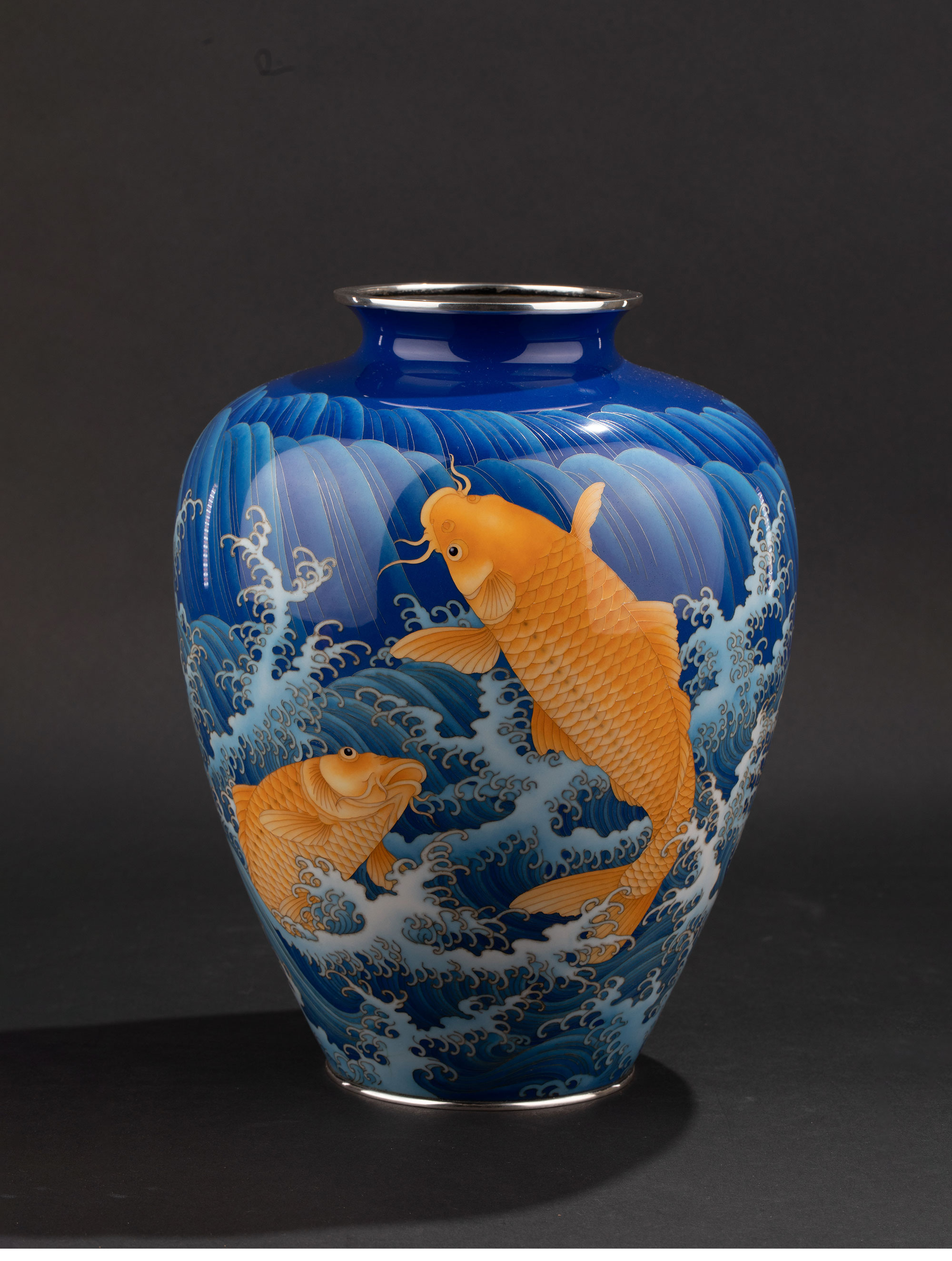 20世纪日本大正时期七宝烧巨匠安藤重兵卫出品「遊鯉」主题纯银胎七宝烧赏瓶 带原木盒