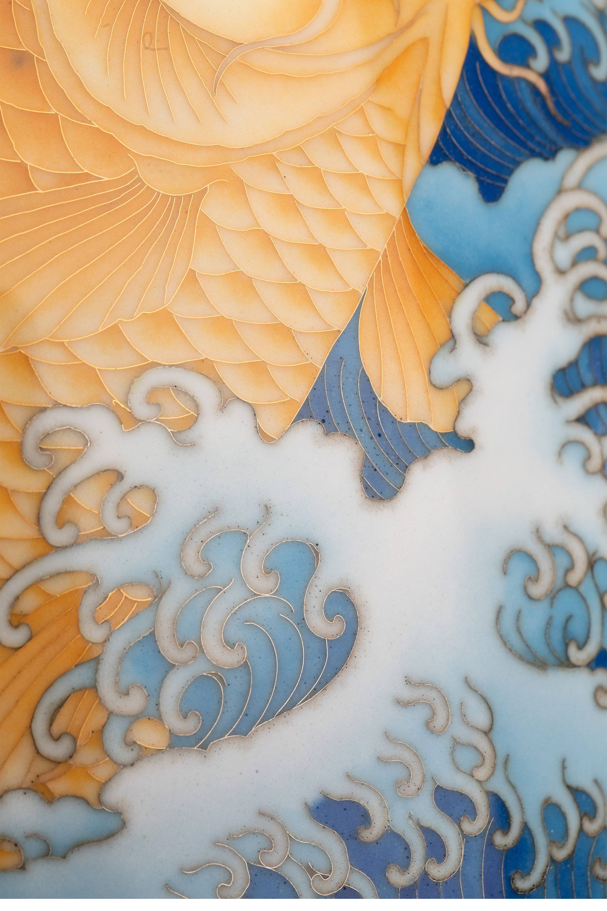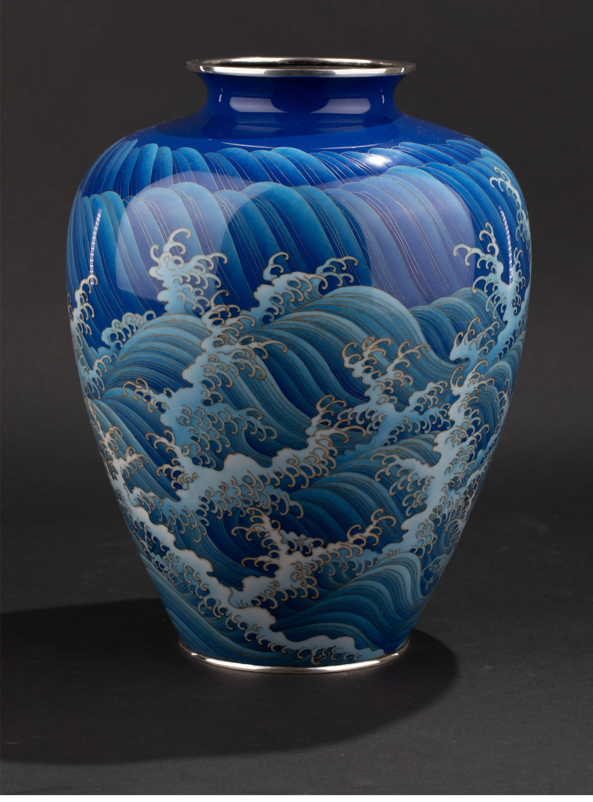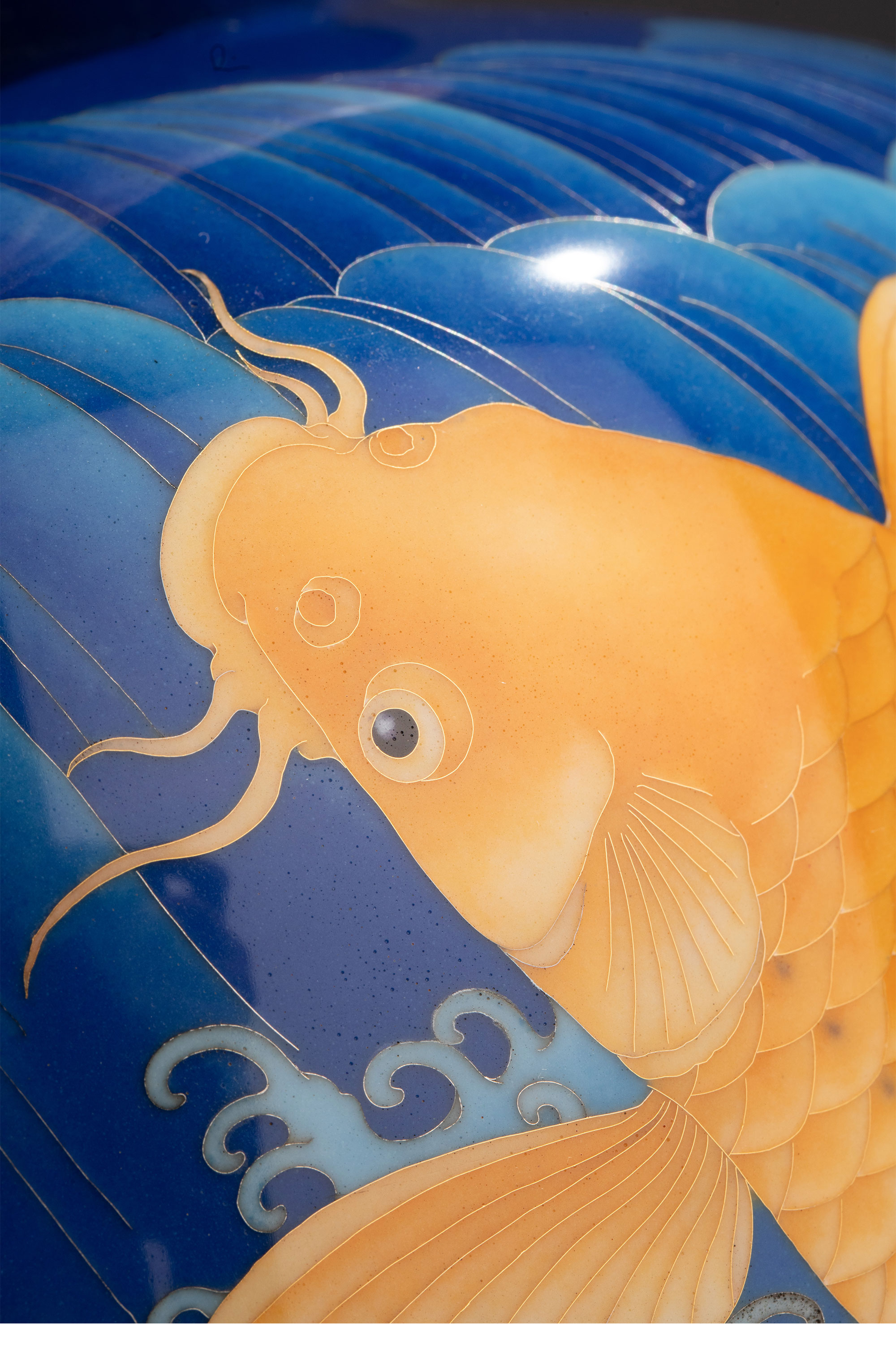 独角鹿西洋古董20世纪日本大正时期七宝烧巨匠安藤重兵卫出品「遊鯉」主题纯银胎七宝烧赏瓶 带原木盒