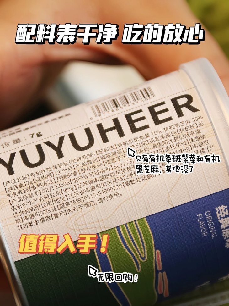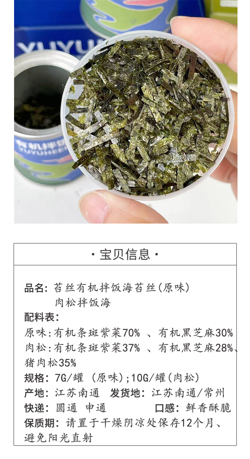 咱们这海苔丝,原料有机优质,口感鲜嫩香脆。坚持鲜味和营养都从食材中来!