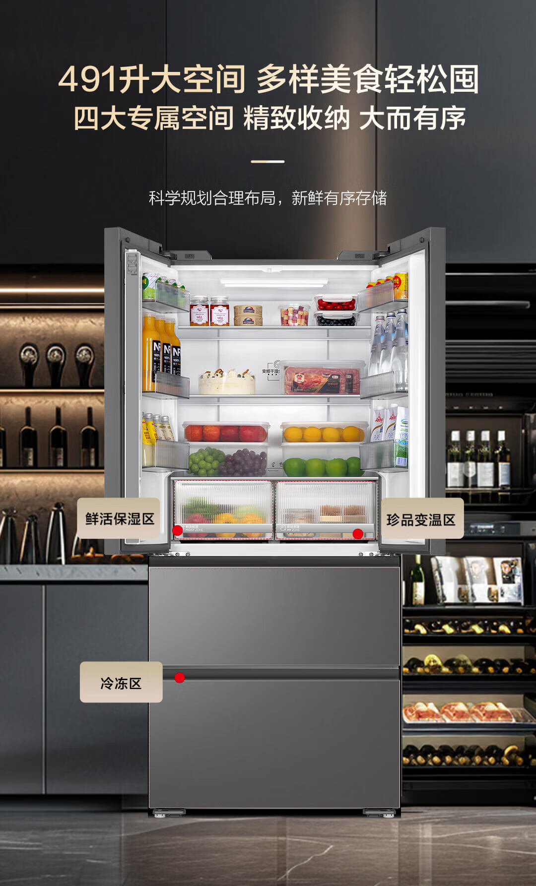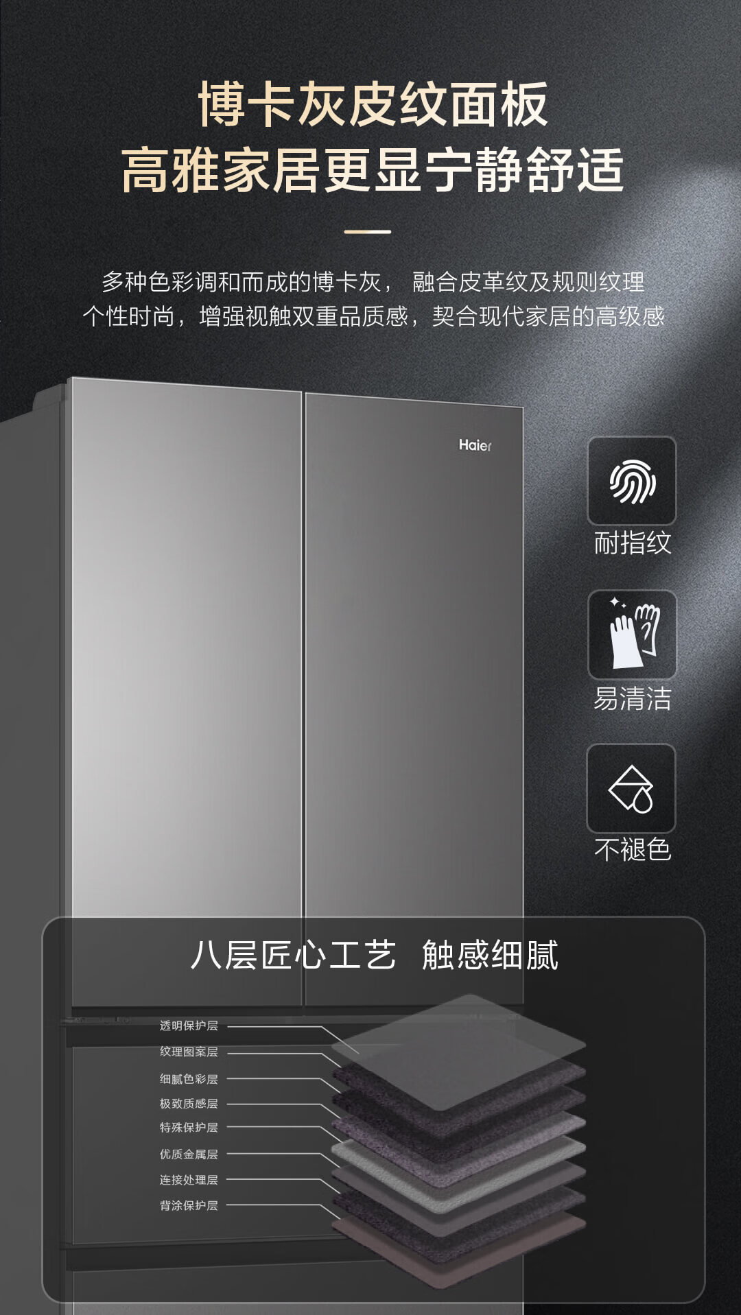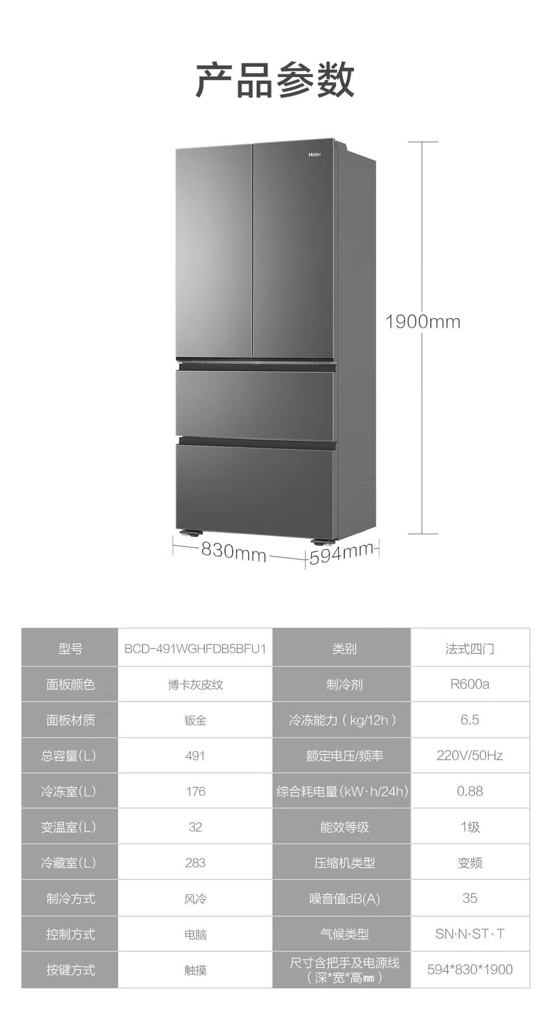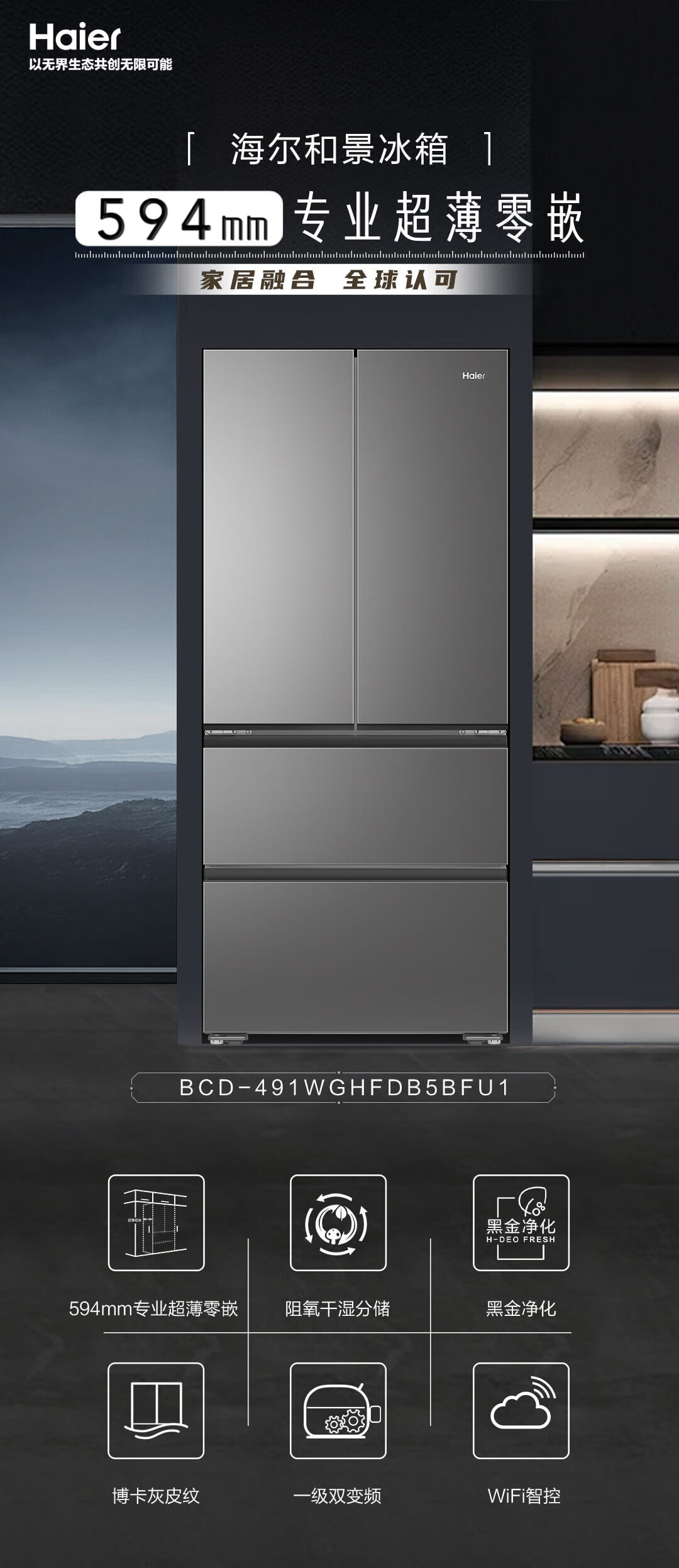 海尔 491L 法式多门家用电冰箱 大容量 前置散热 594mm超薄零嵌 干湿分储 黑金净化 一级双变频 wifi智控 博卡灰皮纹 BCD-491WGHFDB5BFU1