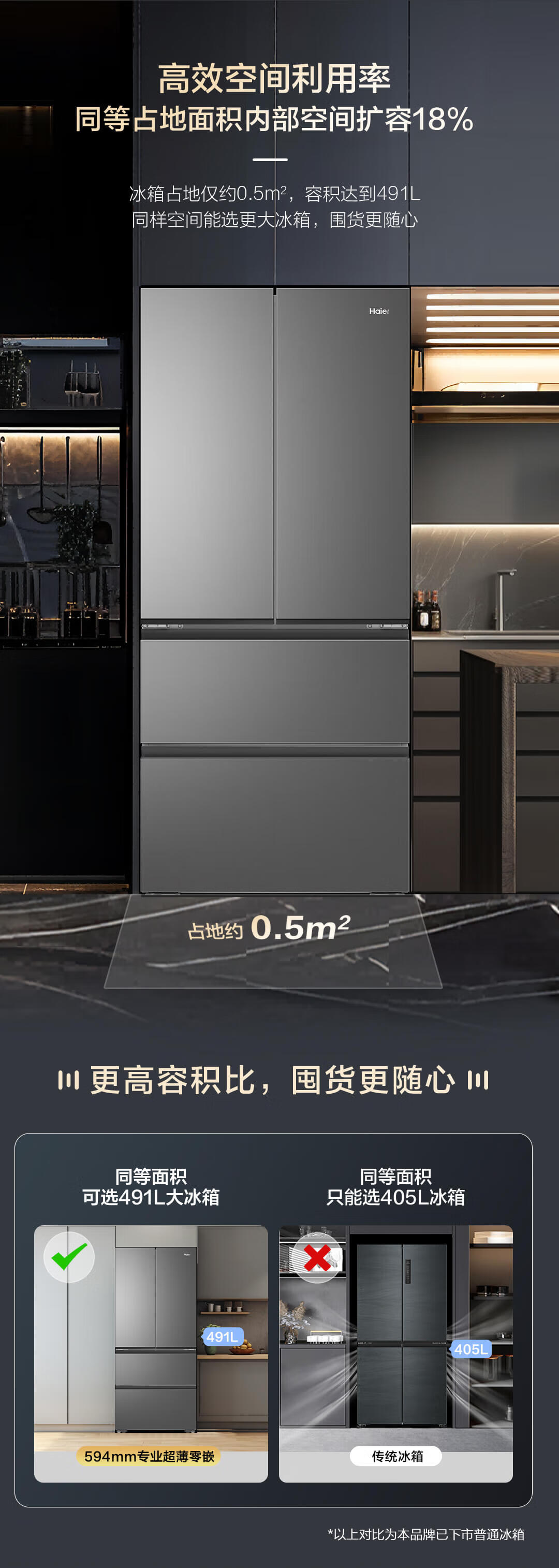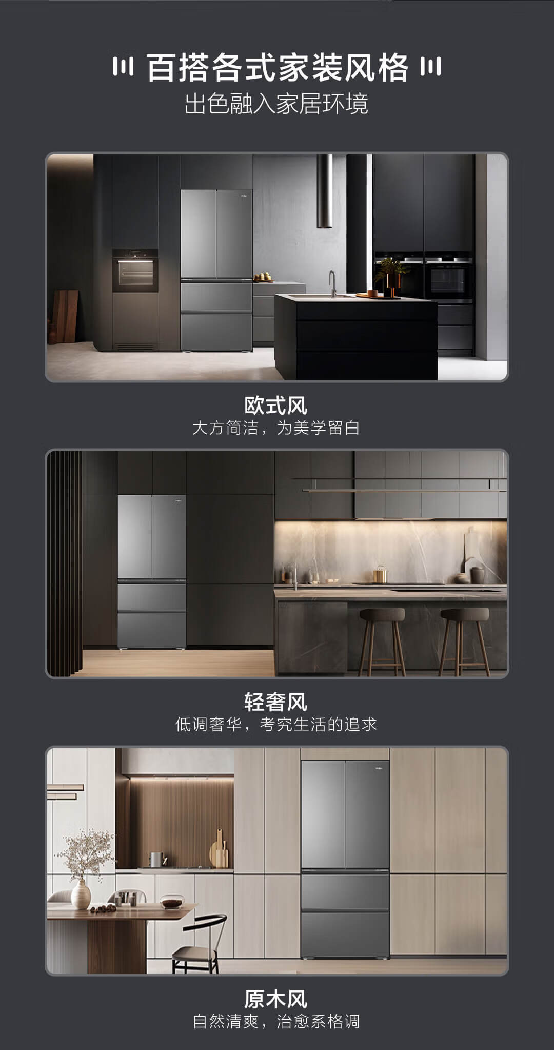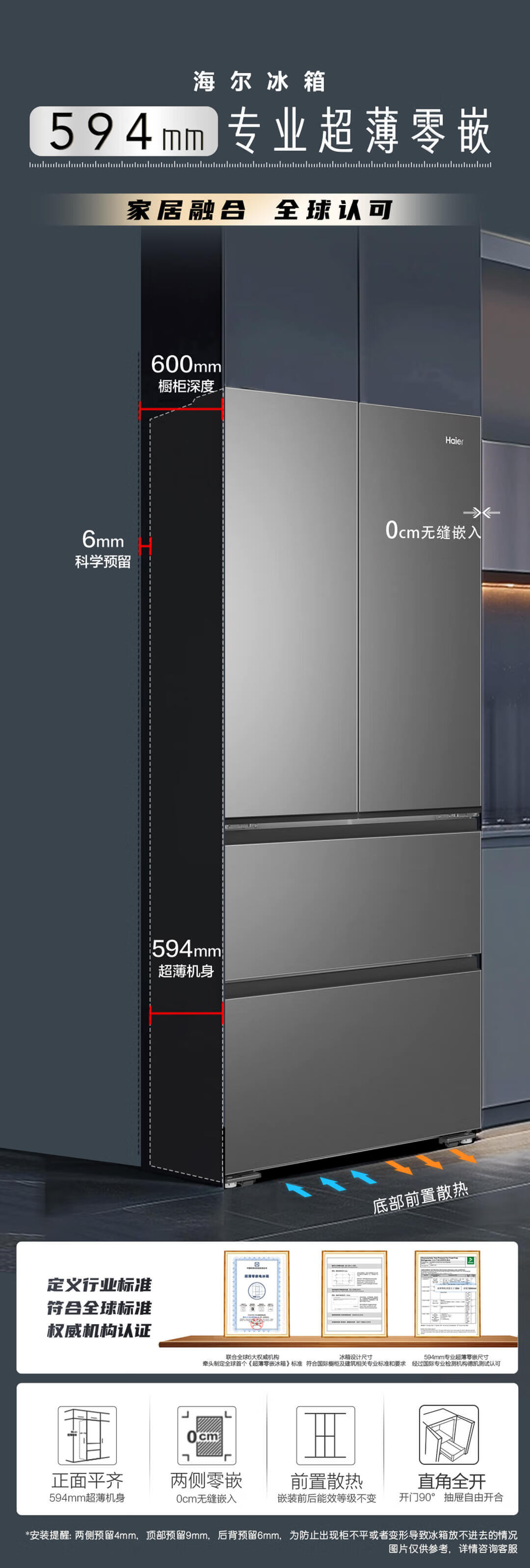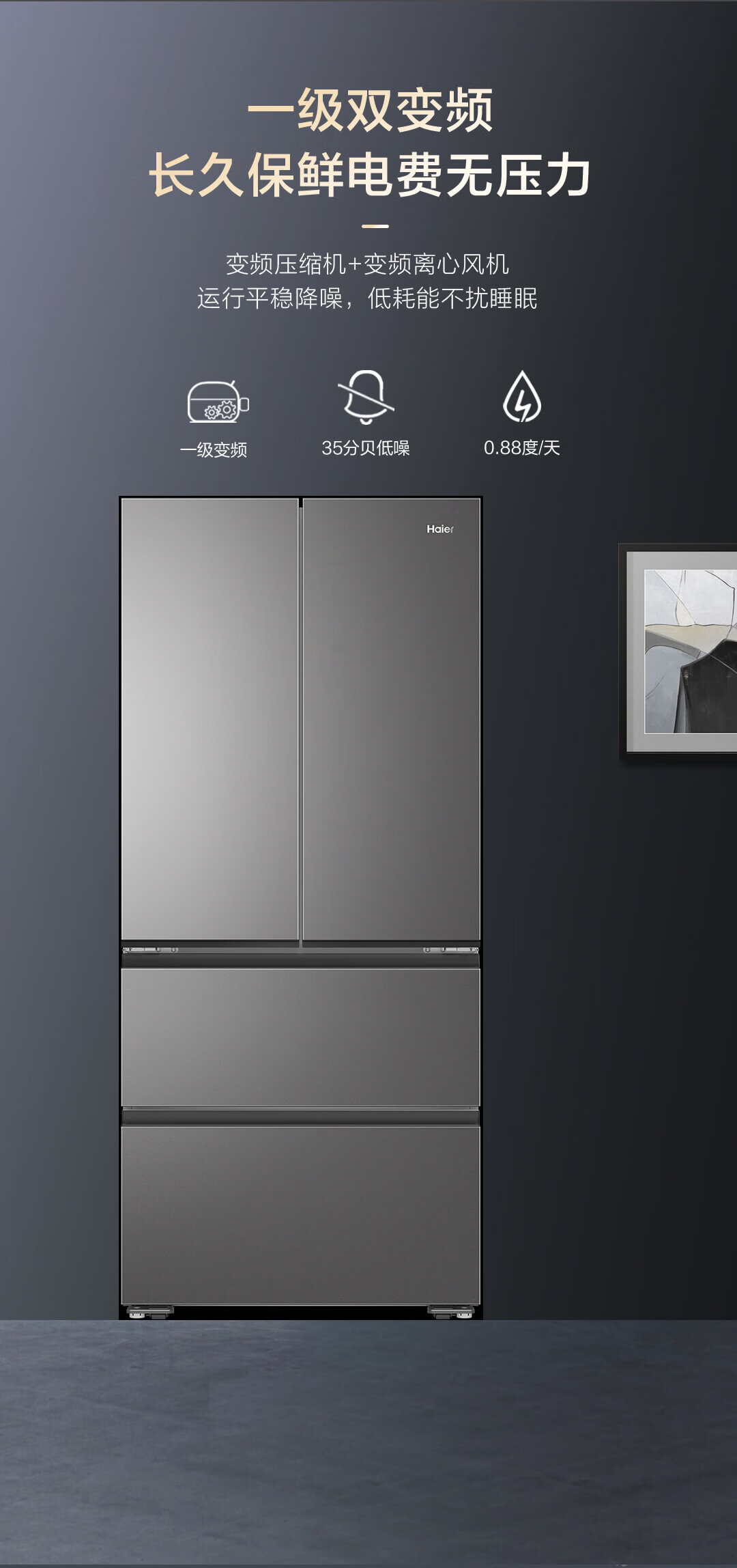 海尔 491L 法式多门家用电冰箱 大容量 前置散热 594mm超薄零嵌 干湿分储 黑金净化 一级双变频 wifi智控 博卡灰皮纹 BCD-491WGHFDB5BFU1