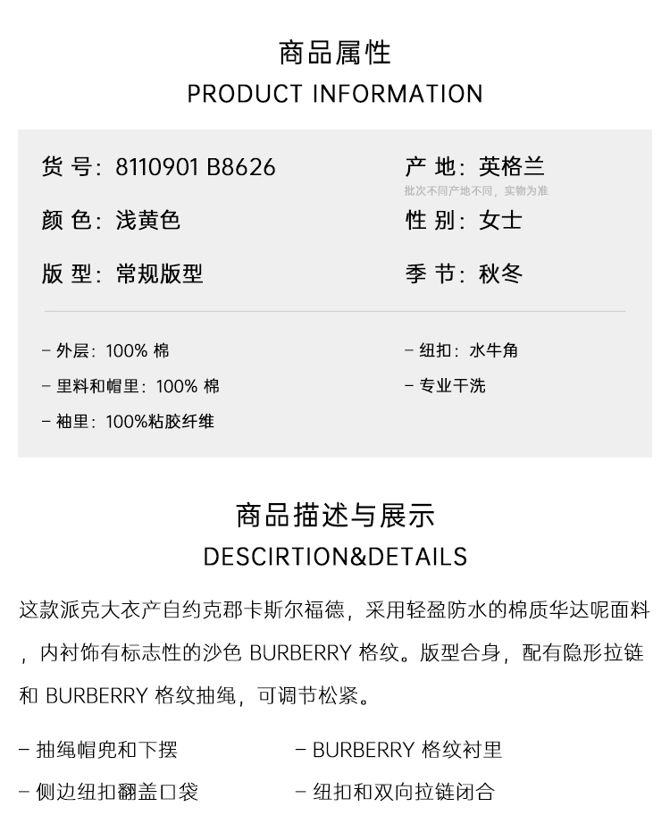 BURBERRY 巴宝莉 女士短款华达呢派克外套 浅黄色 8110901 B8626