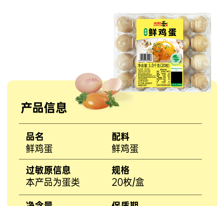 光阳富硒鲜鸡蛋*2盒(1kg/盒 20枚 单枚约50g)生产日期:4月8日 保质期:冷藏30天