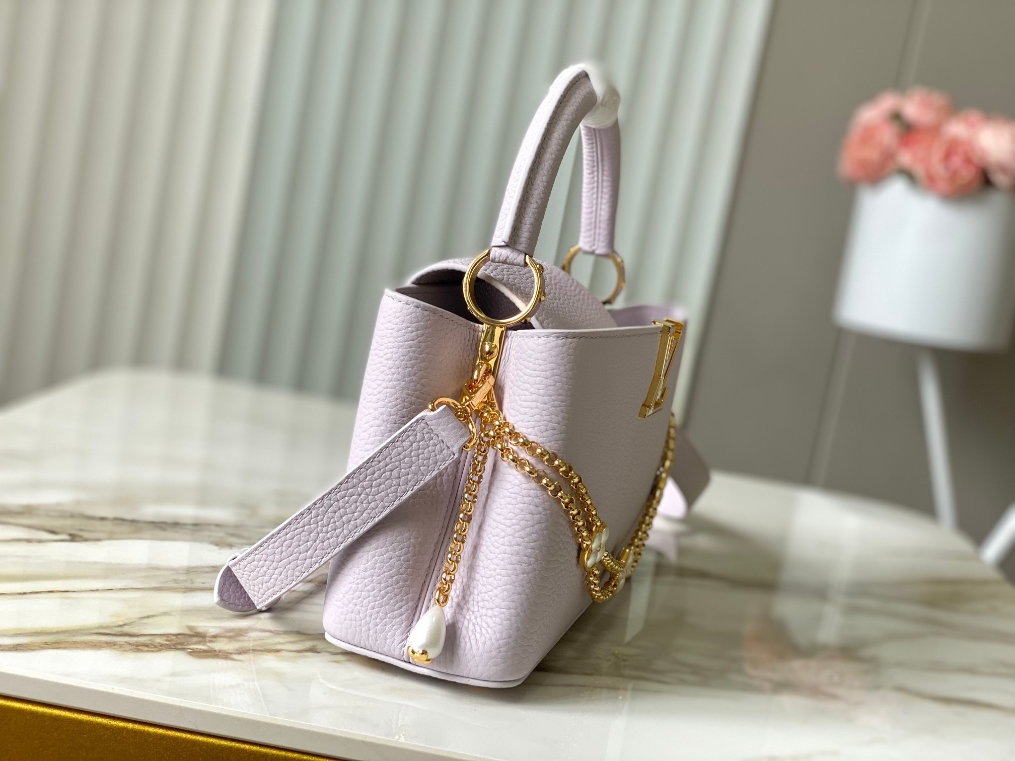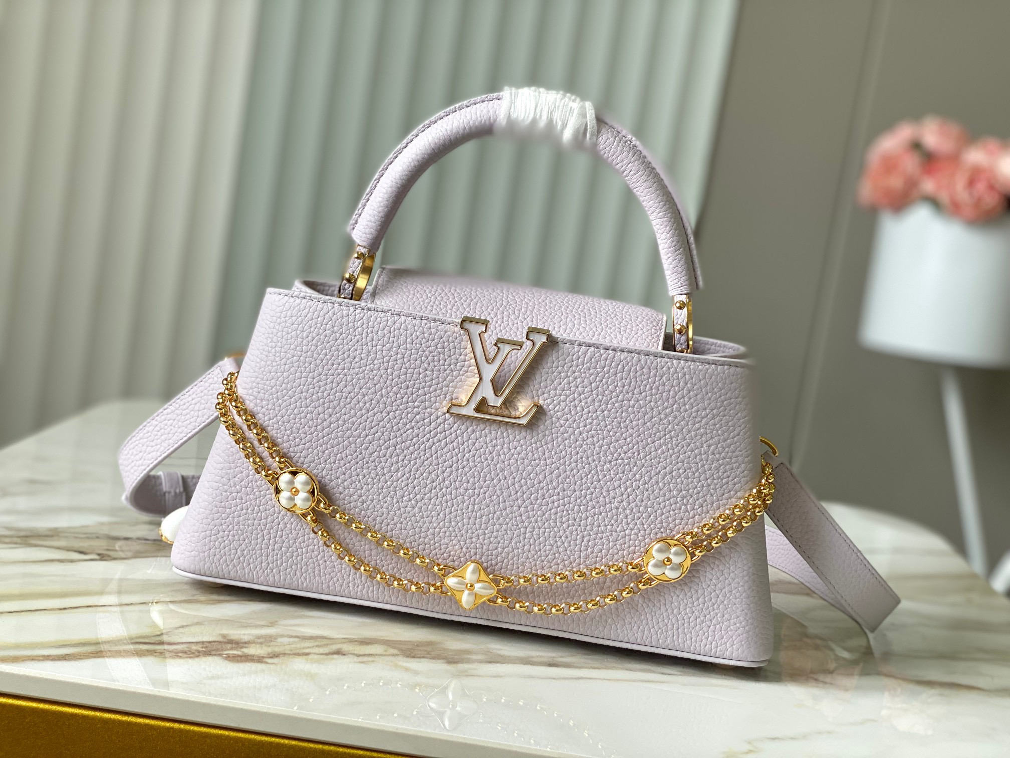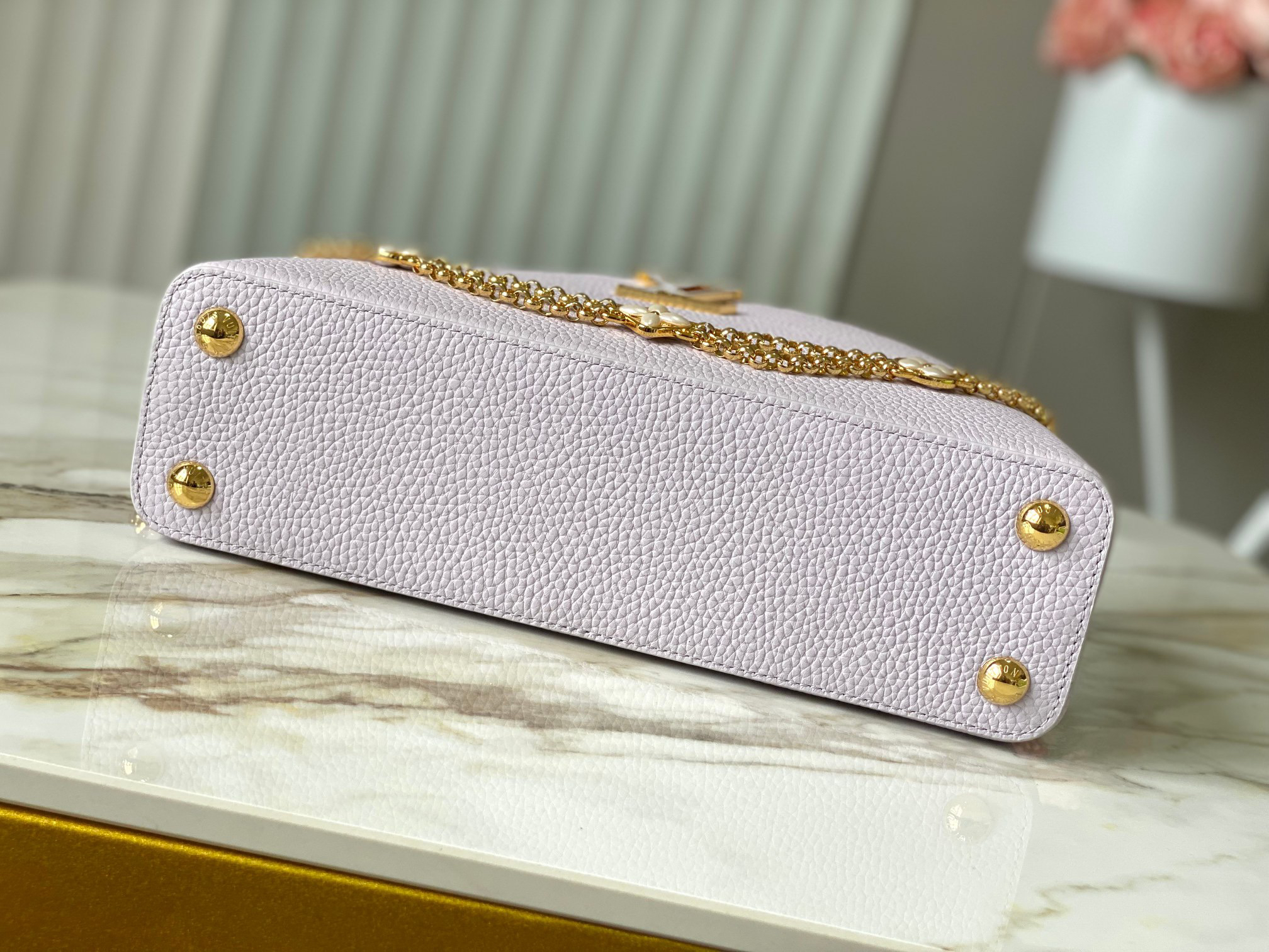 秋冬特惠💰1800 渠道级LV 新品 te级LV 动态芯片 M25476/M48865浅紫珍珠花朵 本款Capucines East-West手袋为Taurillon 牛皮革渲染柔婉色调 讲述Daydream系列的灵感启发 巴洛克风格链条融入贝壳 Monogram 花卉装饰 肩背、斜挎或手提皆宜 Size : 30 * 19 * 9 CM
