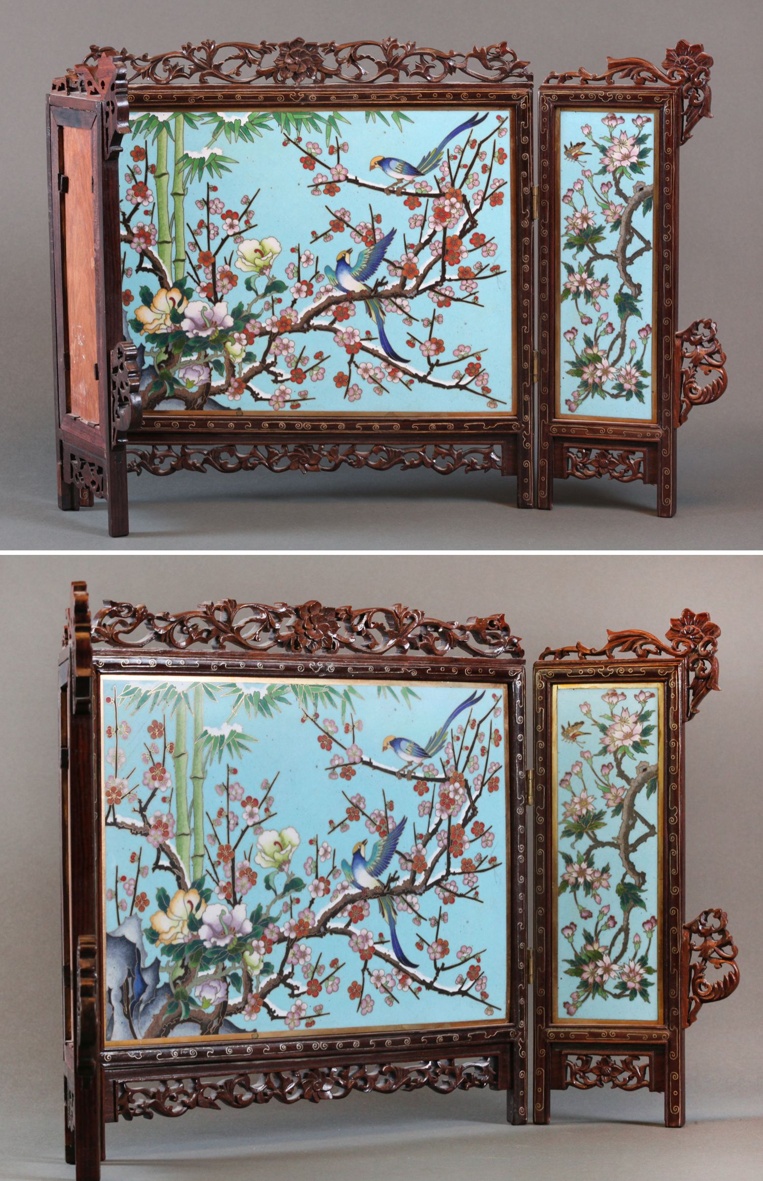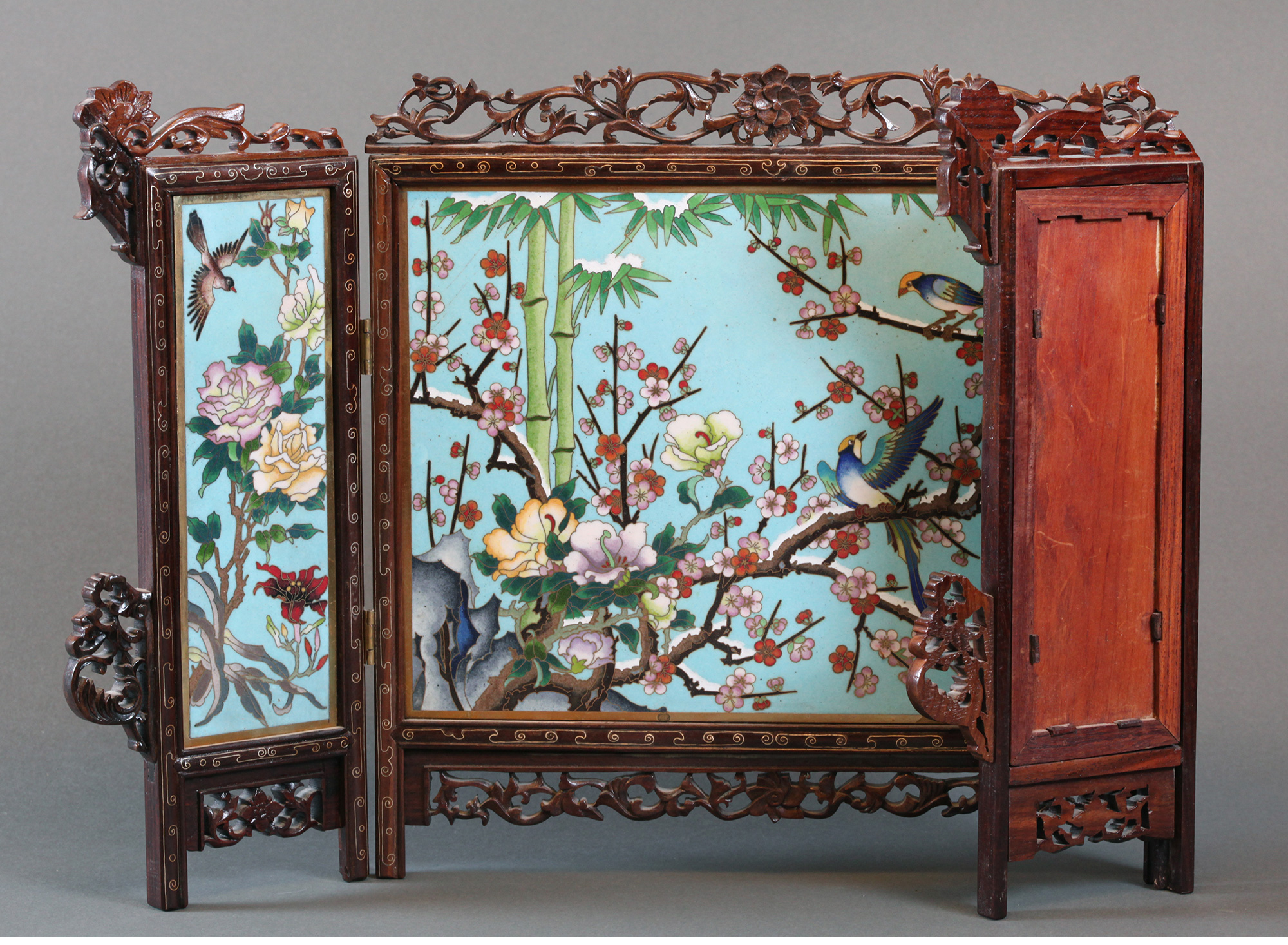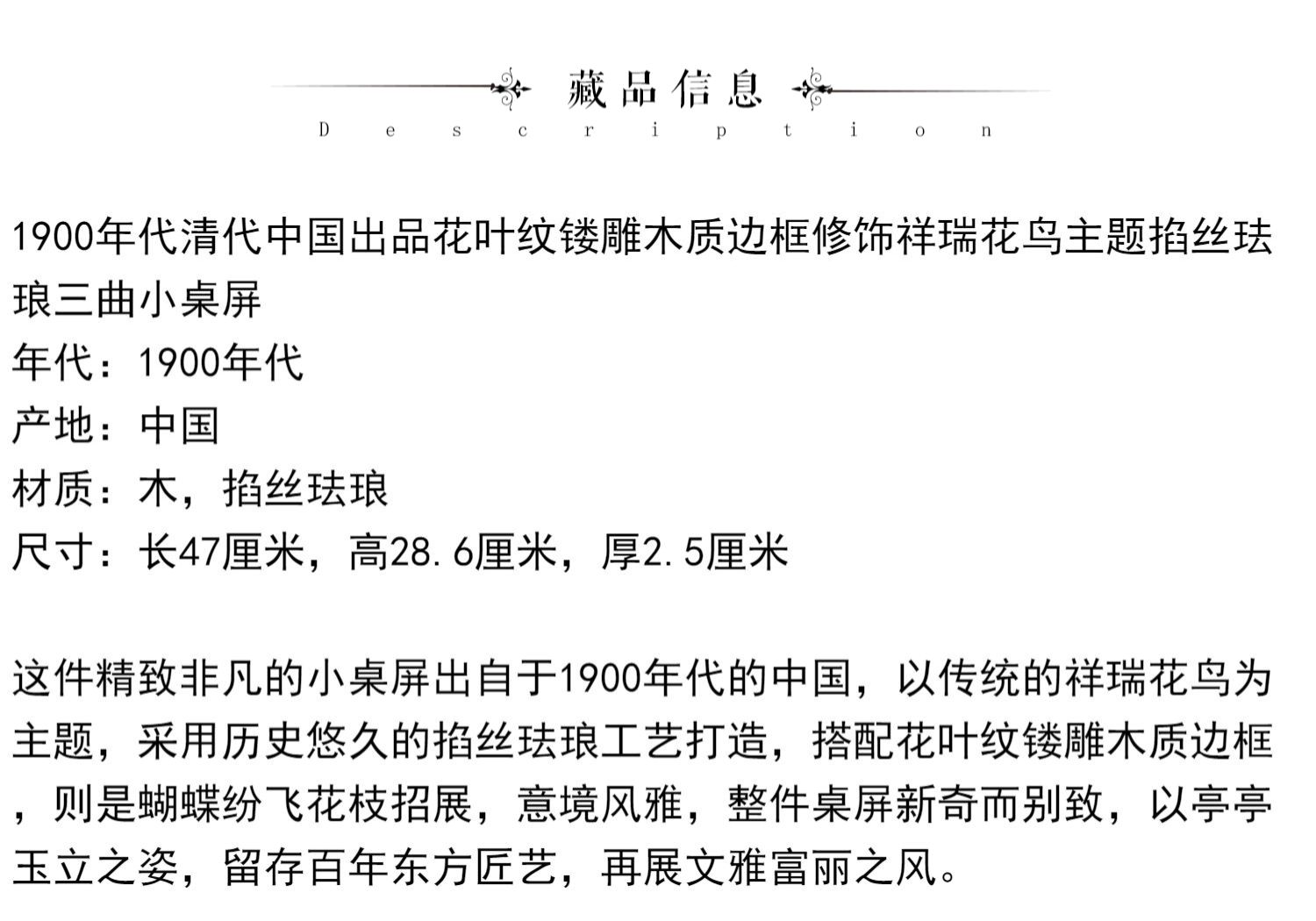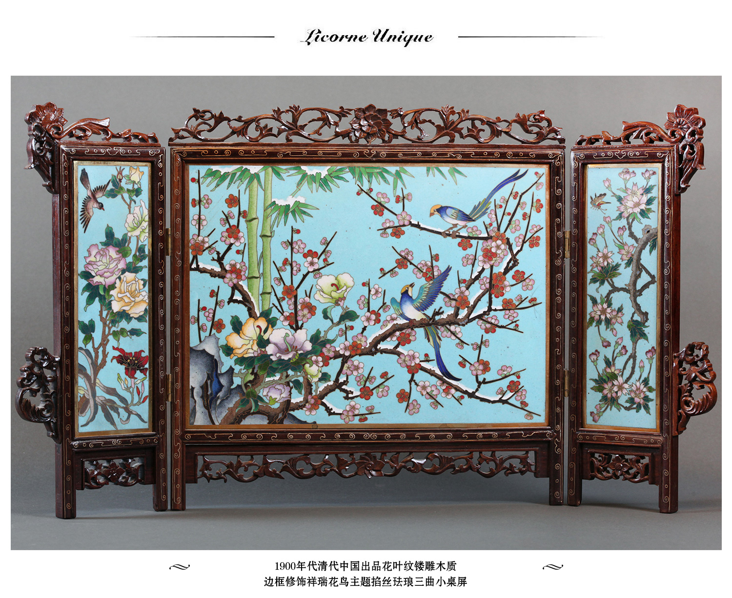 独角鹿西洋古董清代中国花叶纹镂雕木质边框掐丝珐琅三曲小桌屏