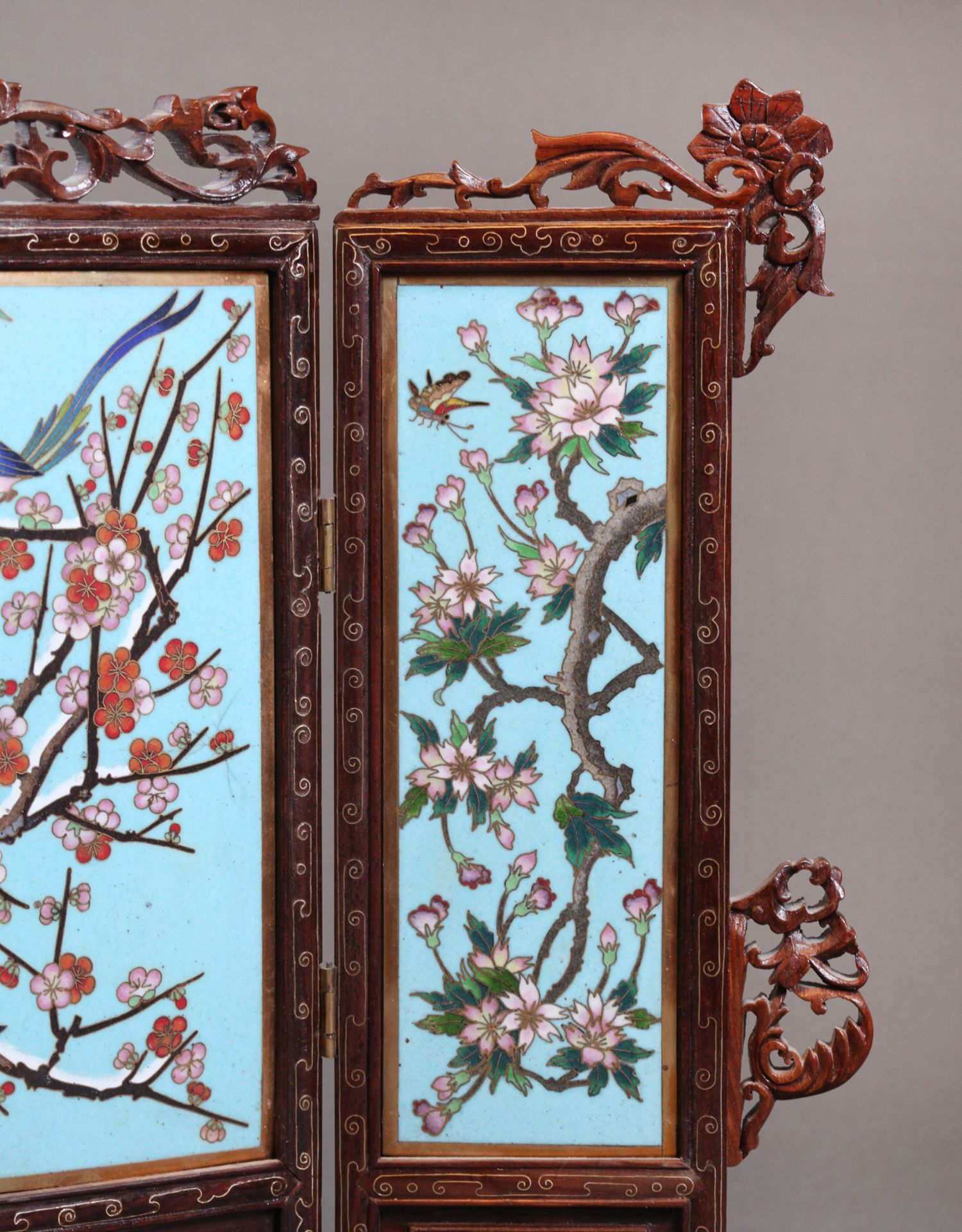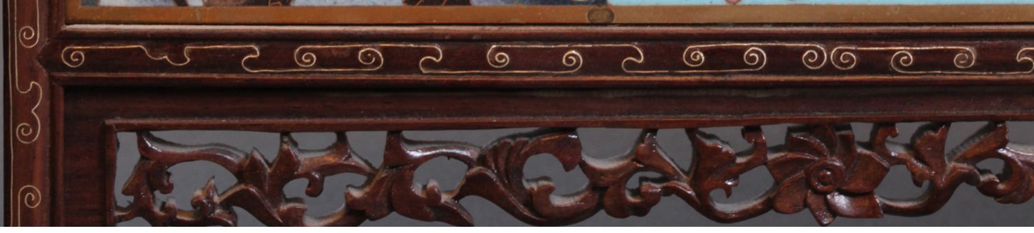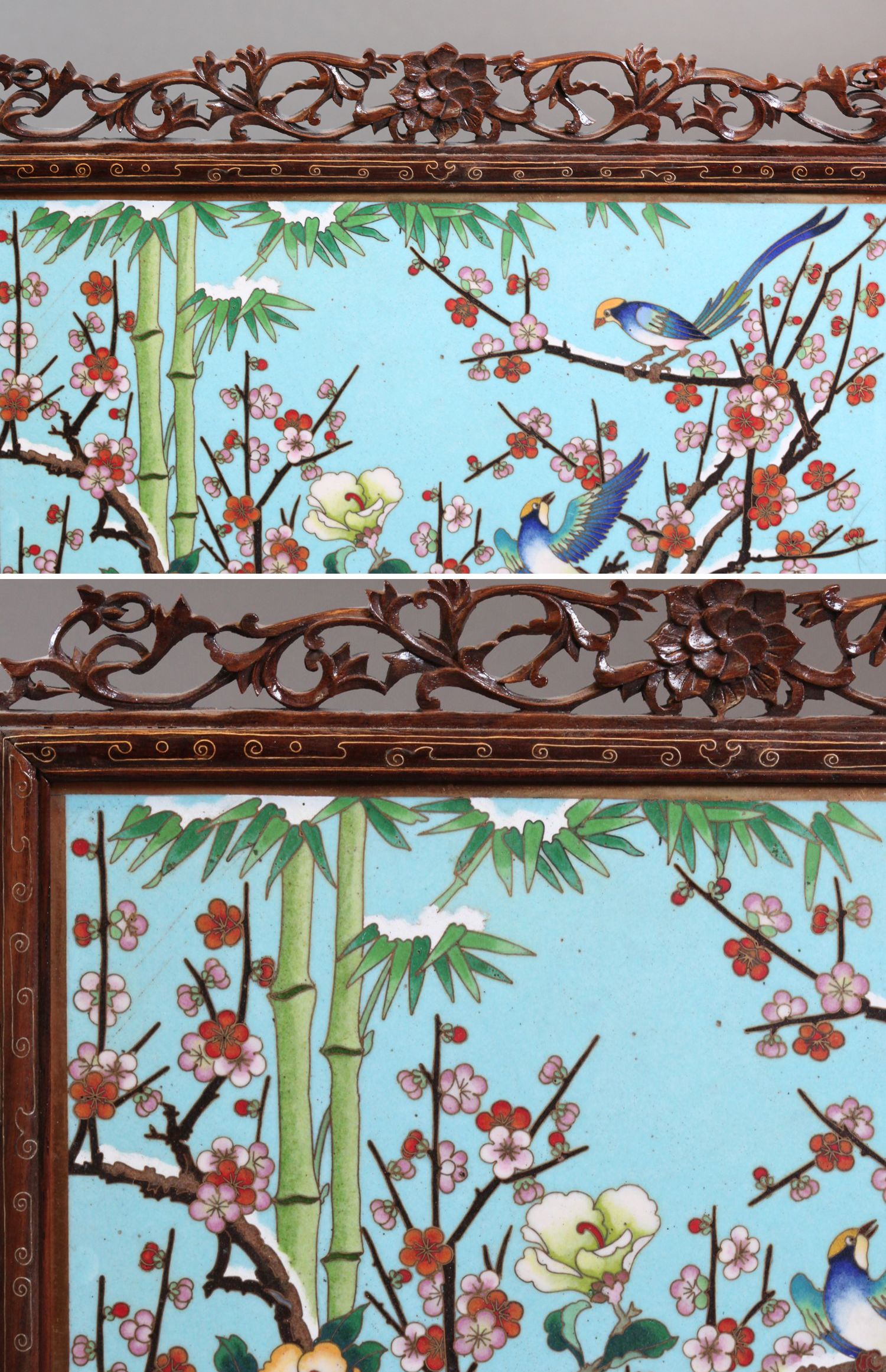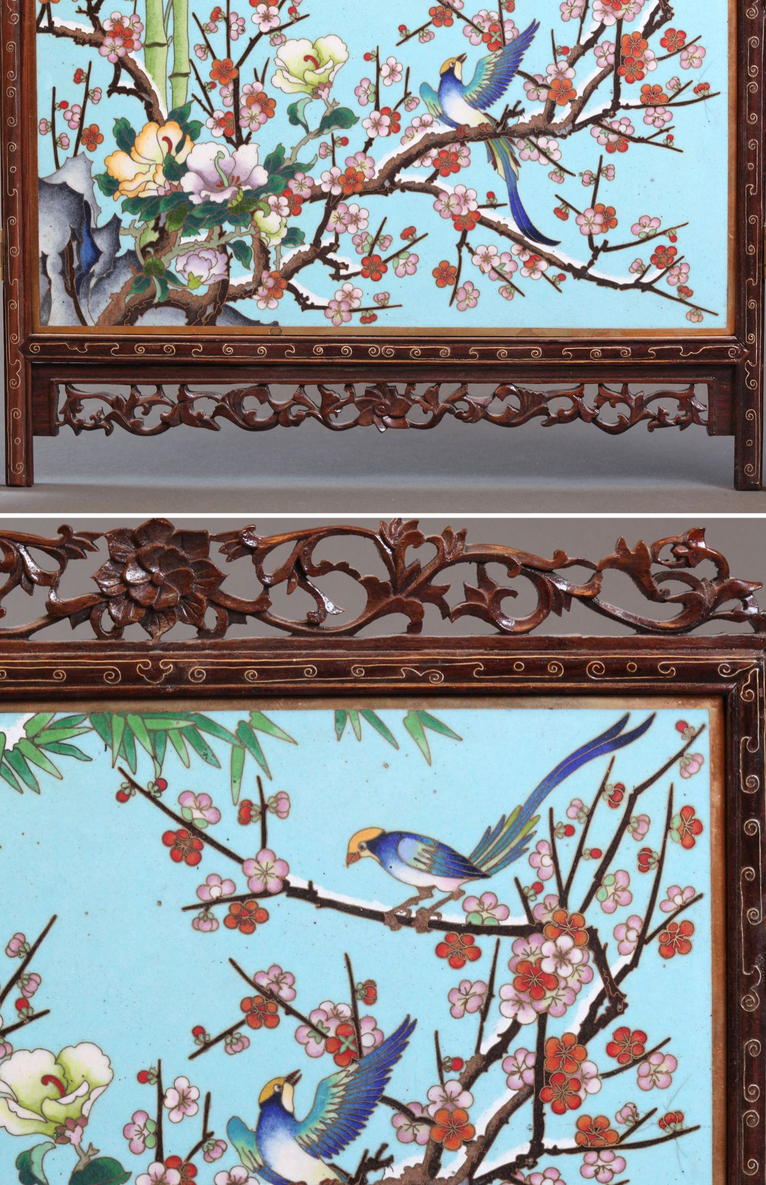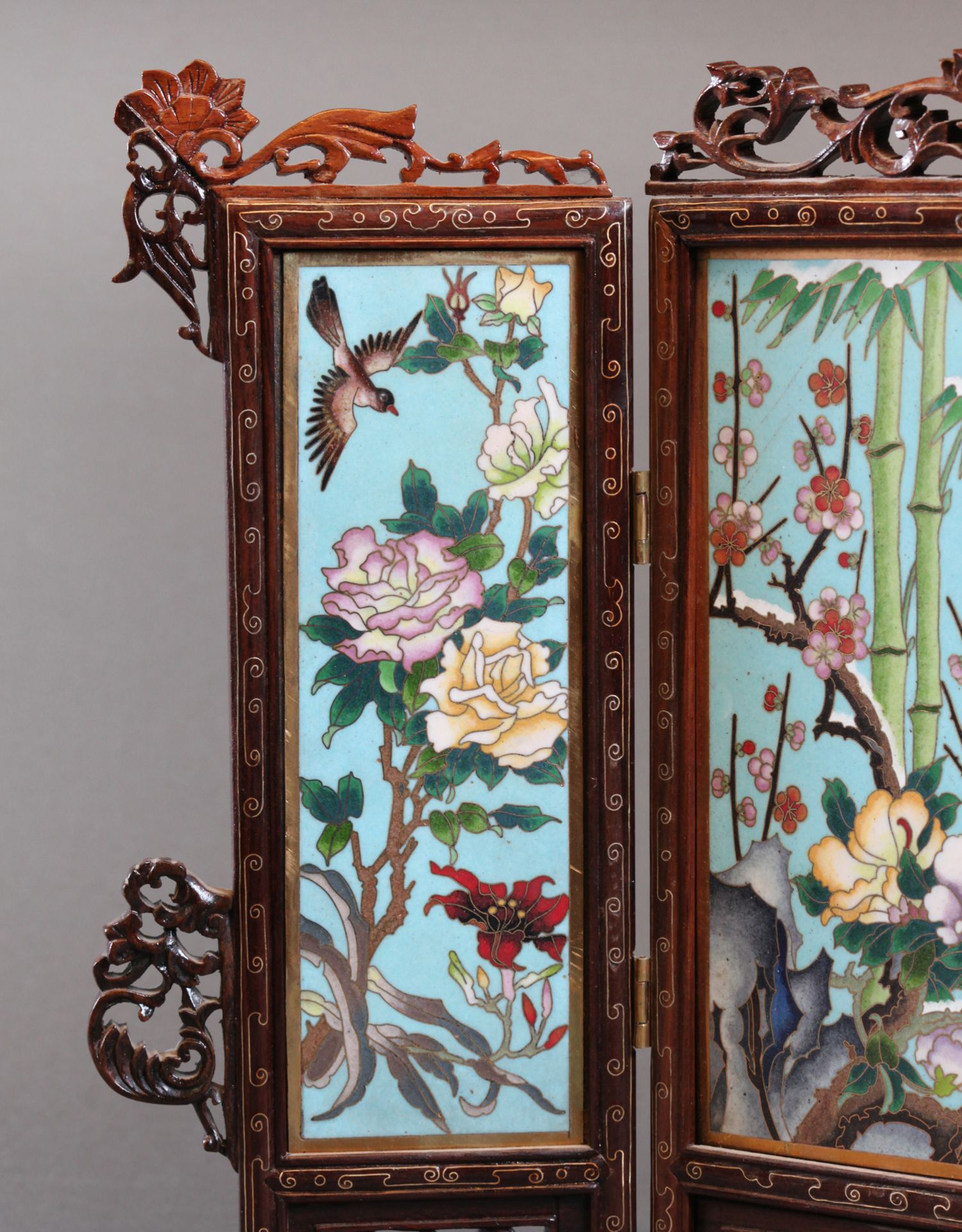 独角鹿西洋古董清代中国花叶纹镂雕木质边框掐丝珐琅三曲小桌屏