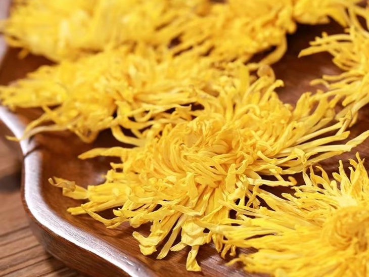 买回家怎么泡?王心豹给出心得:每次取一朵干菊花,花托朝上放入杯中,倒入开水,等整朵花“吃透”水后,再翻转过来,花芯朝上,就可得到一杯“美、香、甜、润”的菊花茶了。