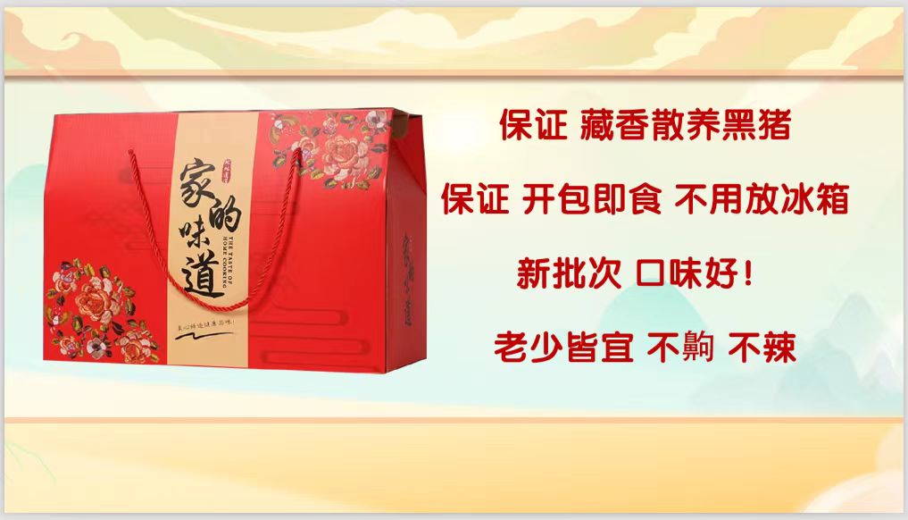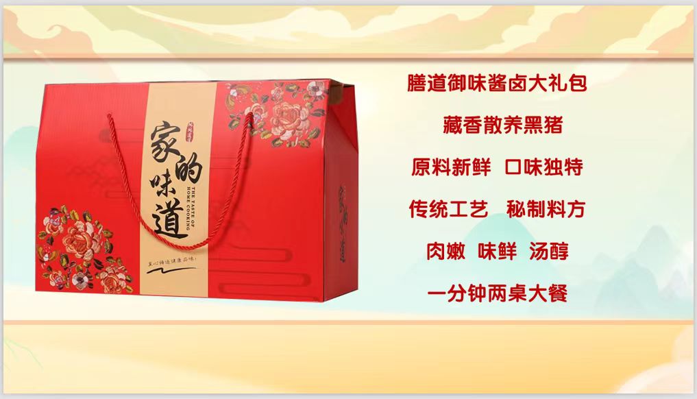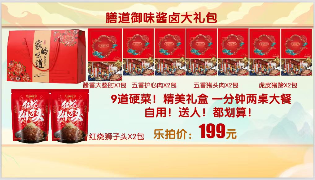酱香猪肘子700克/袋*1、五香护心肉120克/袋*2、五香猪头肉200克/袋*2、虎皮猪蹄150克/袋*2、红烧狮子头300克/袋*2