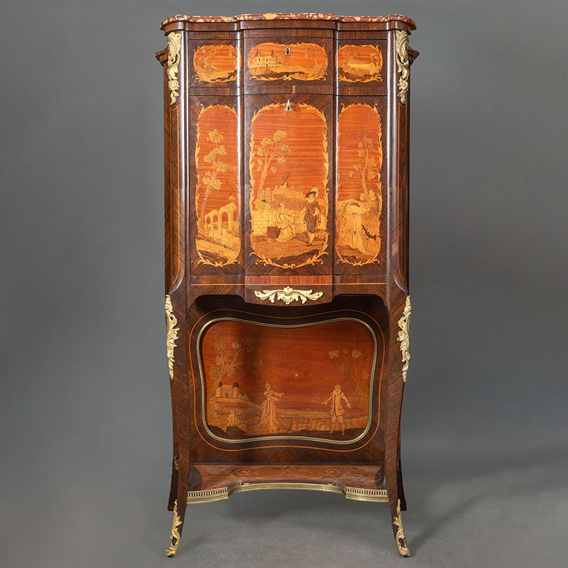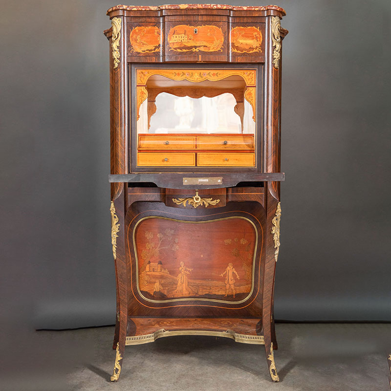 1850-1870年代法国拿破仑三世时期出品铜鎏金雕饰贵族游乐主题细木镶嵌大理石饰面秘书柜