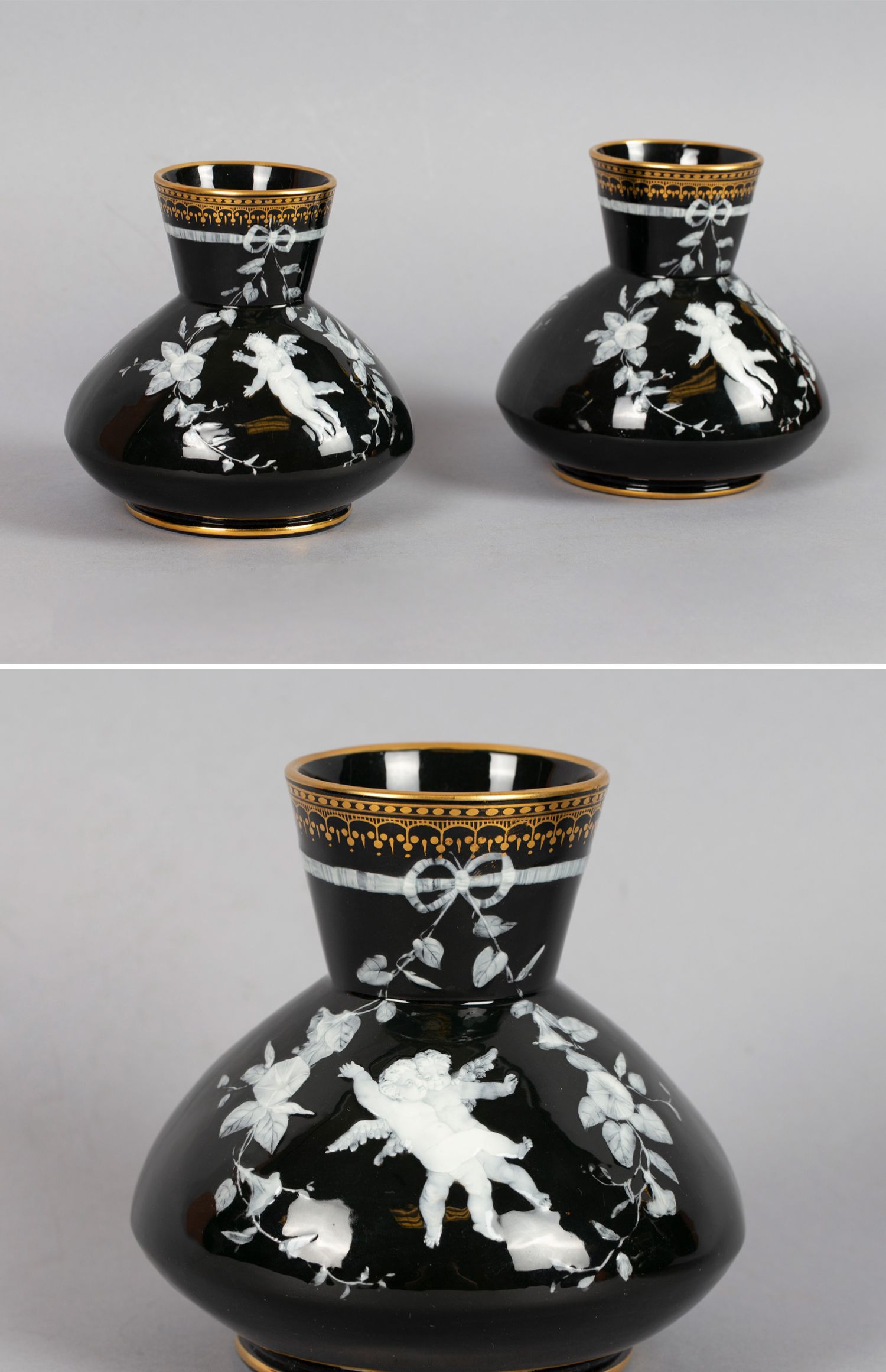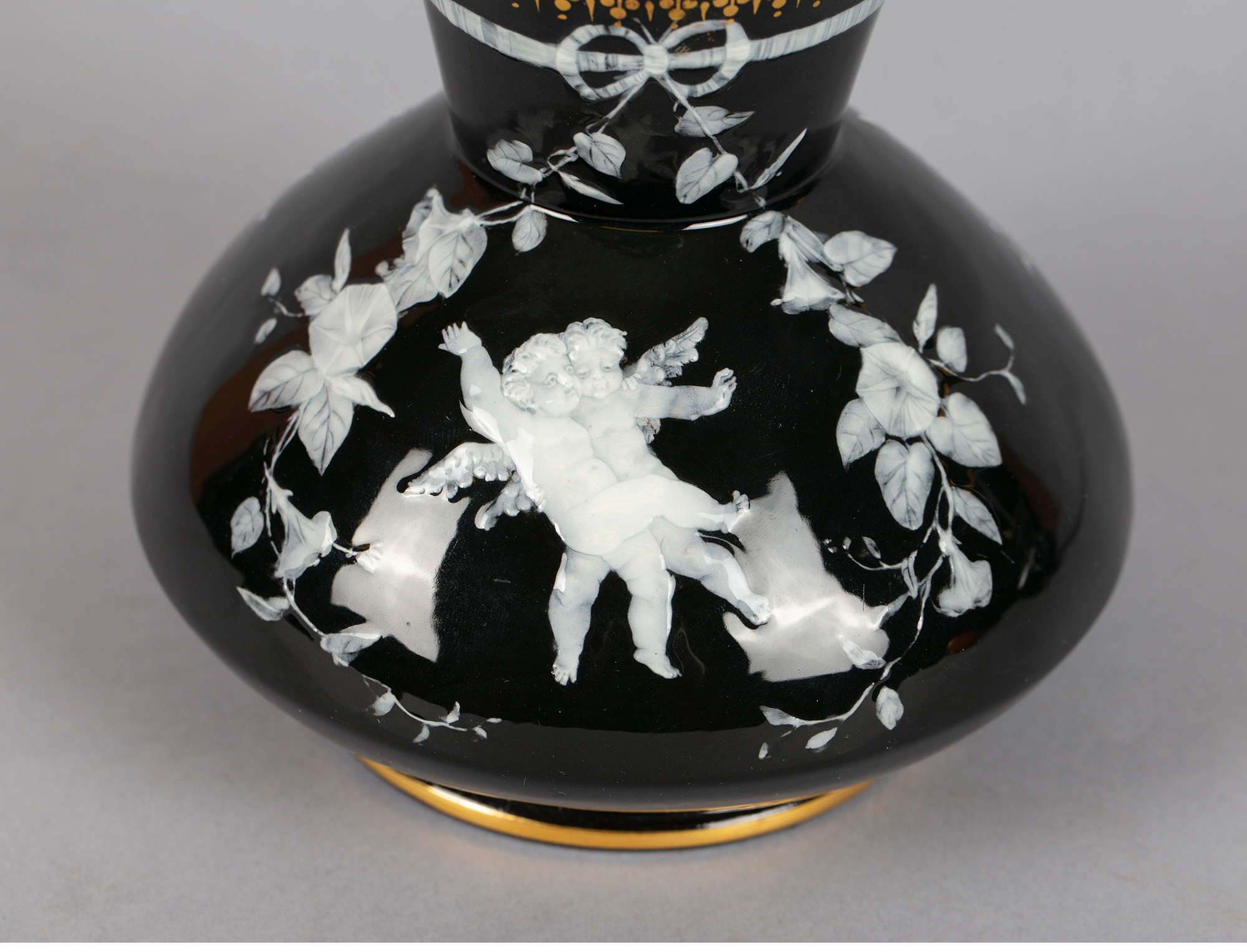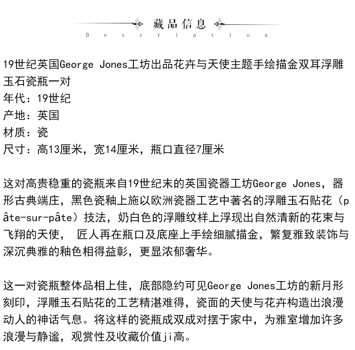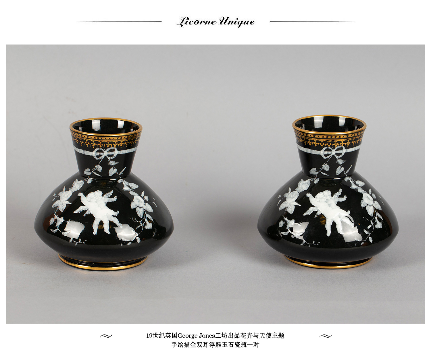 独角鹿西洋古董瓷器G.Jones花卉天使手绘描金双耳浮雕玉石瓷瓶对