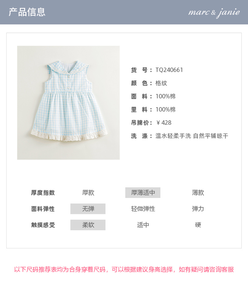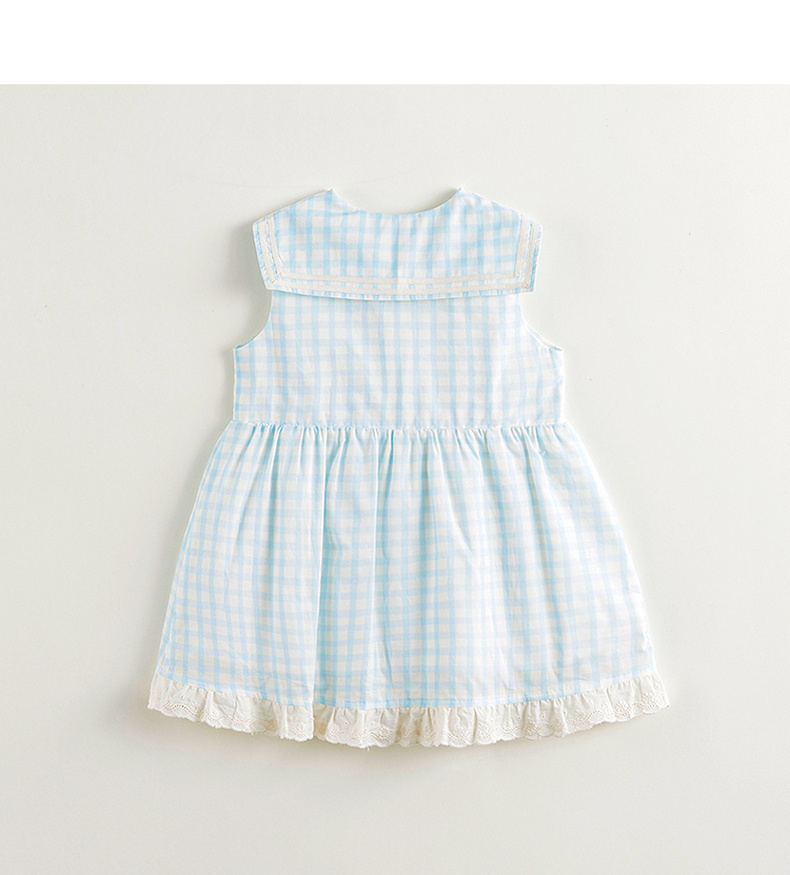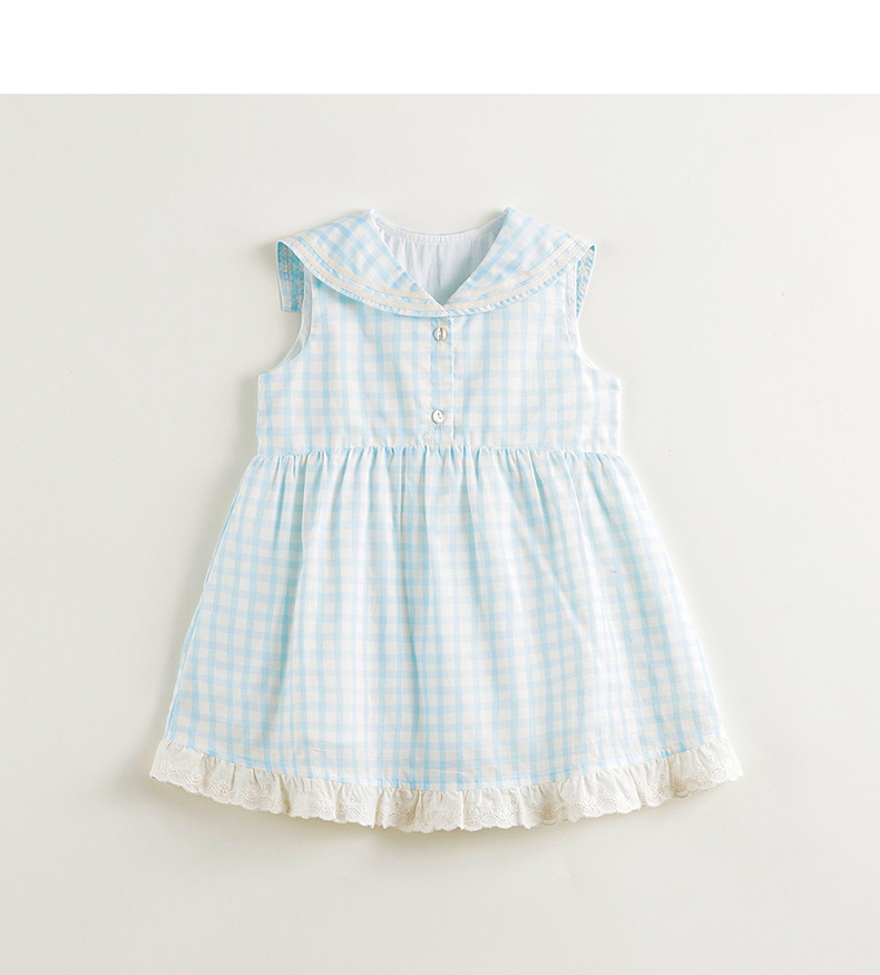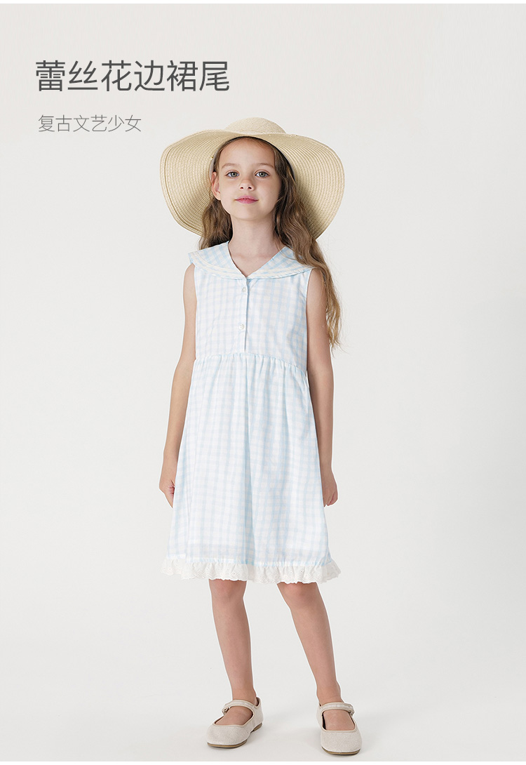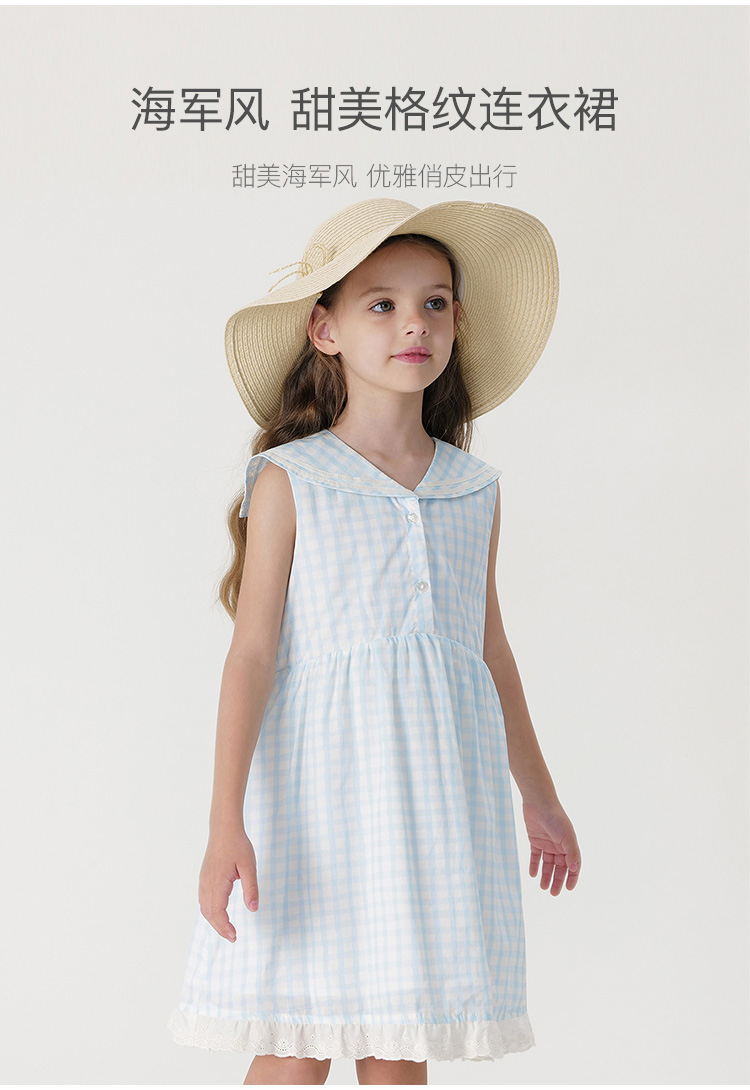 马克珍妮2024年夏装新款女童海军风格纹蕾丝花边短袖连衣裙240661