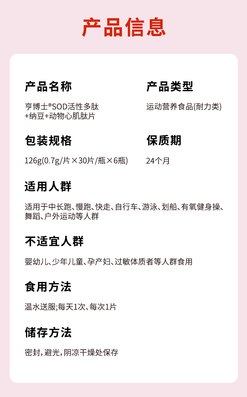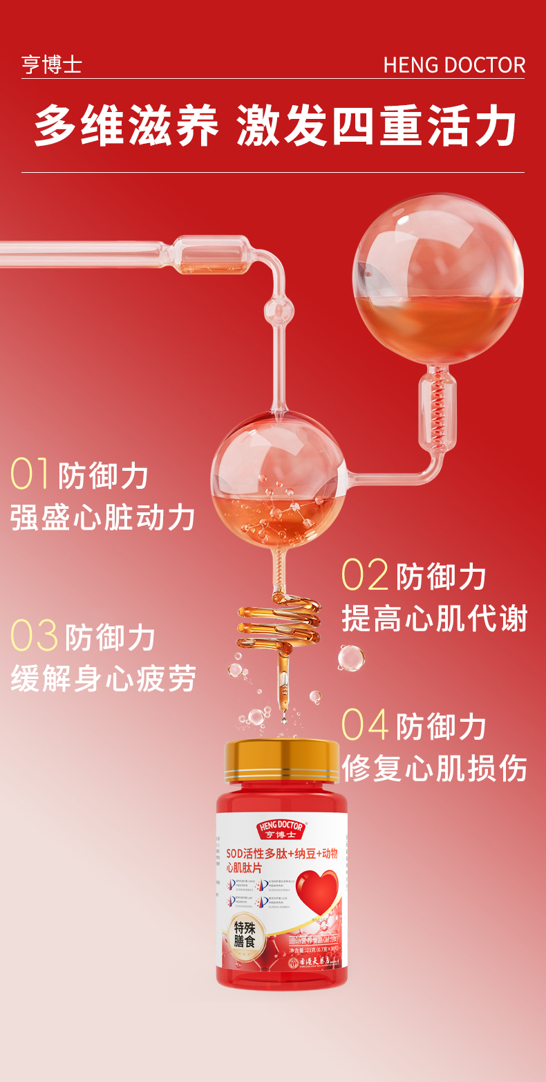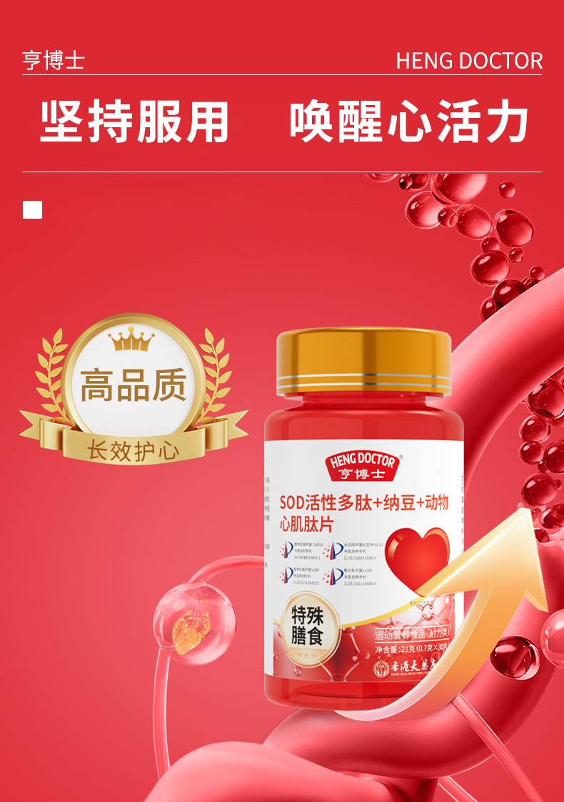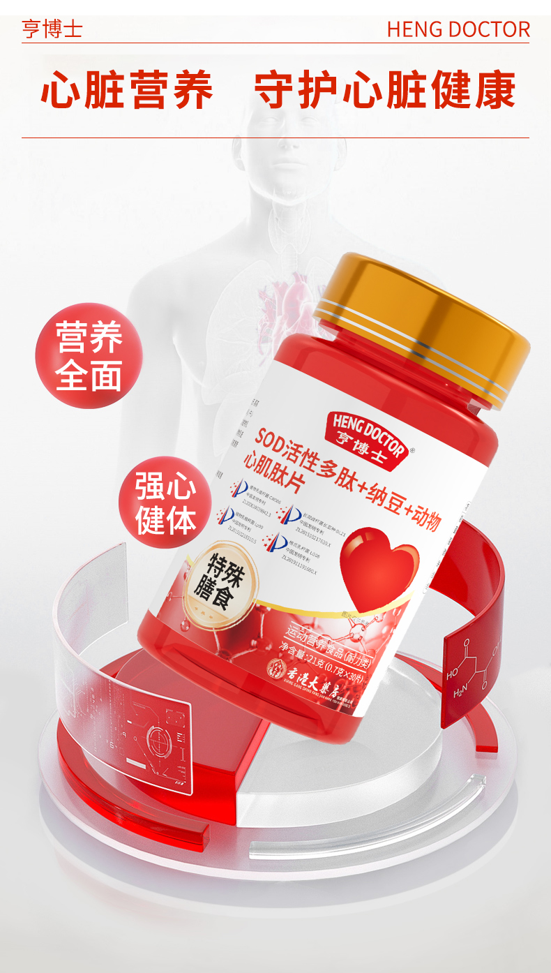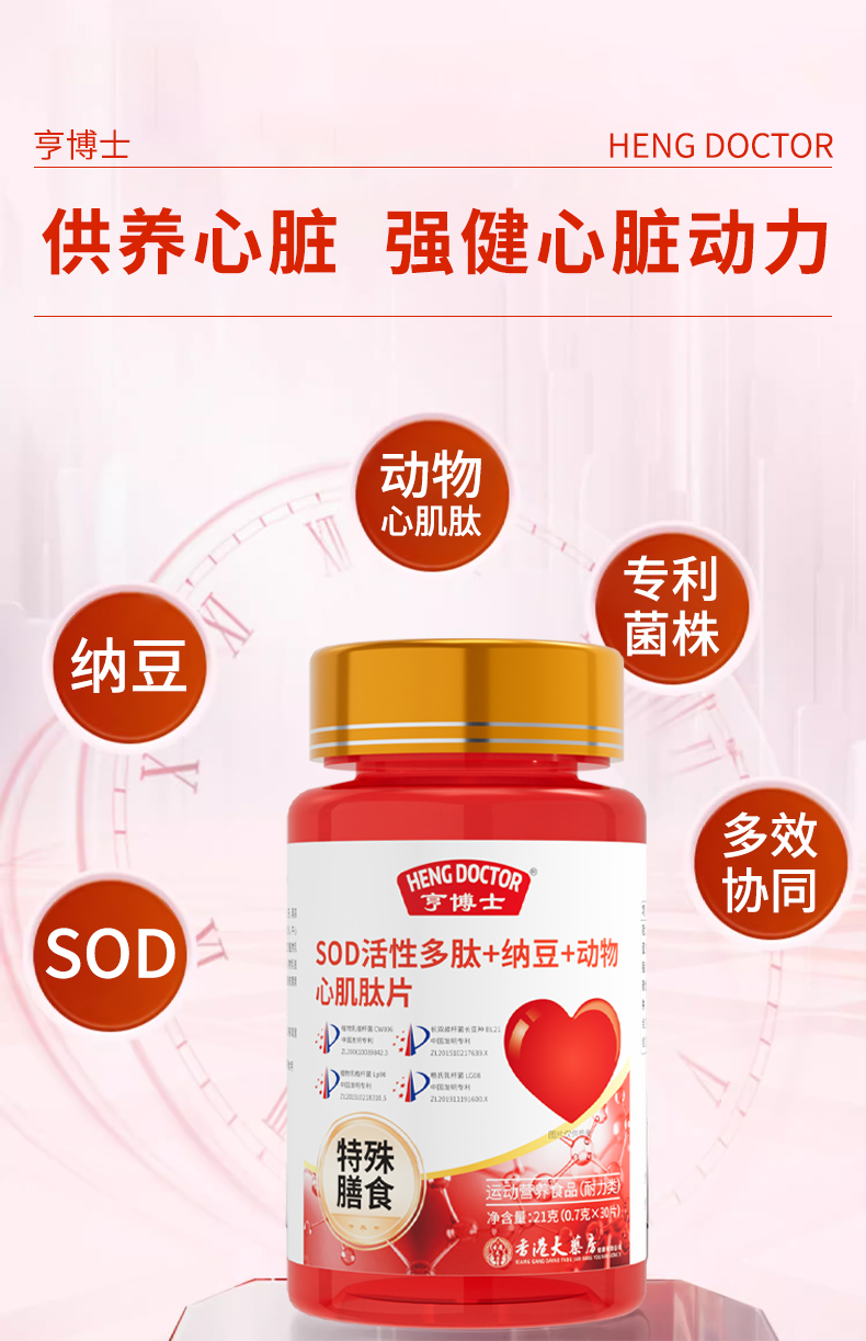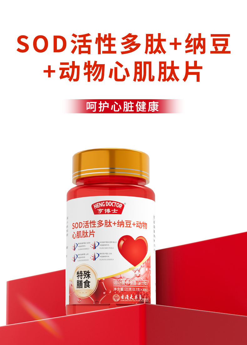 亨博士 SOD活性多肽+纳豆+动物心肌肽片 运动营养食品 30片/瓶*6瓶/盒