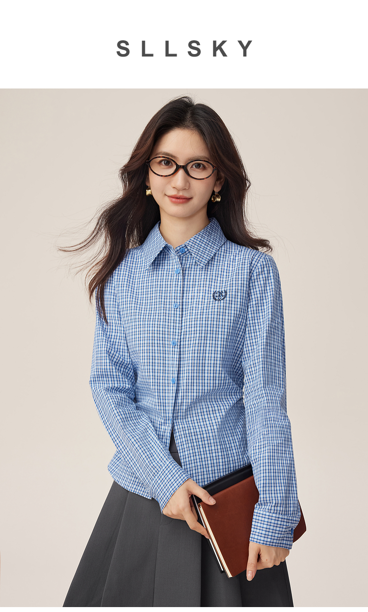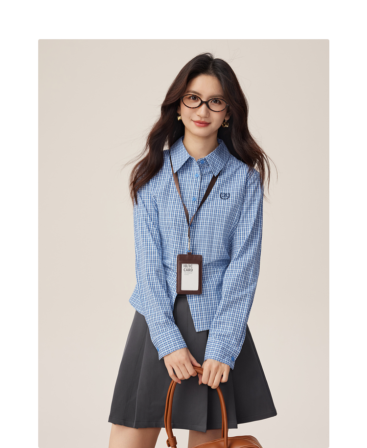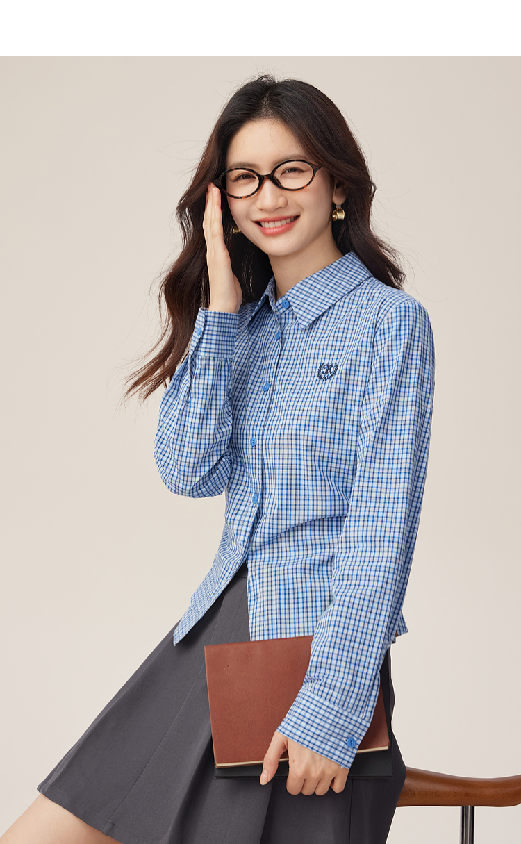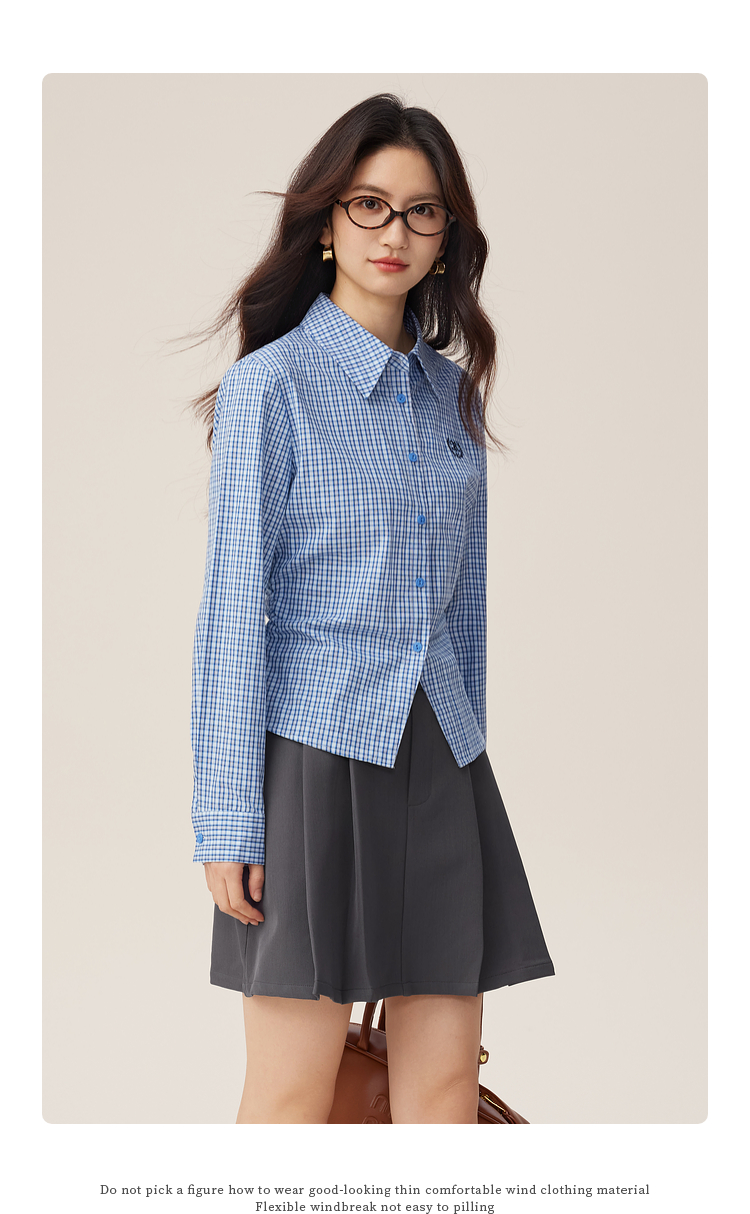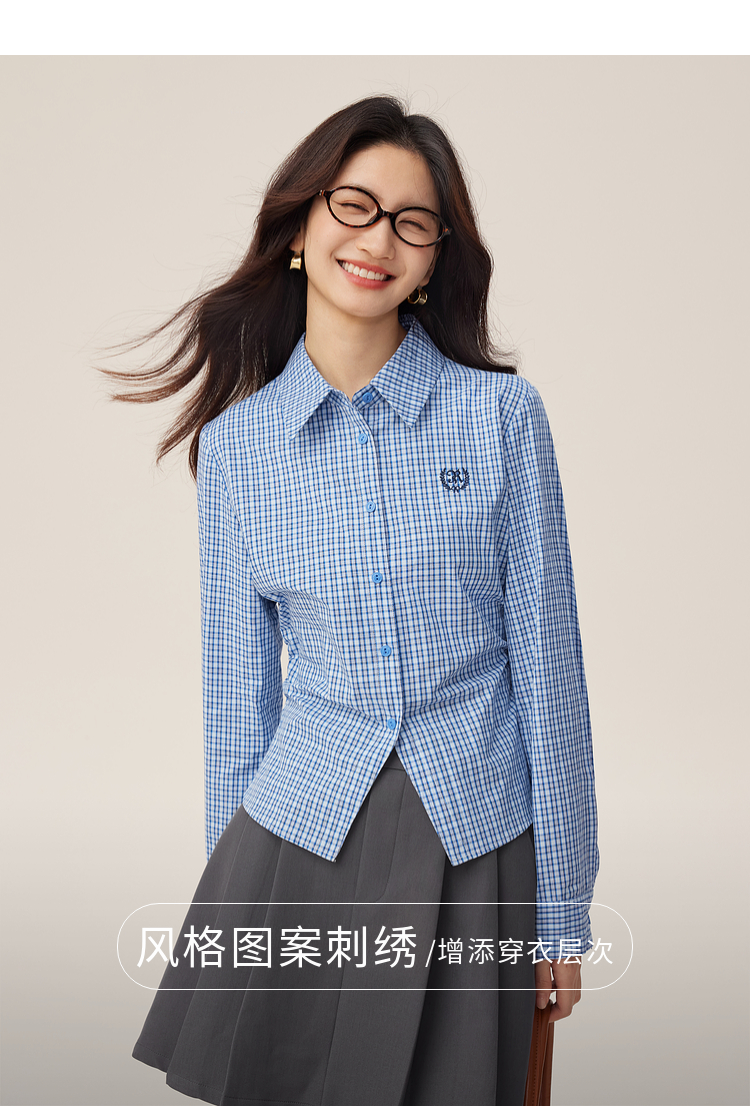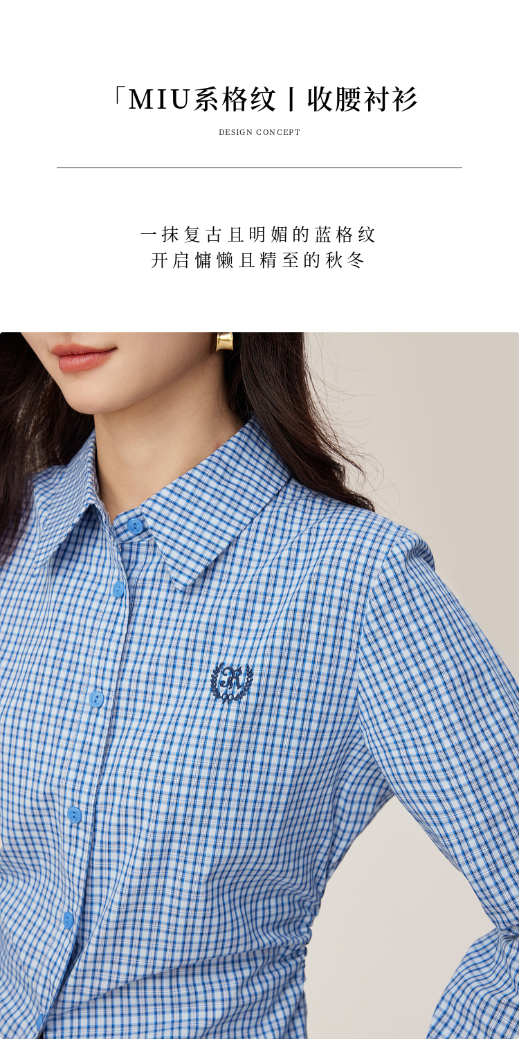 【09/03新品】熙世界【MIU系】蓝色格纹衬衫女收腰显瘦长袖衬衣上衣2025秋新款